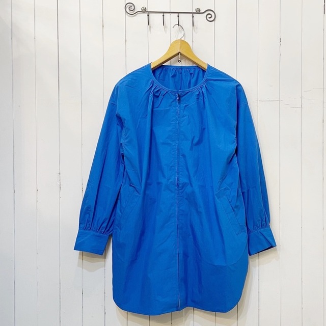 ハリやコットンナイロン素材を使用したZIPジャケット。 襟元や袖口のギャザーを施したチュニック丈。 羽織りアイテムで薄手なので一枚でシャツとしても着ていただけます。 ●素材 綿80% ナイロン20% ●カラー ブラック ブルー イエロー ●サイズ F 身幅57㎝ 着丈82㎝ 肩幅56㎝ 袖丈47㎝