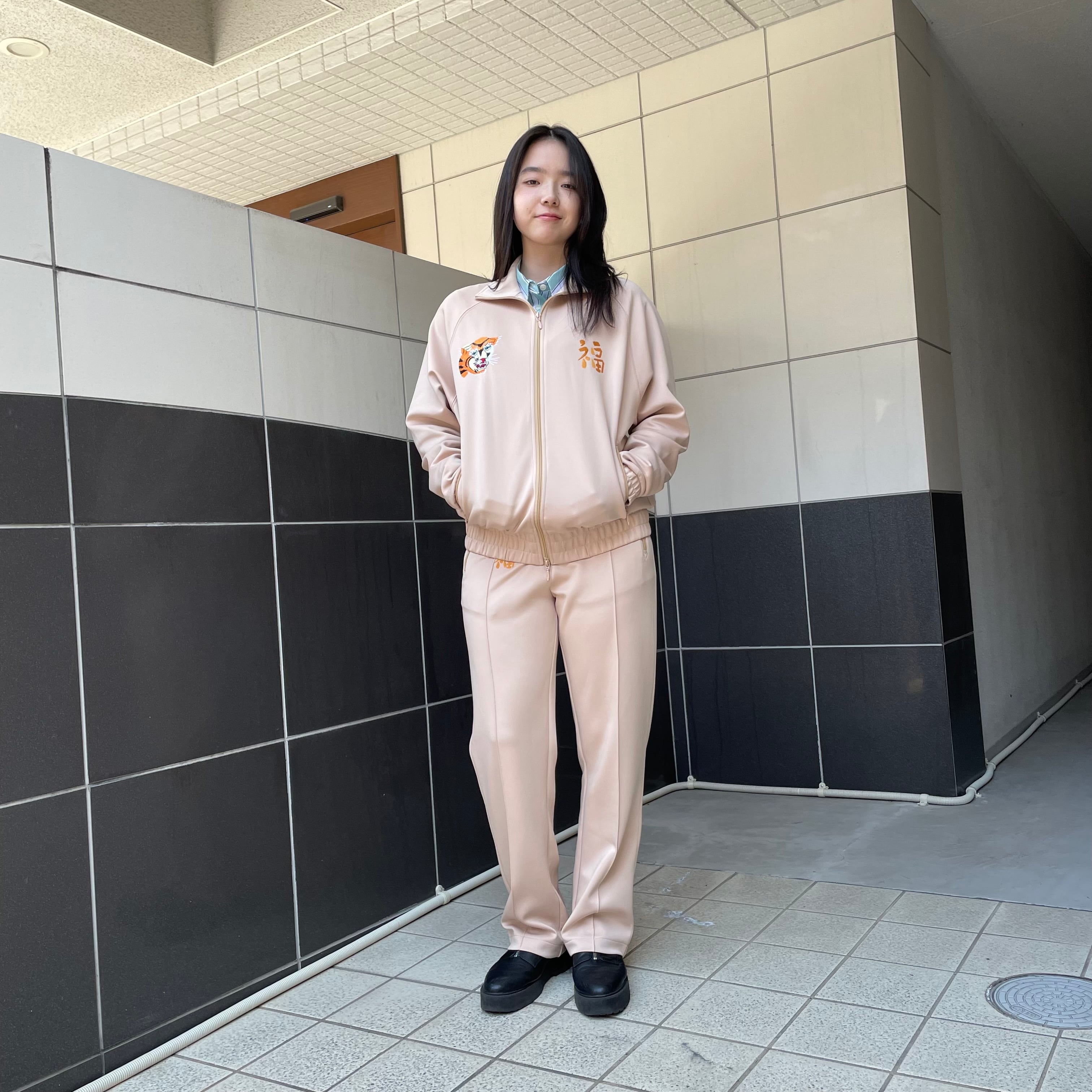 スーベニアジャケットでよく見られるトラの刺繍を胸と背中に刺繍したインパクト大のジャージです。細身でスッキリとしたシルエットなので、野暮ったくならずスタイリッシュなトラックジャージです。