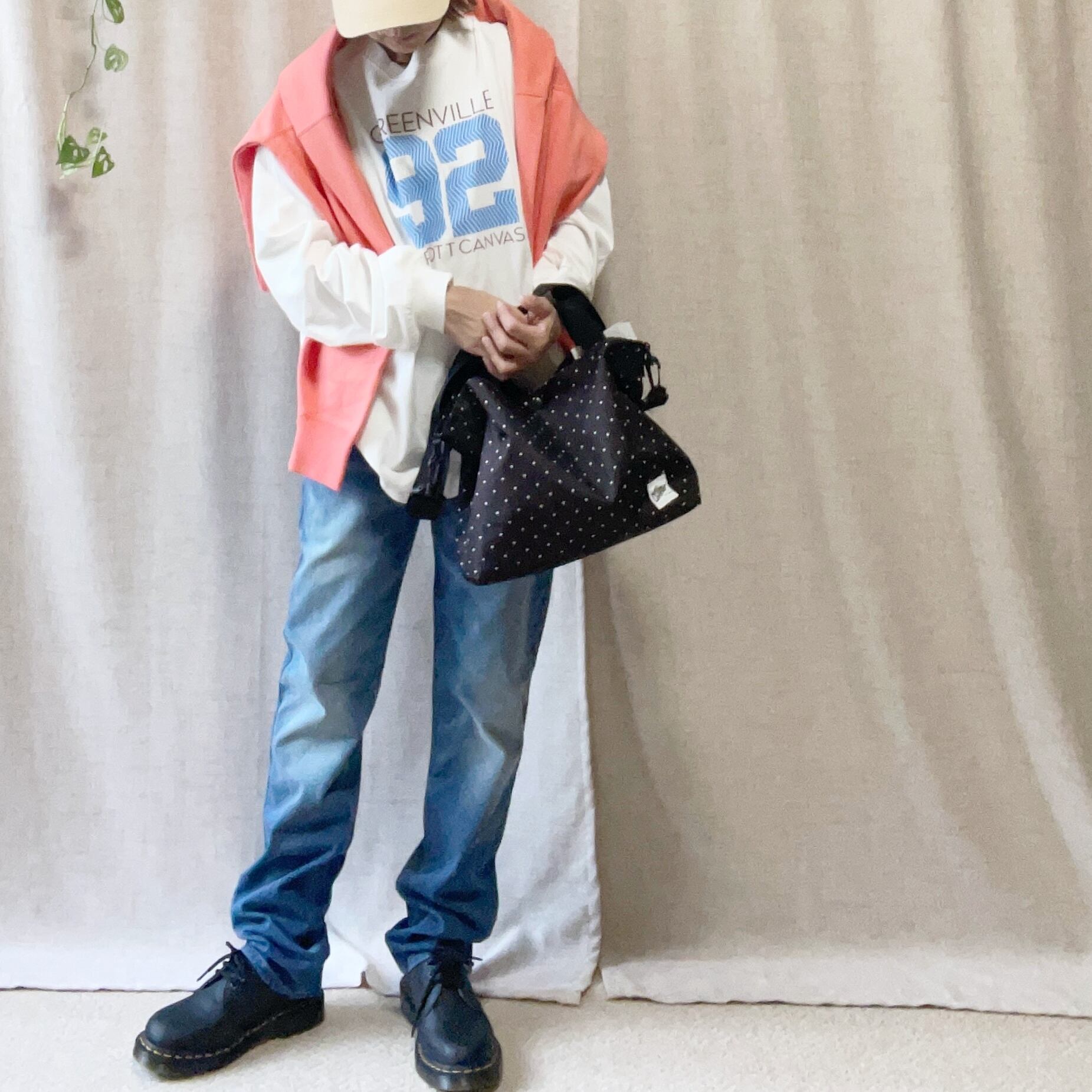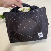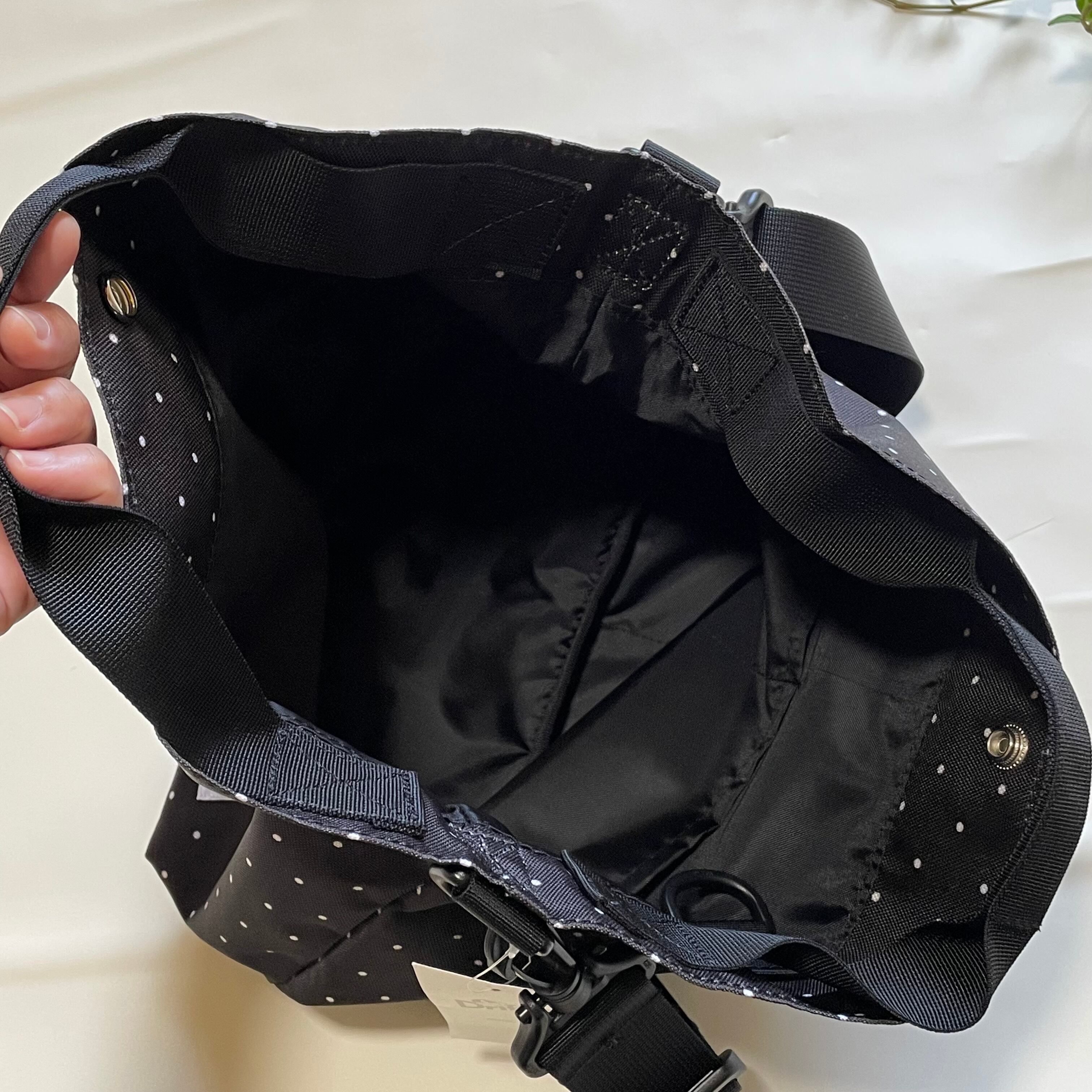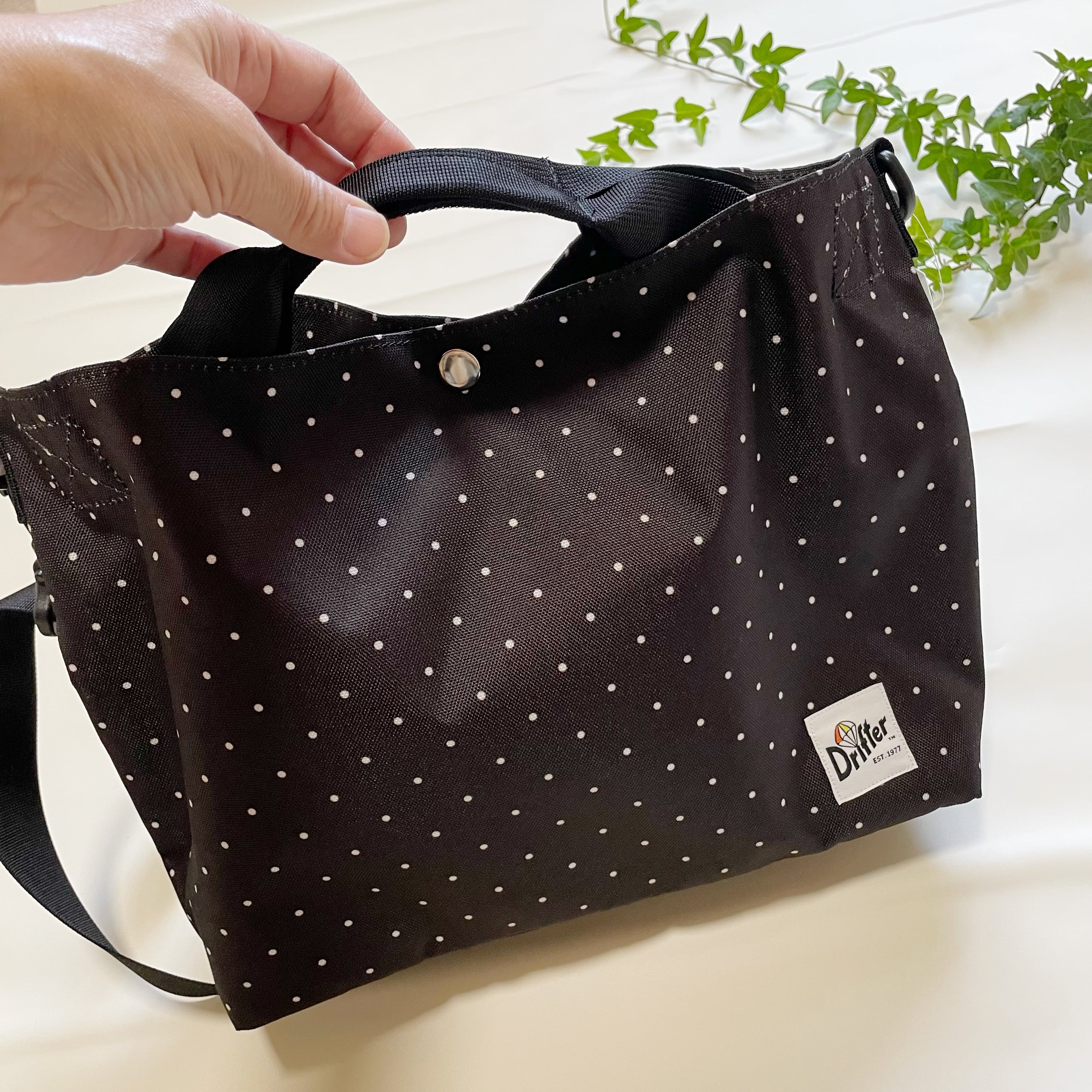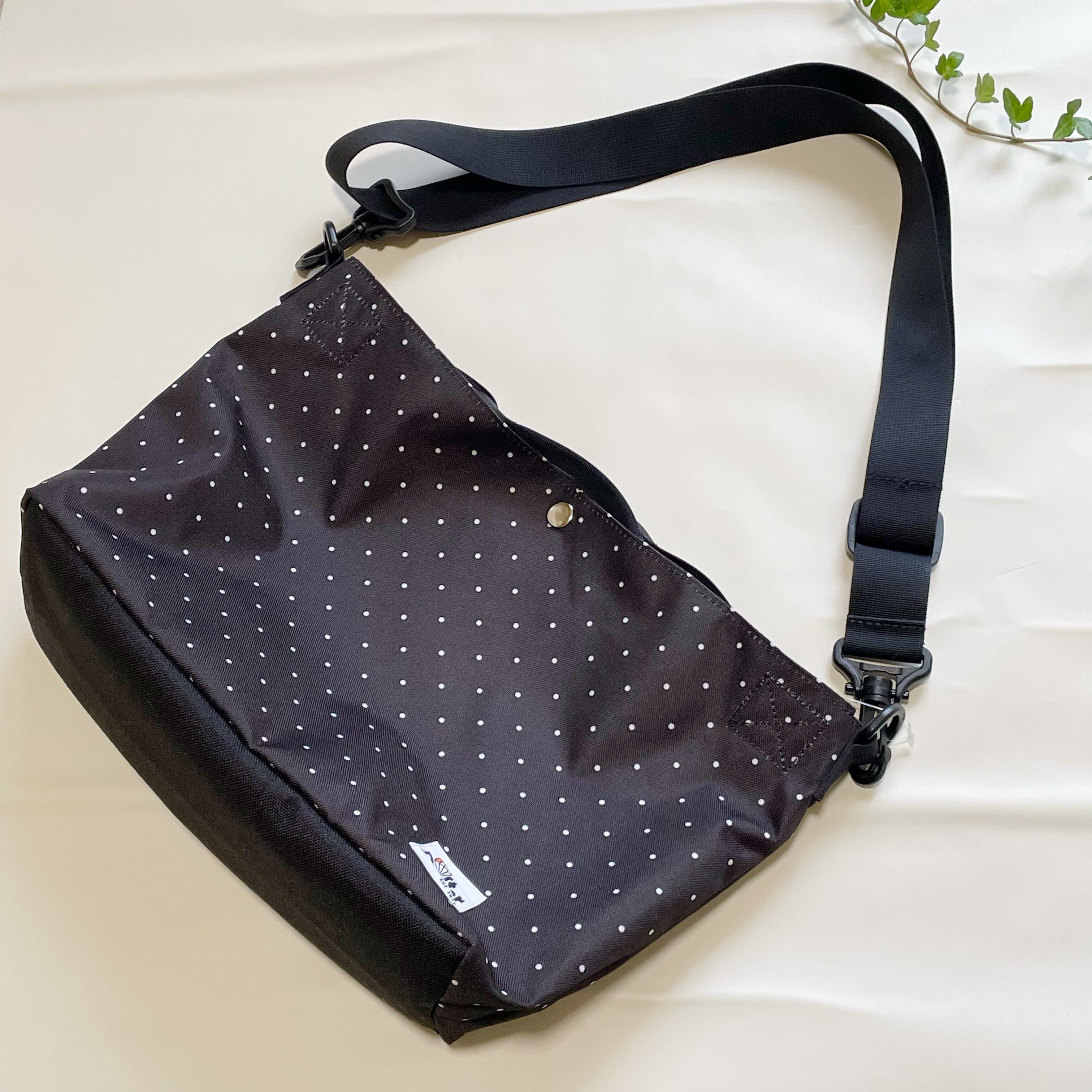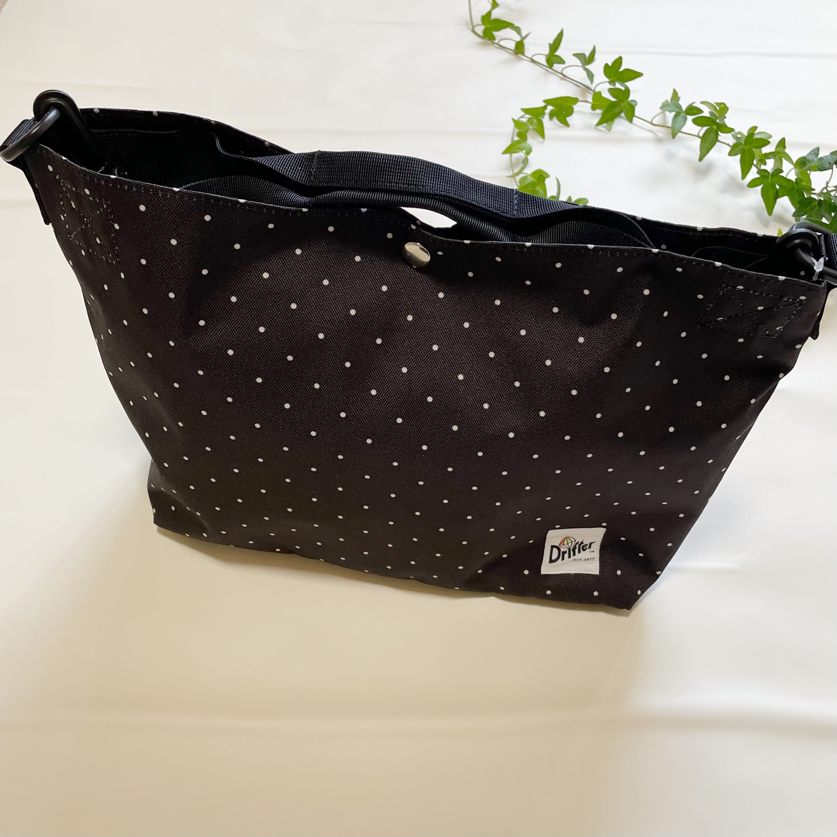 ハンドルと取り外し可能なショルダーストラップが付属した2Wayのショルダートートバッグ。負荷のかかりやすいボトム部分はコーデュラナイロン素材を採用、天面はスナップボタン開閉式。また内側にはスマホ等の収納に便利なオープンポケットが二カ所、プラスチック製のDリングは鍵等の貴重品の取り付け箇所としても機能します。