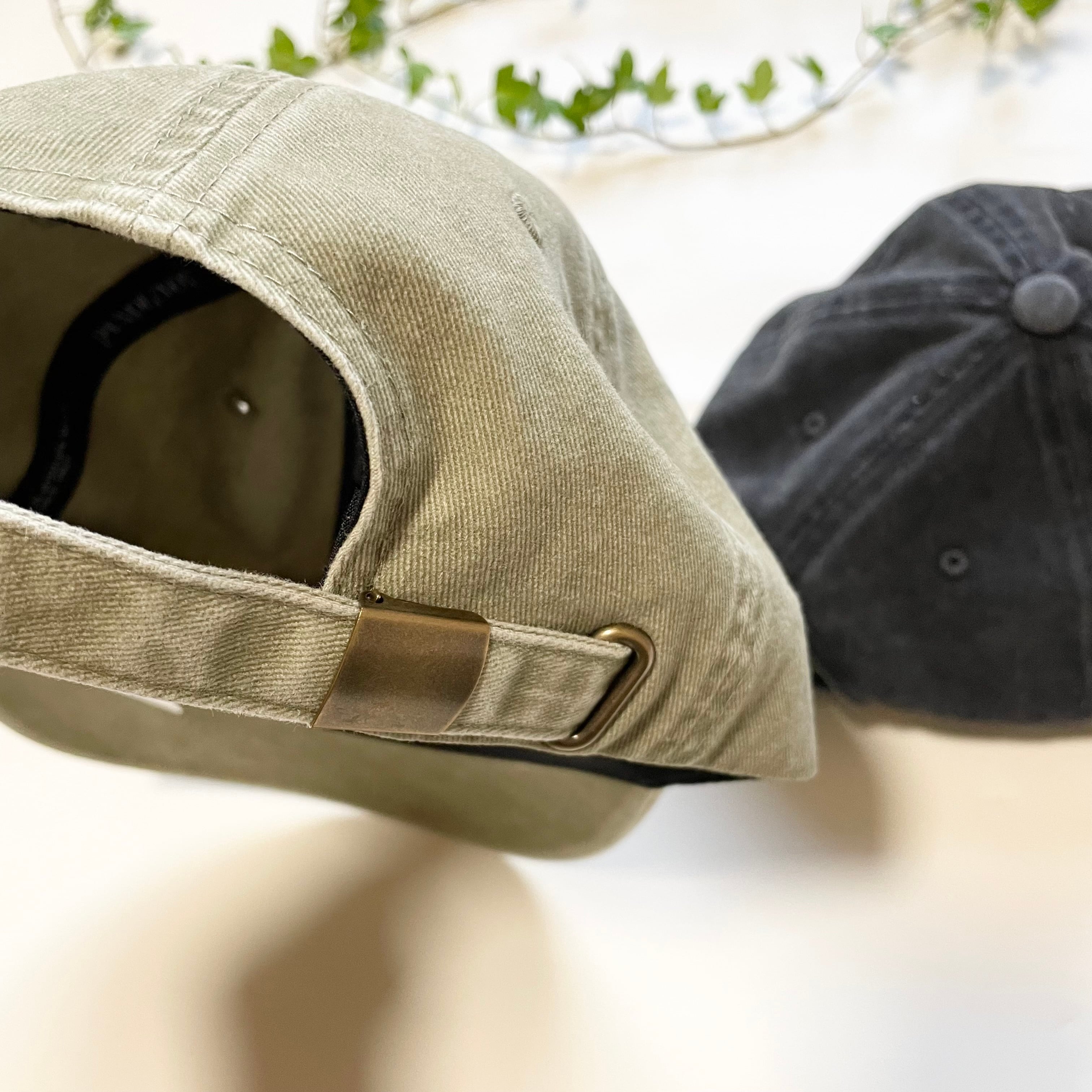 ピグメント加工でフェード感を表現したロゴキャップ。