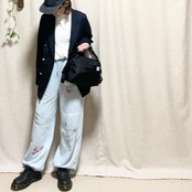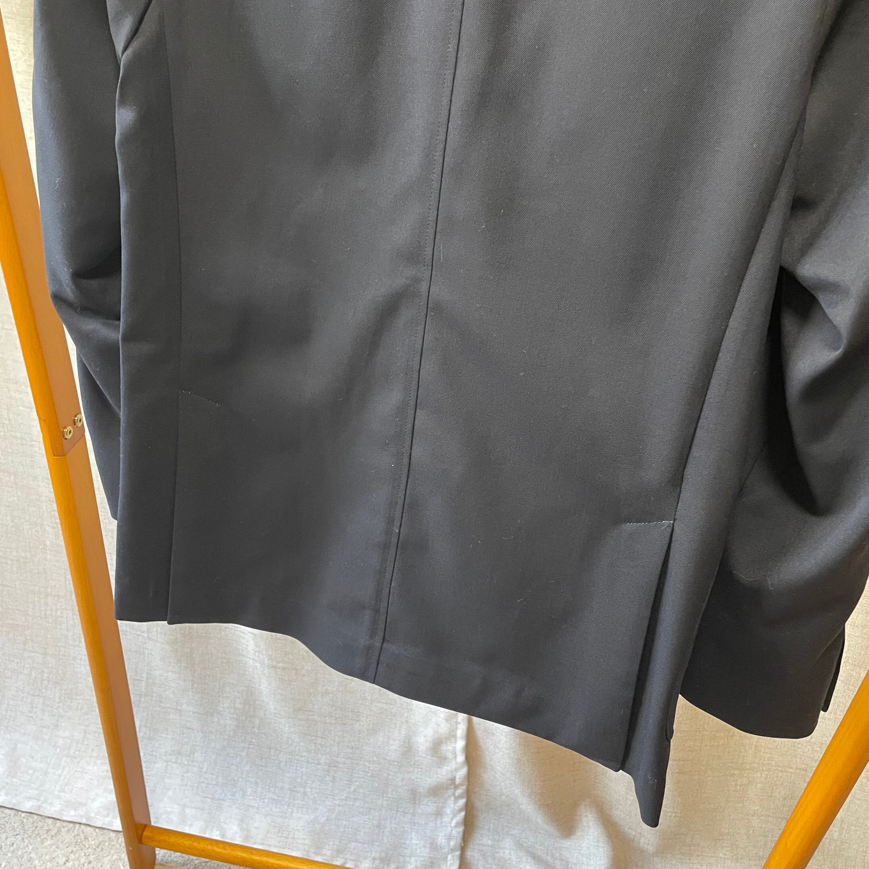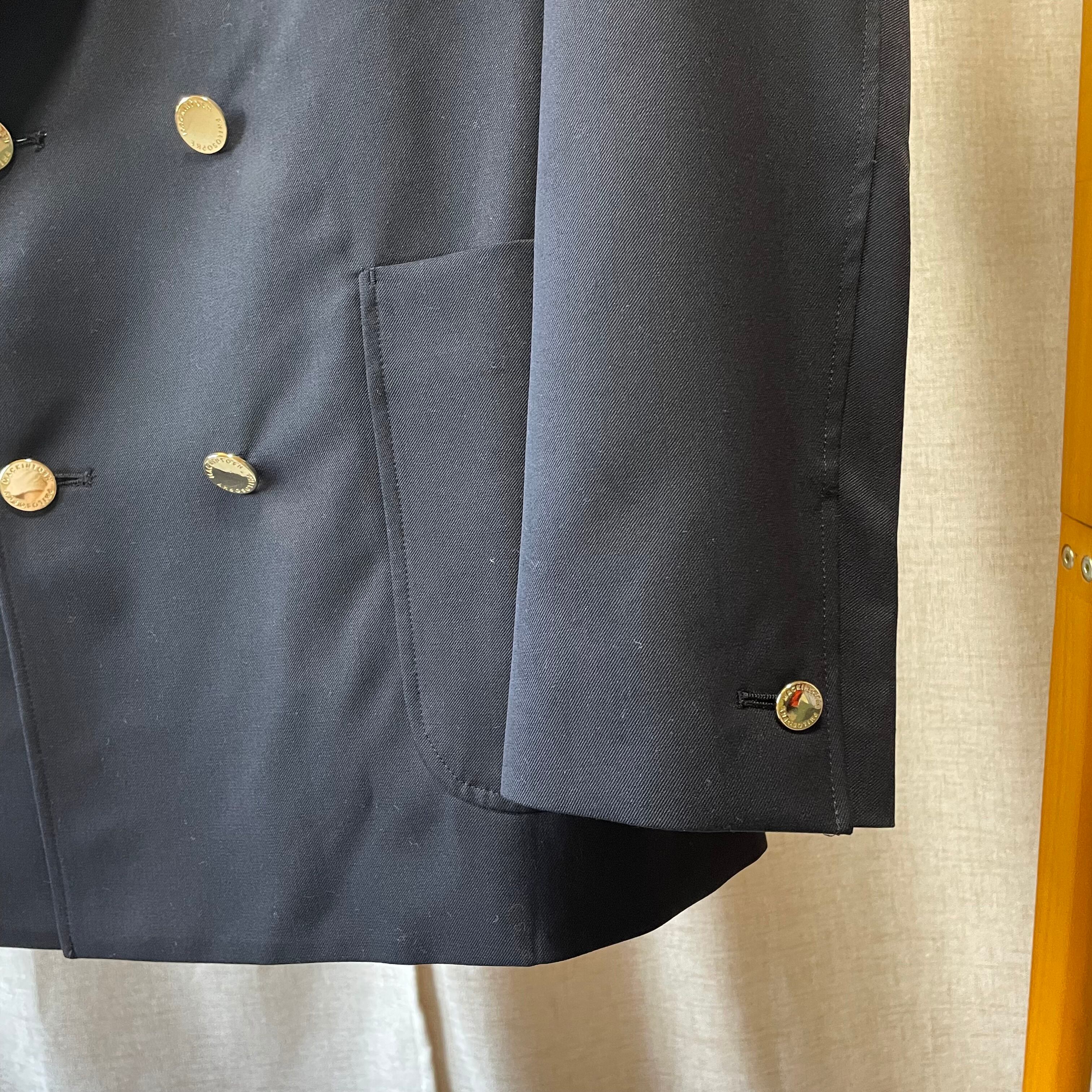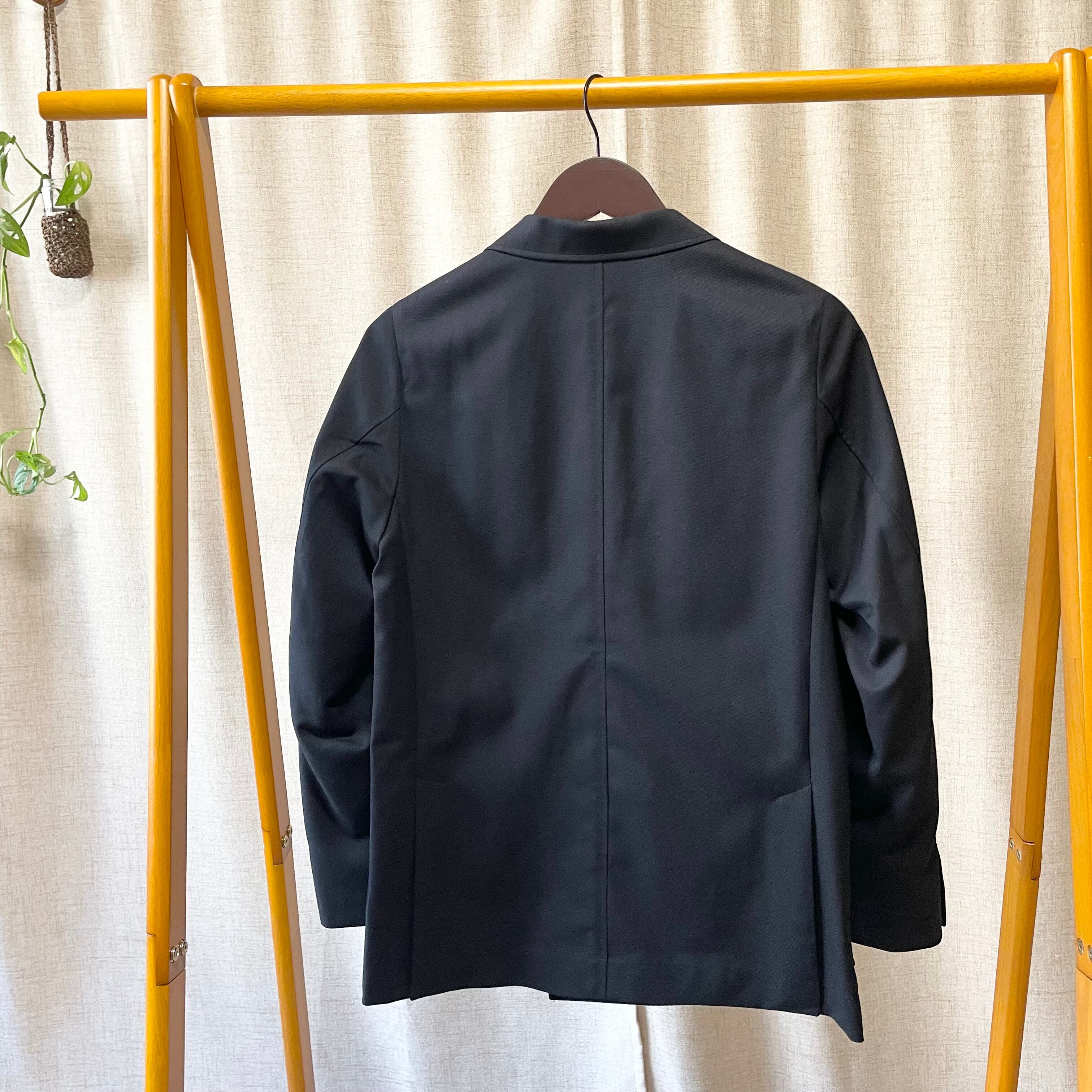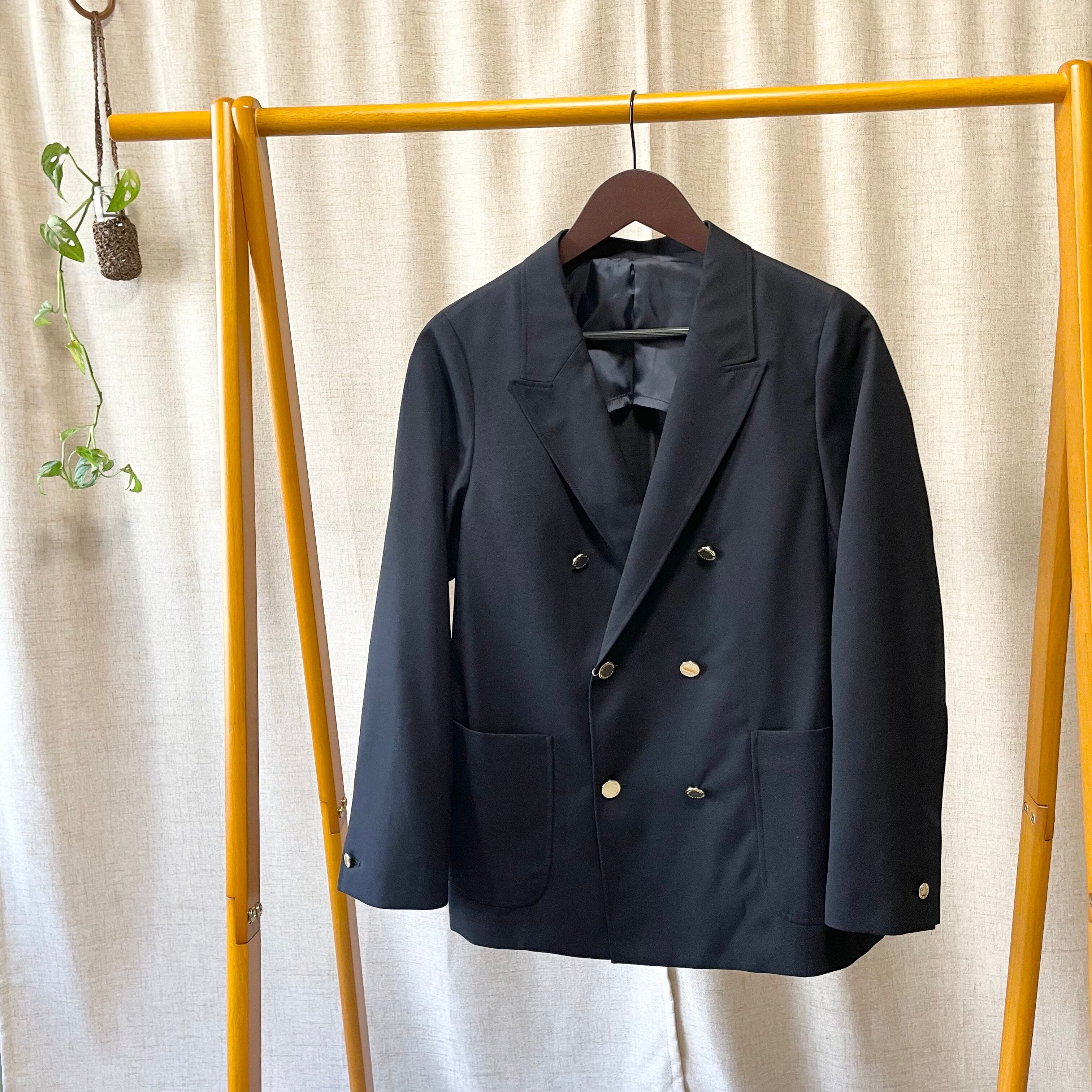 ピークドラペルのダブルブレストブレザー。きちんと感はありつつも、Tシャツなどに合わせてカジュアルにもハマるブレザーとなっています。フロントの打ち合いを少し狭めのダブルブレストにしているので、開けて着るときに重く見えないようなデザインとなっています。