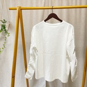天竺生地にピグメント加工を施し、柔らかい肌触りの一着に仕上げました。袖部分には特徴的なシャーリングデザインが施されており、さりげなく華やかさをプラス。ゆったりとしたサイズ感で、リラックスした着心地です。