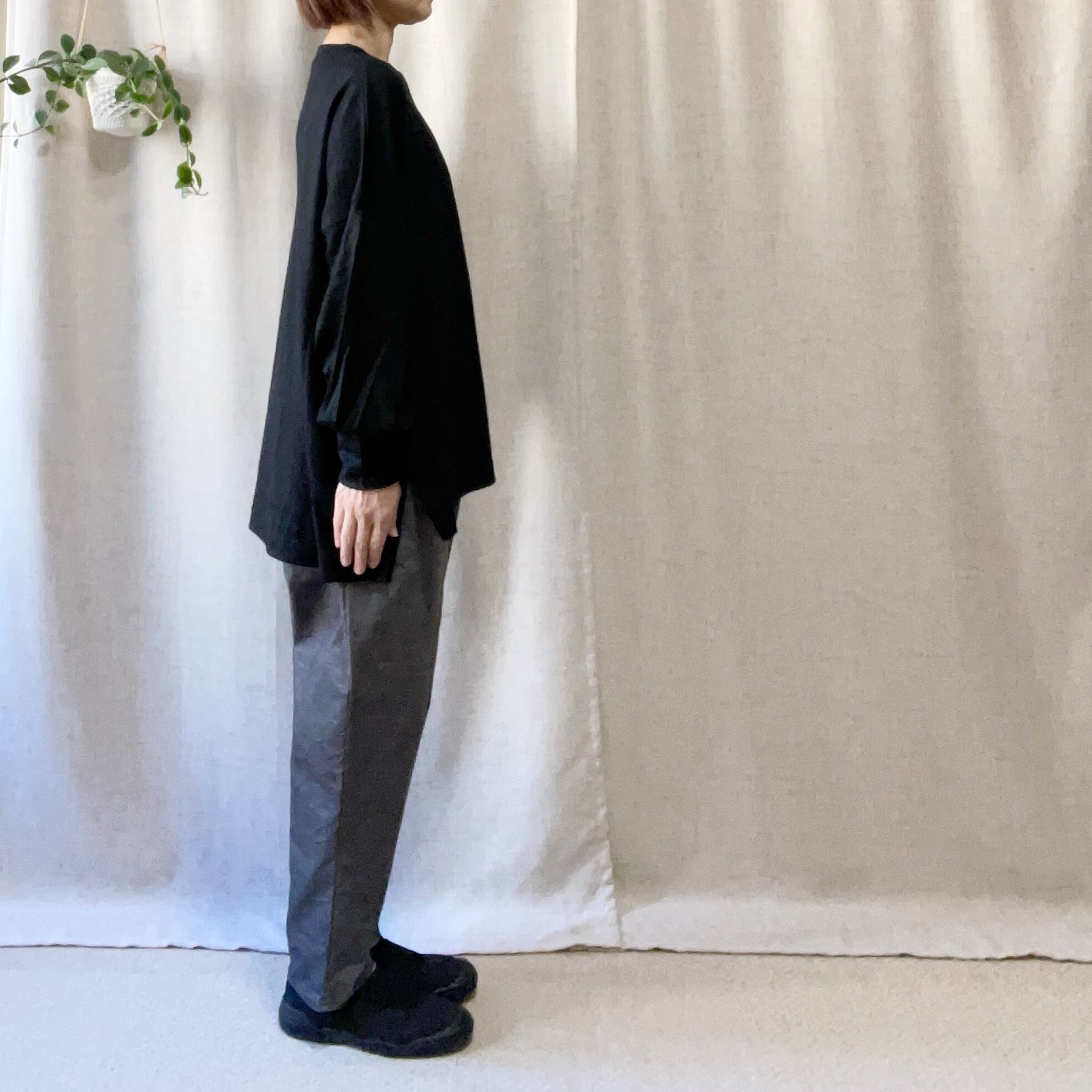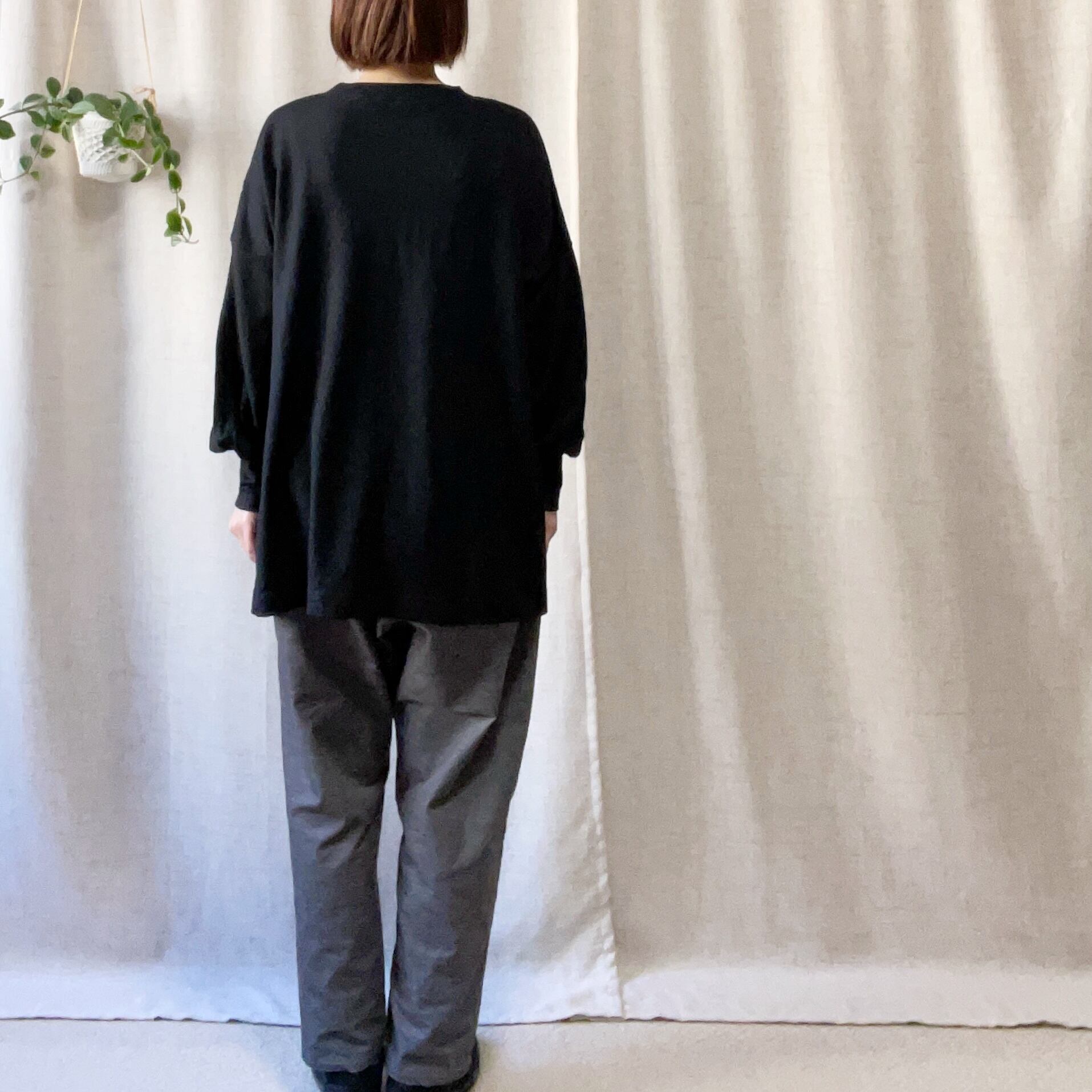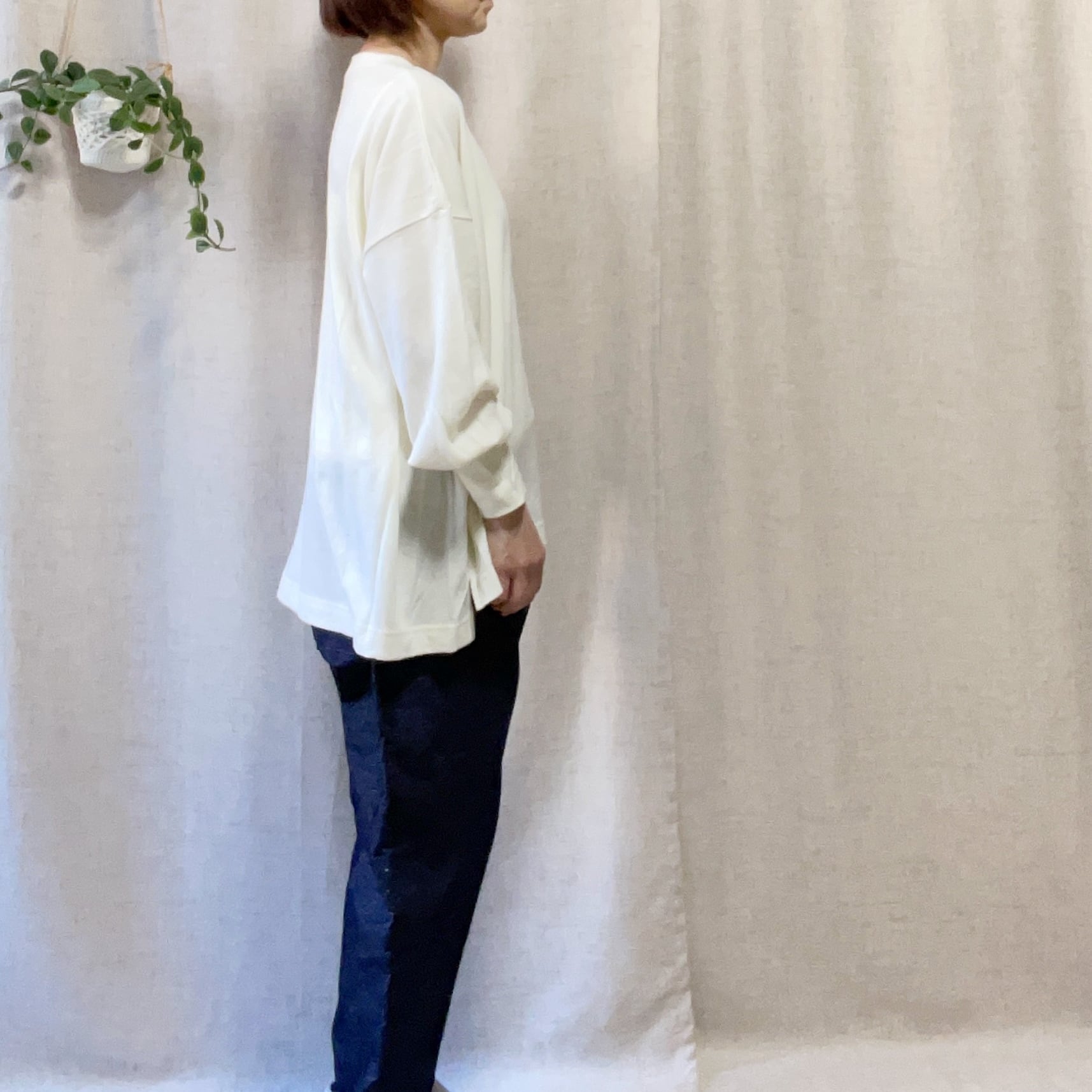 ドロップショルダーで全体的にゆとりがありながら、落ち感がありきれいなシルエットです。