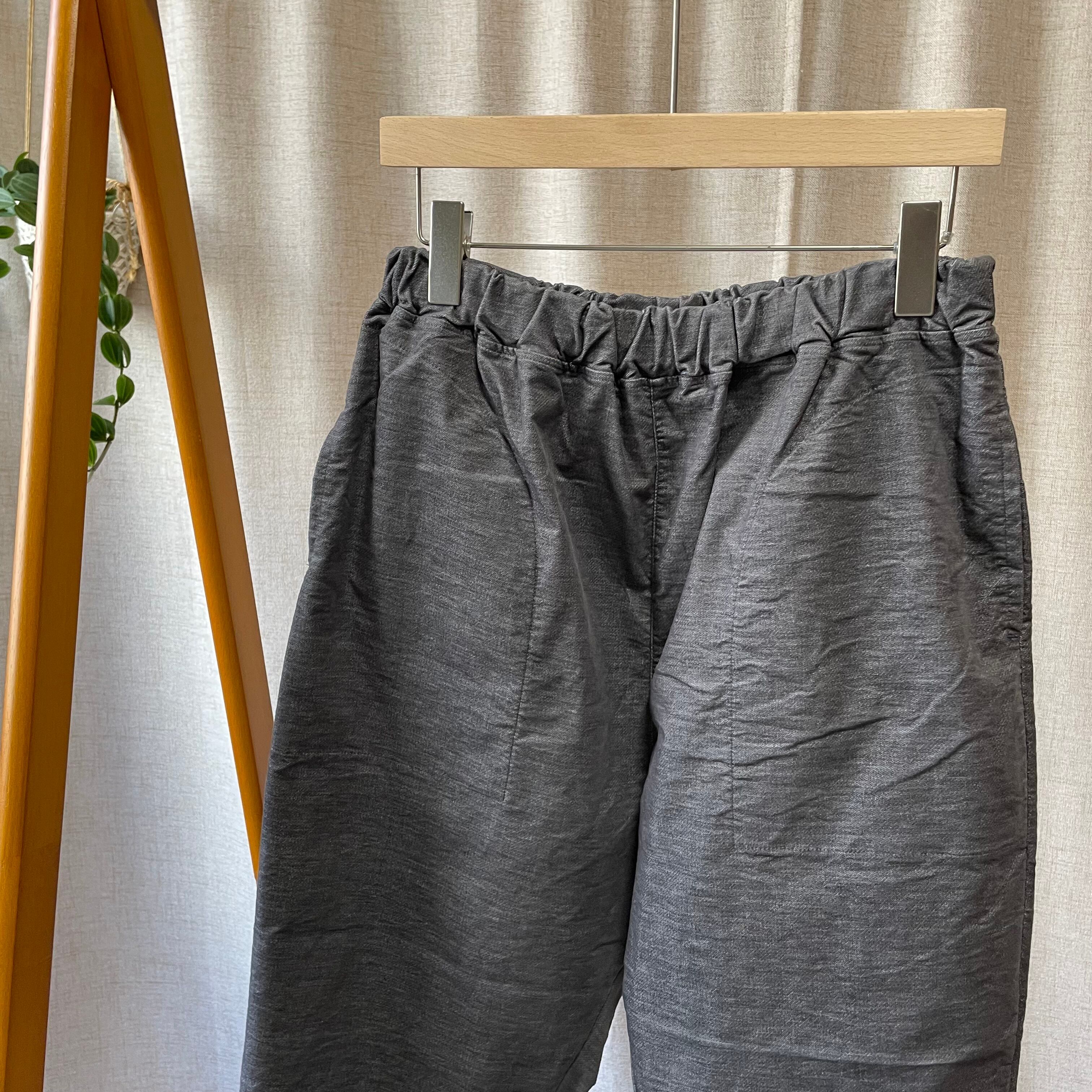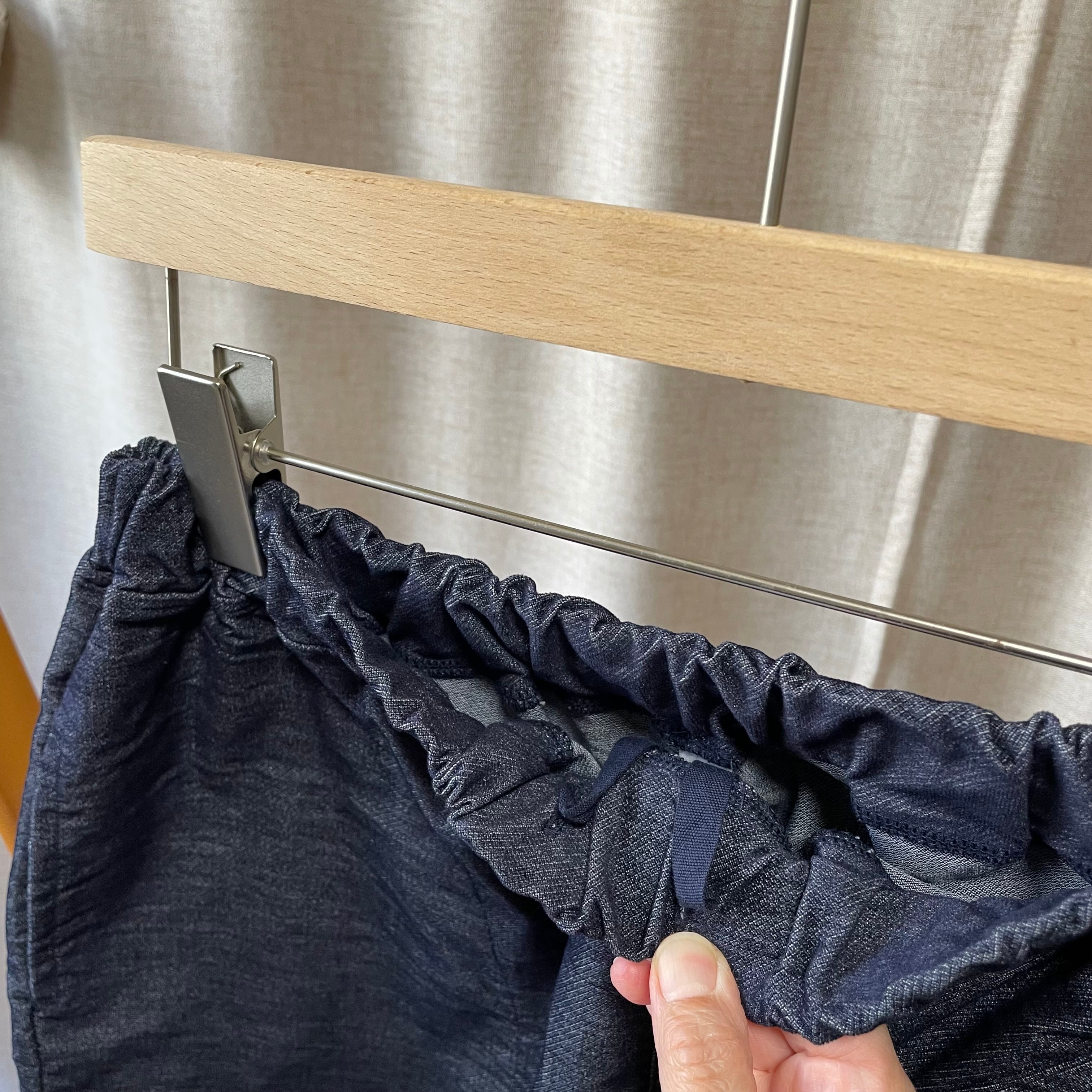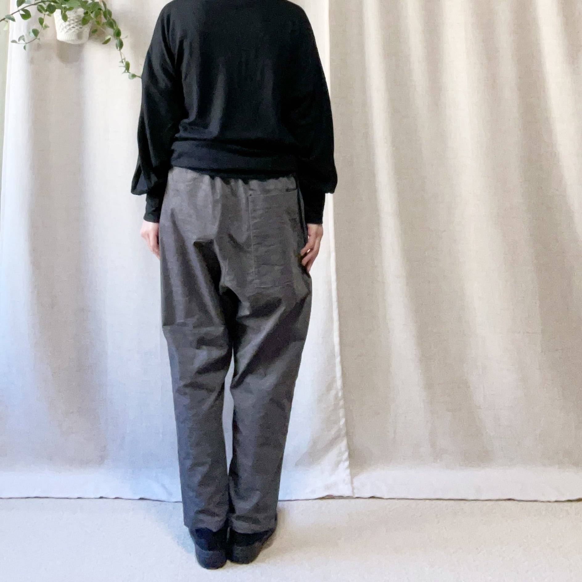 裾にかけてテーパードがかかりバランスの取りやすいシルエットです。ウエストはゴムとひもで調節できます。