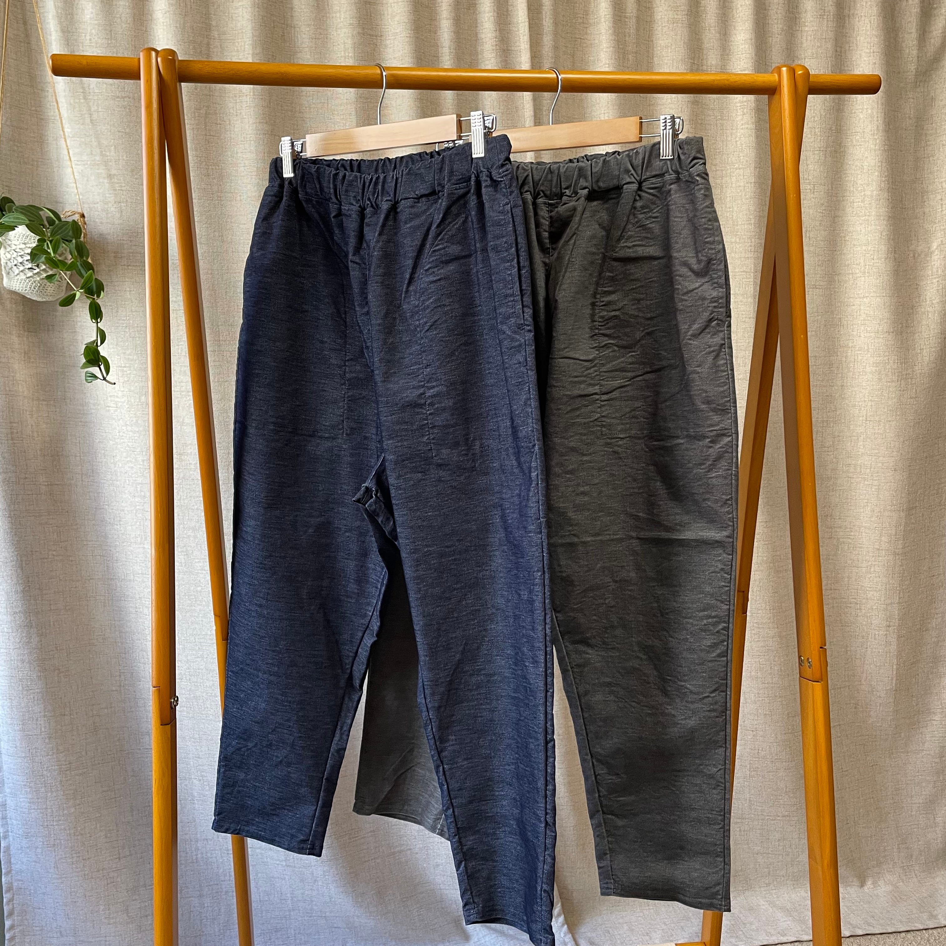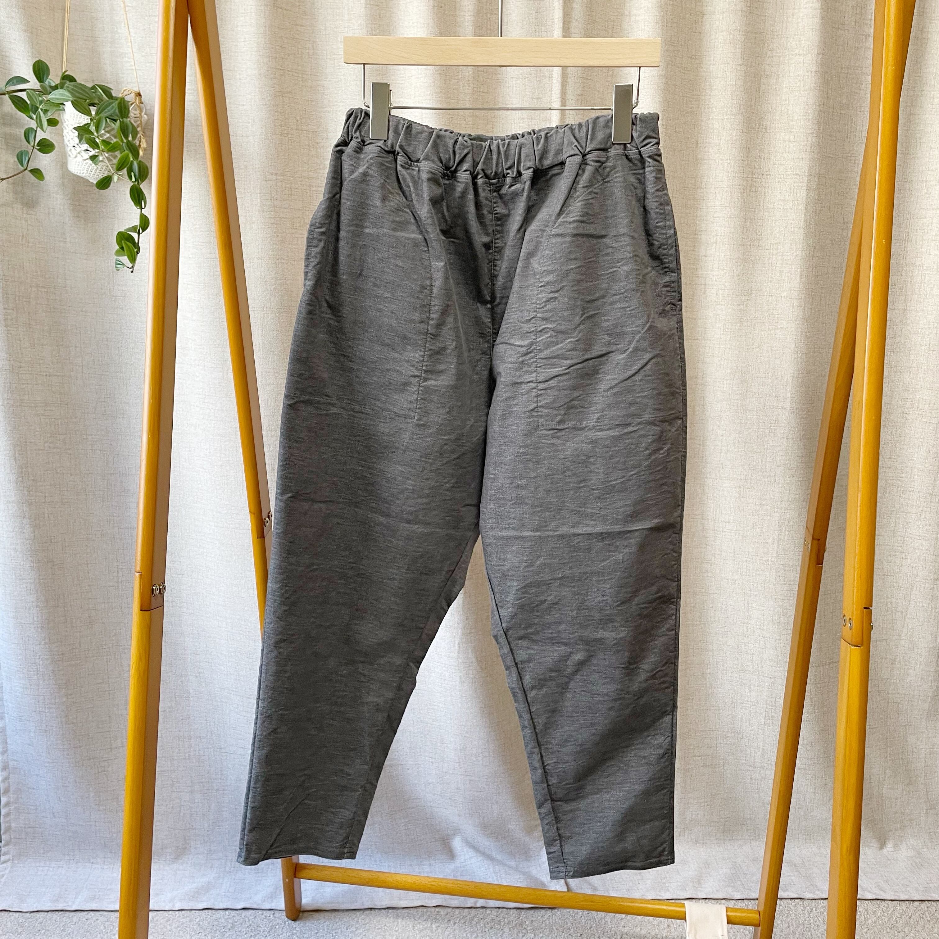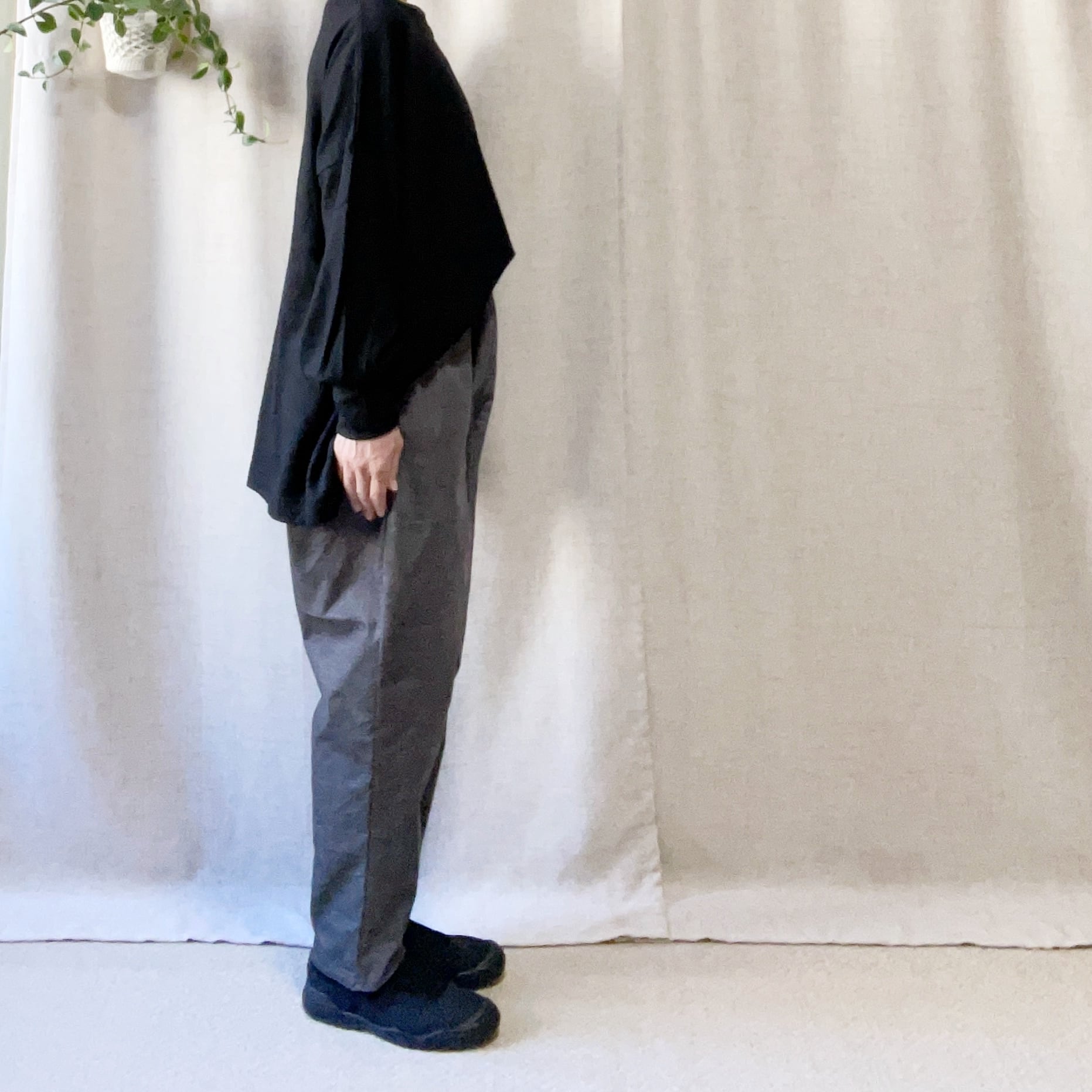 裾にかけてテーパードがかかりバランスの取りやすいシルエットです。ウエストはゴムとひもで調節できます。