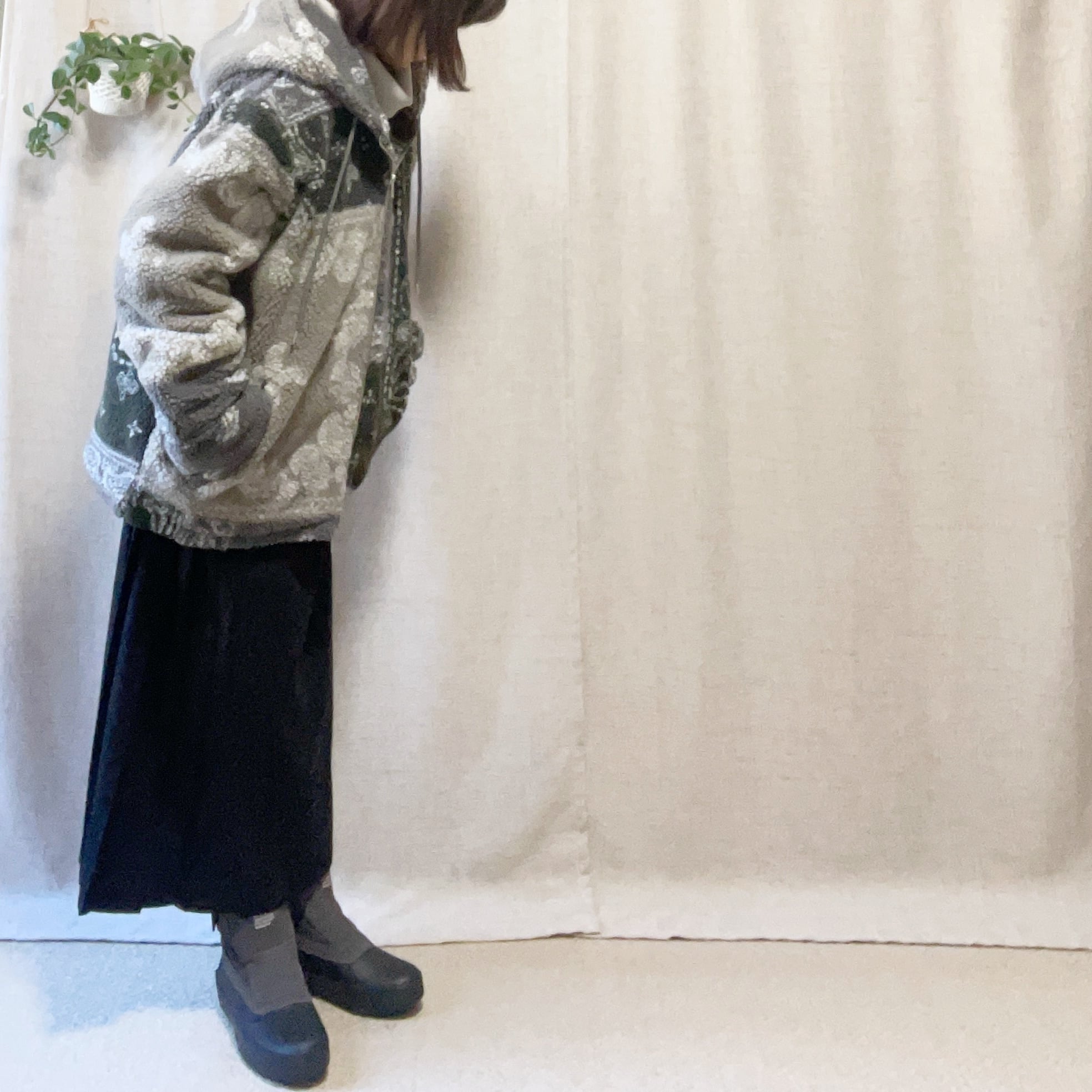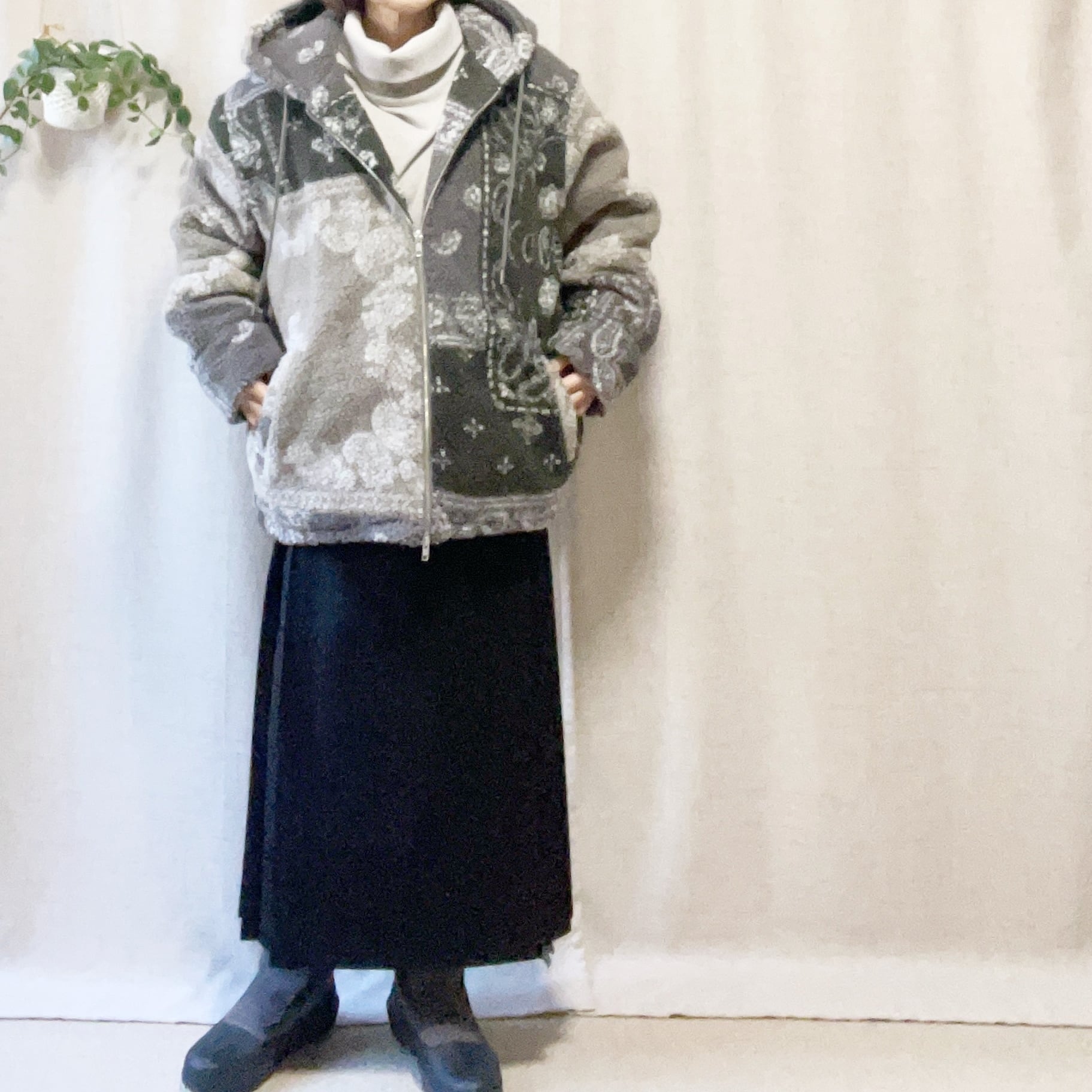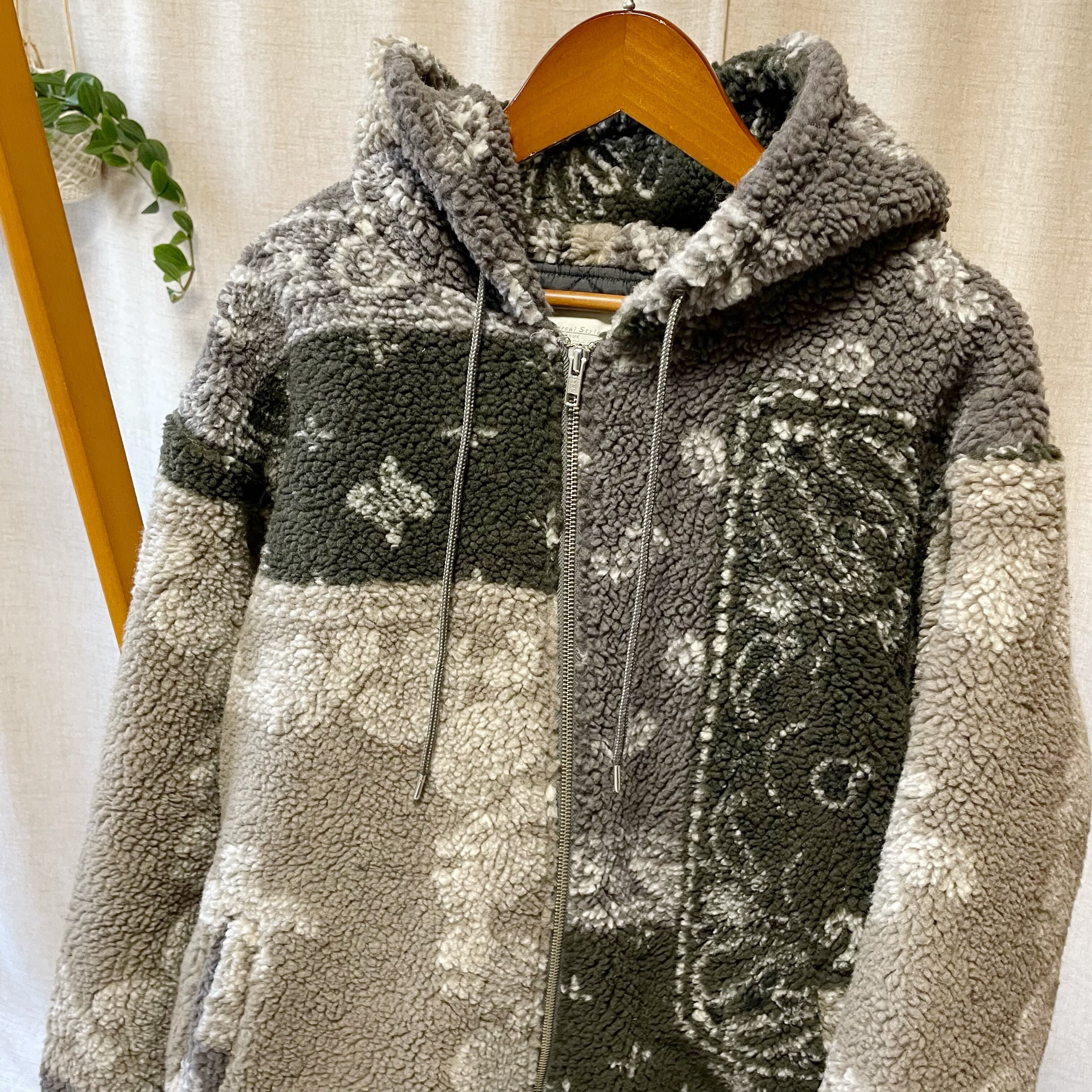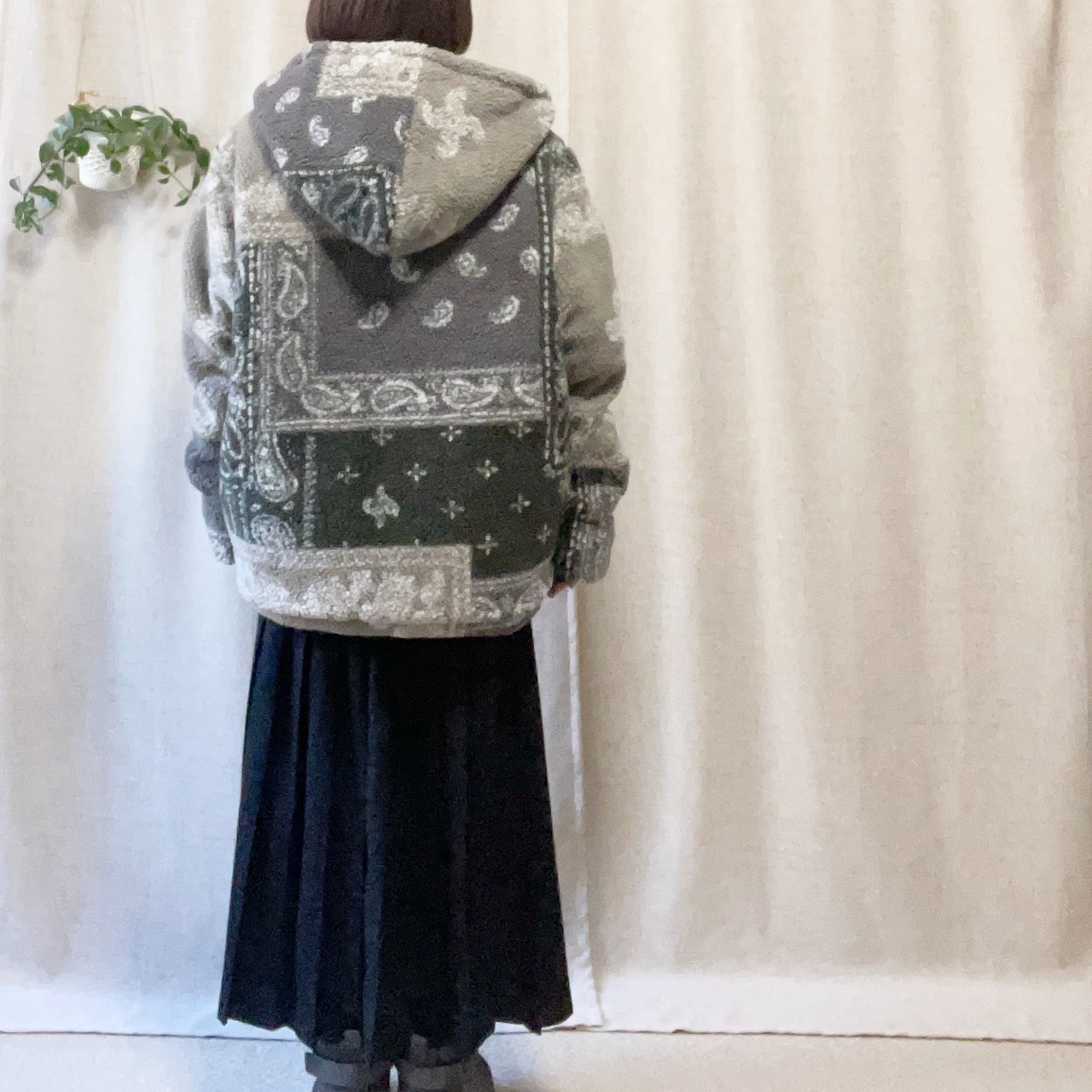 最大の特徴は3色のバンダナをまるでパッチワークのようにジャガードしたオリジナルのボア生地です。暗くなりがちな秋冬のスタイリングにバッチリ映えるボアアウターです。
