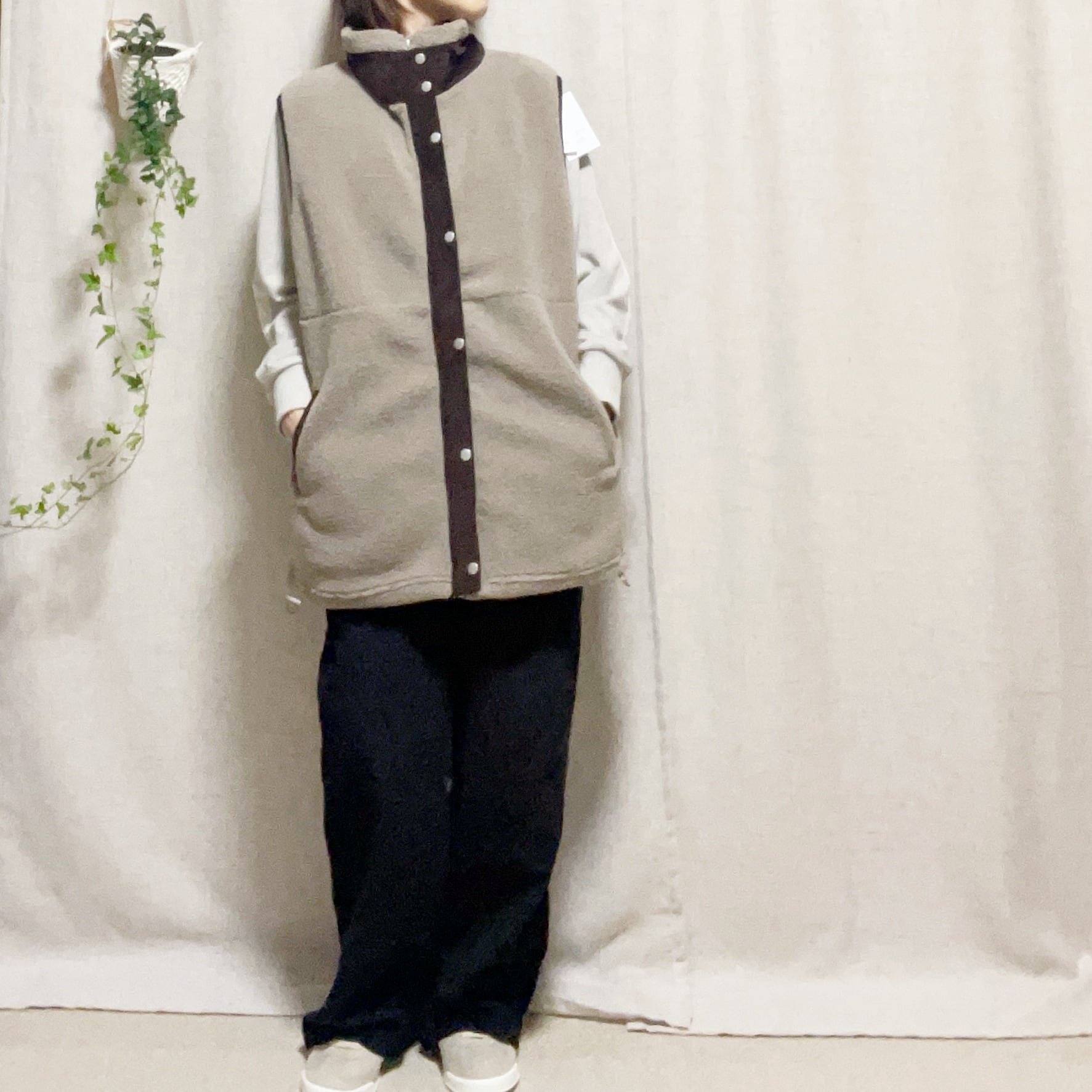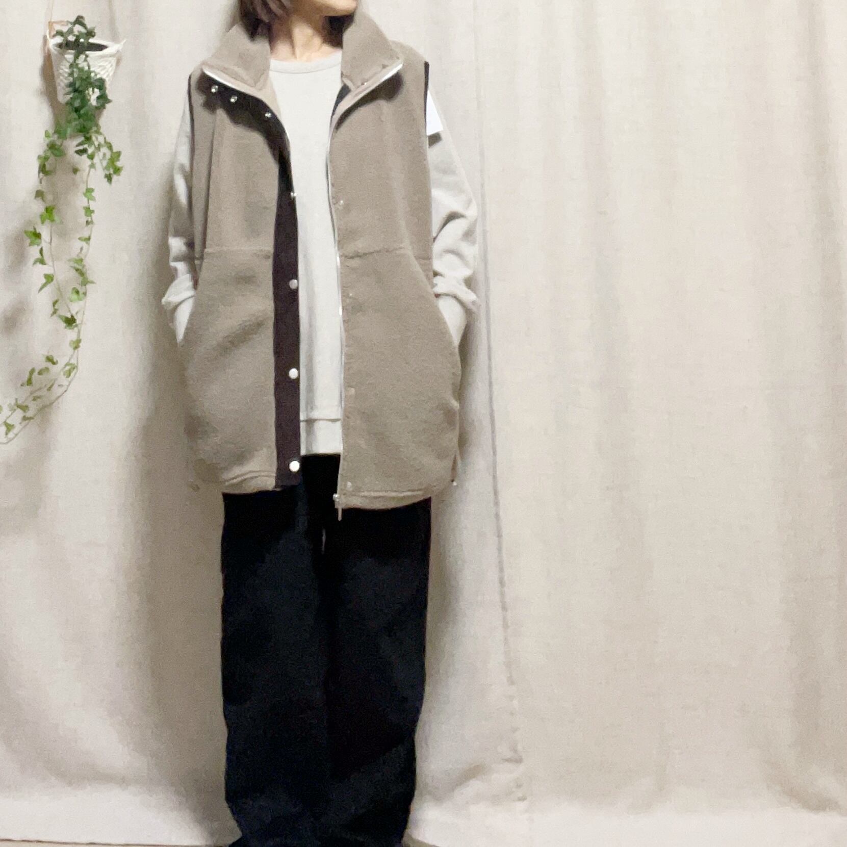 少しオーバーサイズで肩落ちシルエットが特徴で、ロンTやスウェットトレーナー、モックネックニットやケーブルニットなど様々なトップスと相性抜群!