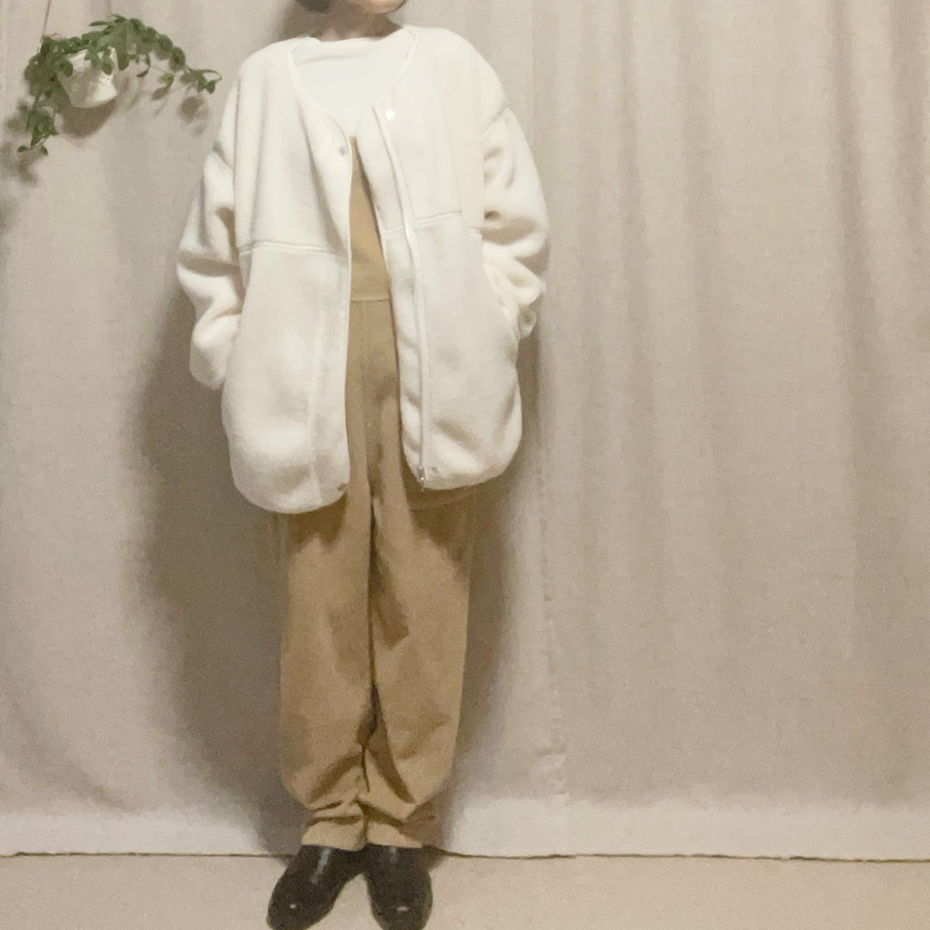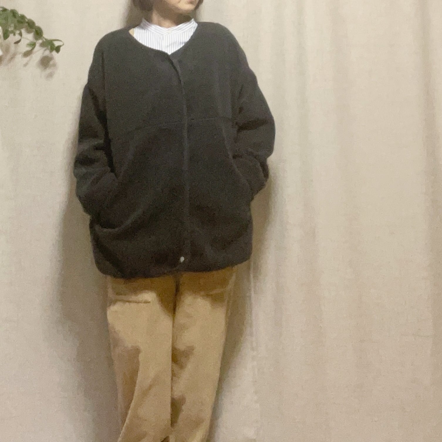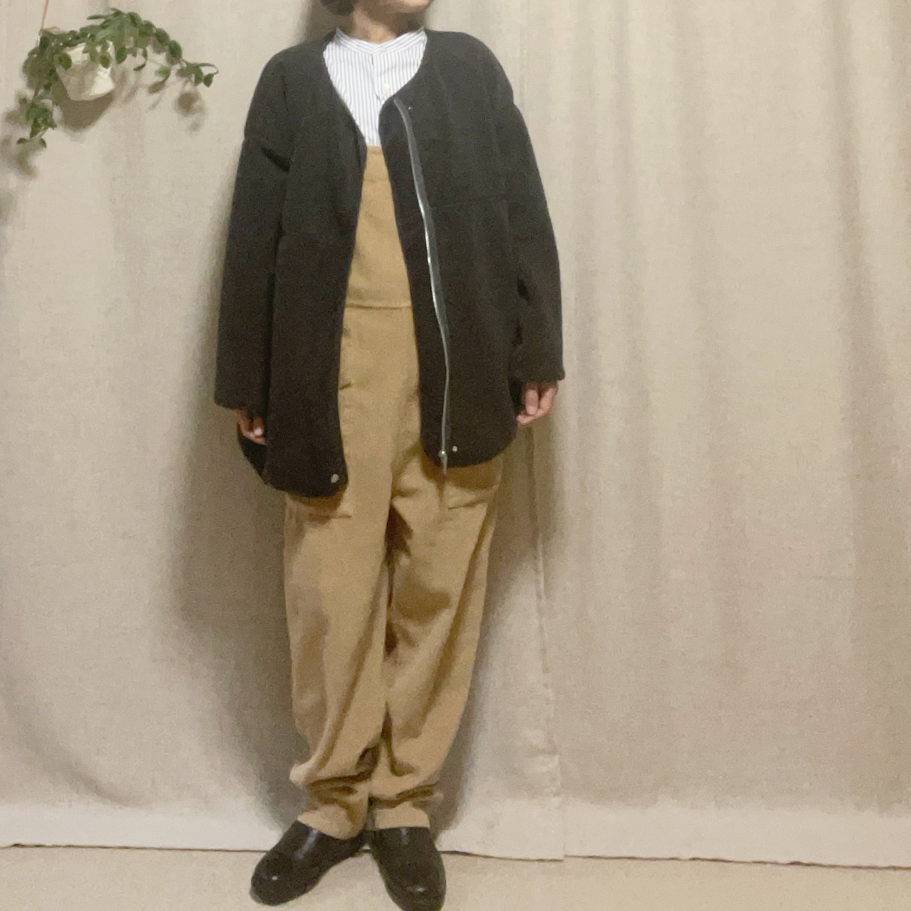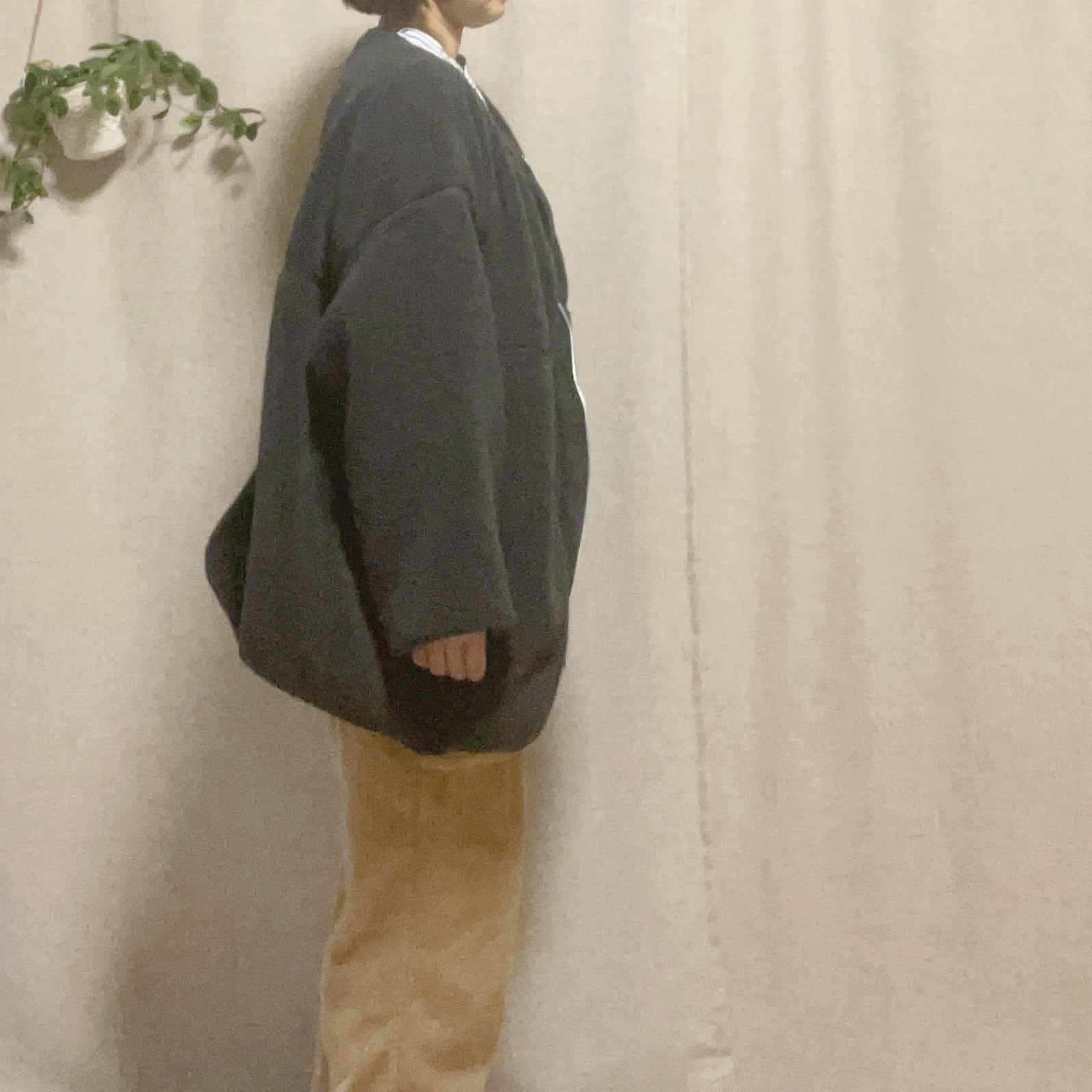 少しオーバーサイズで肩落ちシルエットが特徴で、ロンTやスウェットトレーナー、モックネックニットやケーブルニットなど様々なトップスと相性抜群!