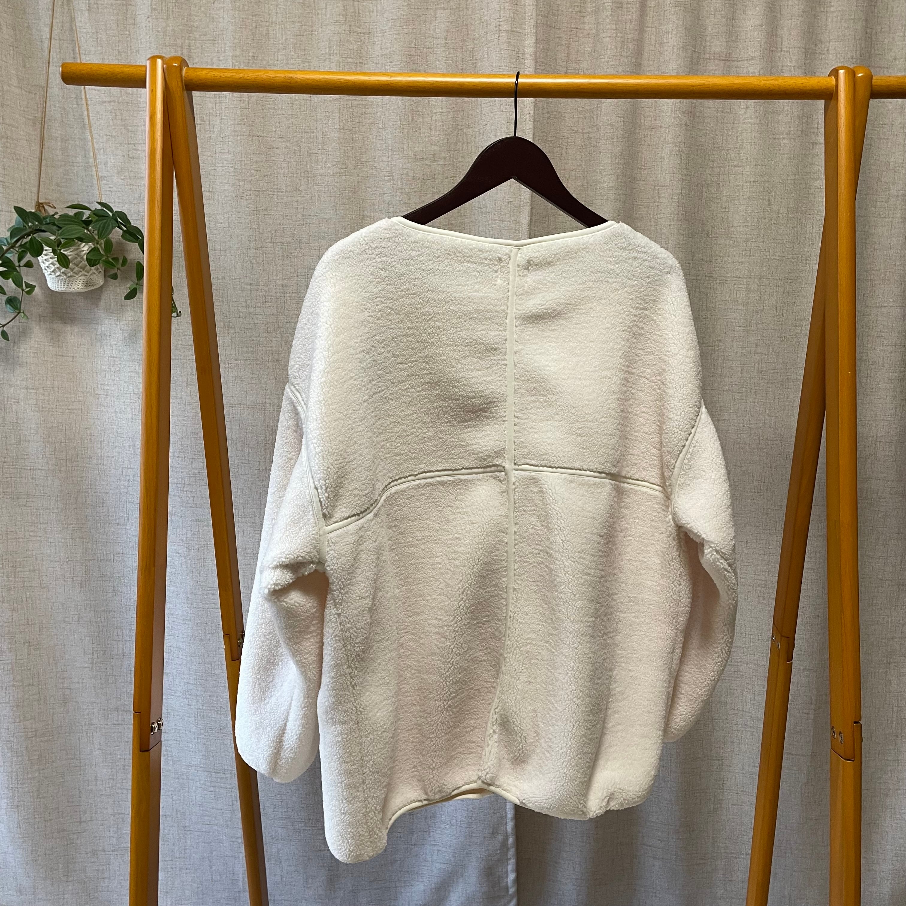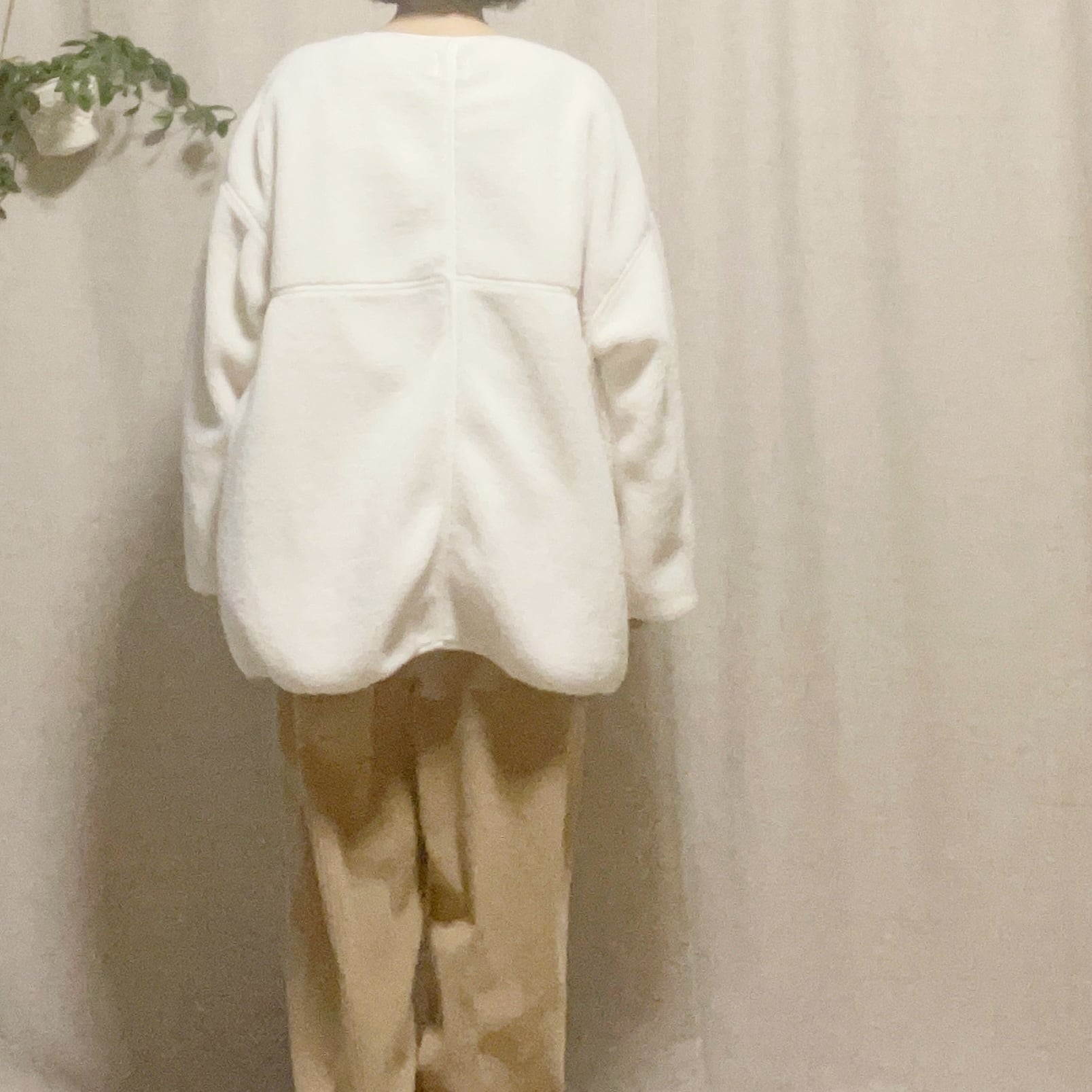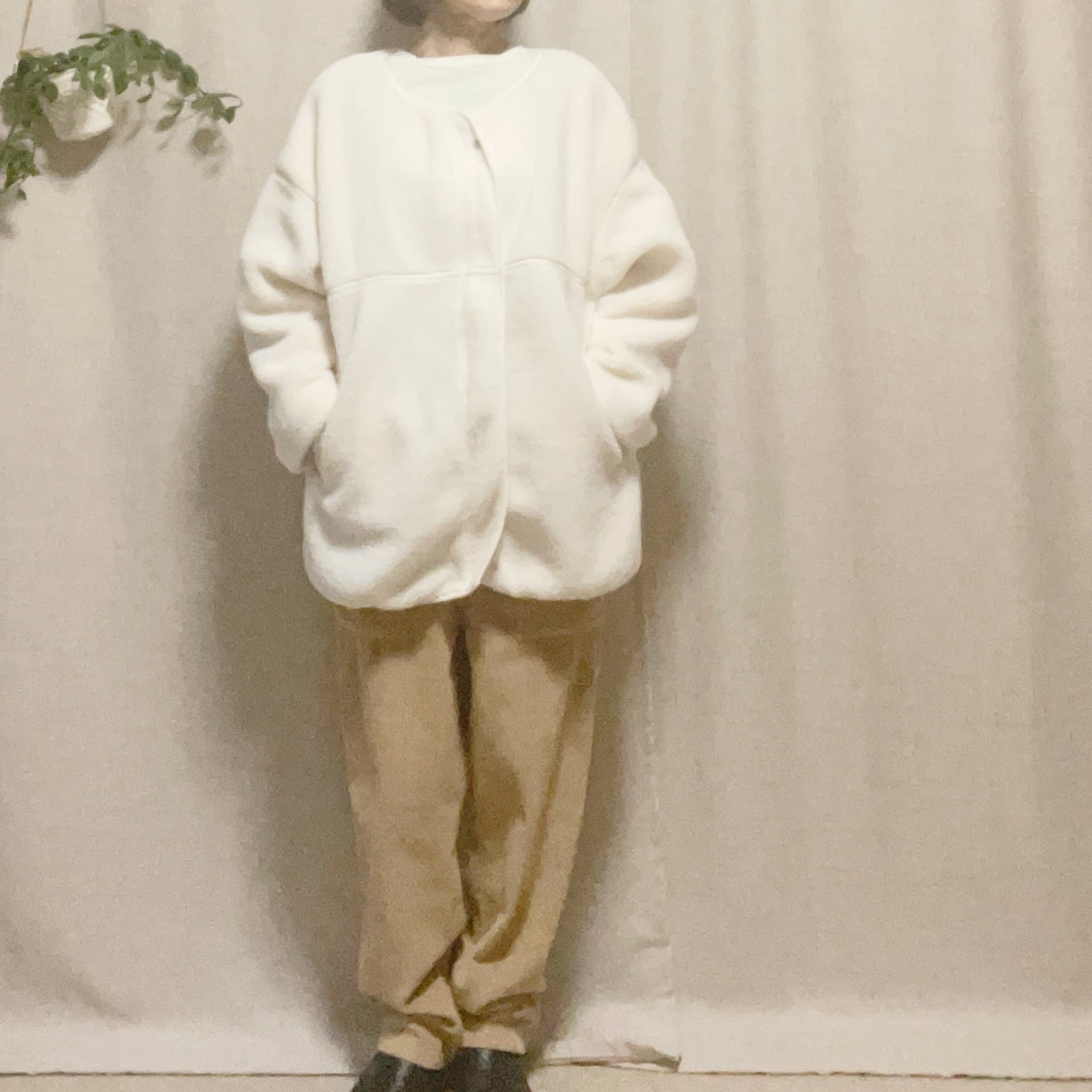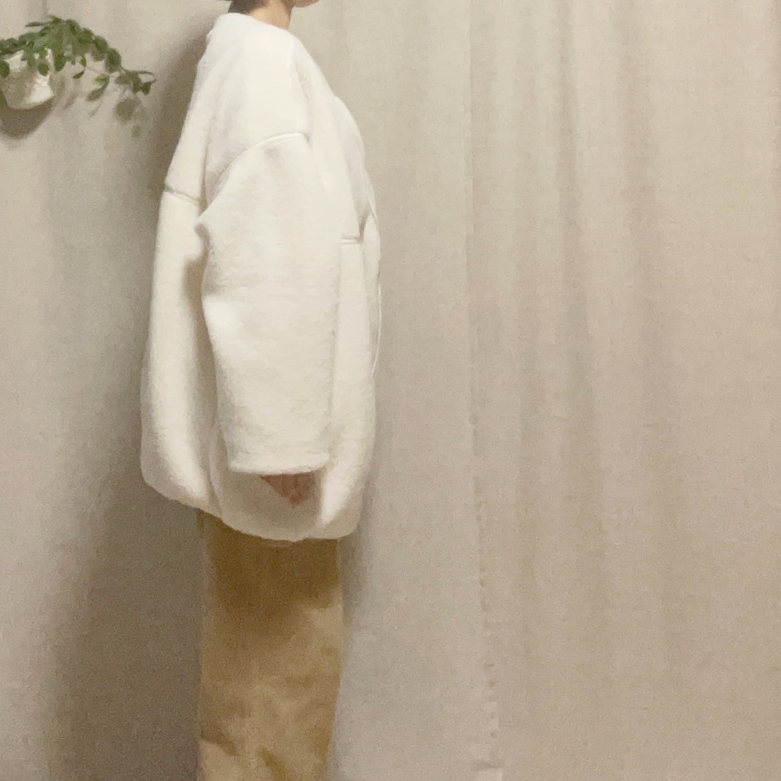 少しオーバーサイズで肩落ちシルエットが特徴で、ロンTやスウェットトレーナー、モックネックニットやケーブルニットなど様々なトップスと相性抜群!