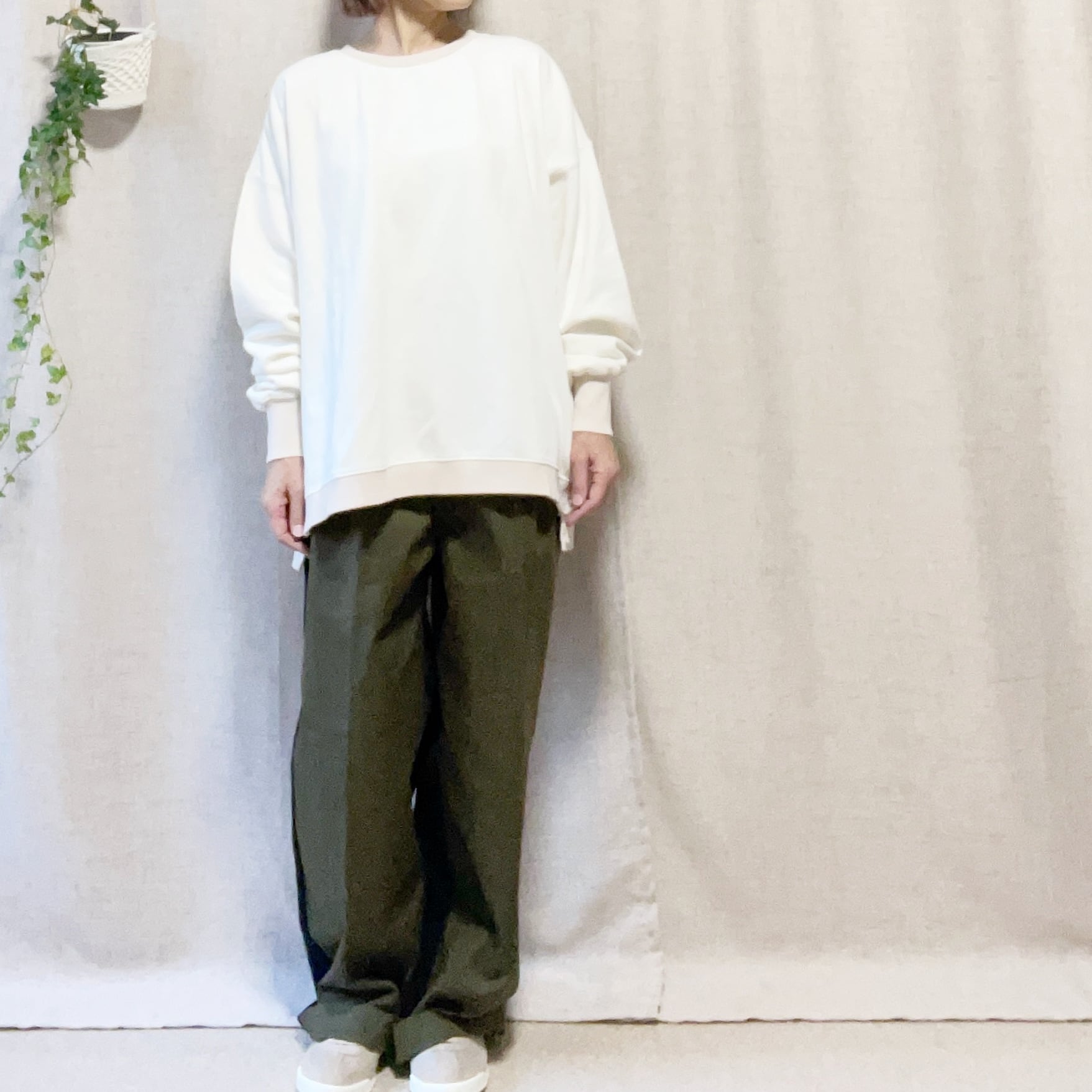 ゆったりとしたワイドなサイズ感なので、ロンTや薄手のニット、シャツとも重ね着を楽しめ、カジュアルからきれいめコーデまで幅広く活躍します!