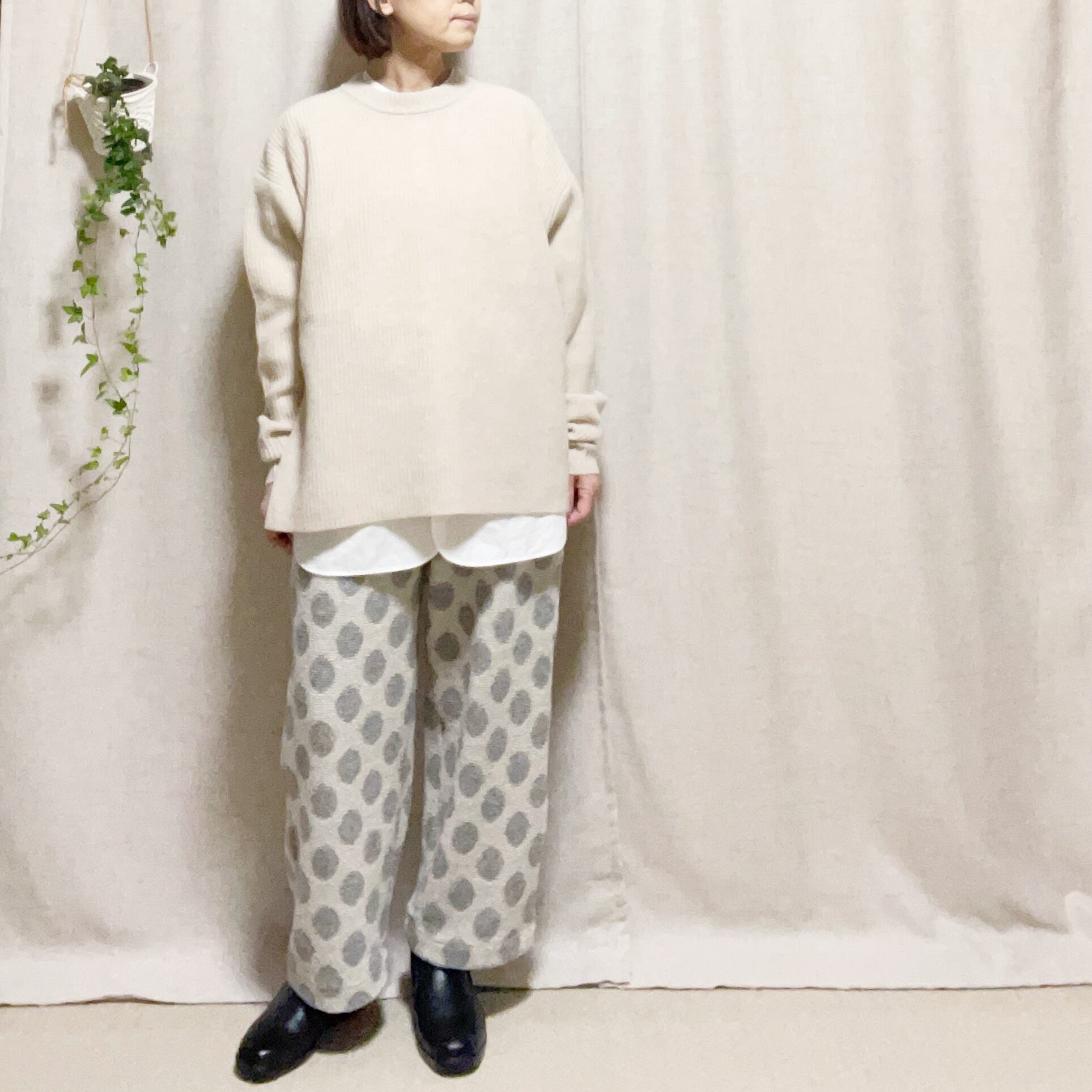 全体的にゆったりとしたシルエットなので、リラックスしたスタイルを楽しむことができます。ラインを気にせず、気軽に着用できるところが魅力です。