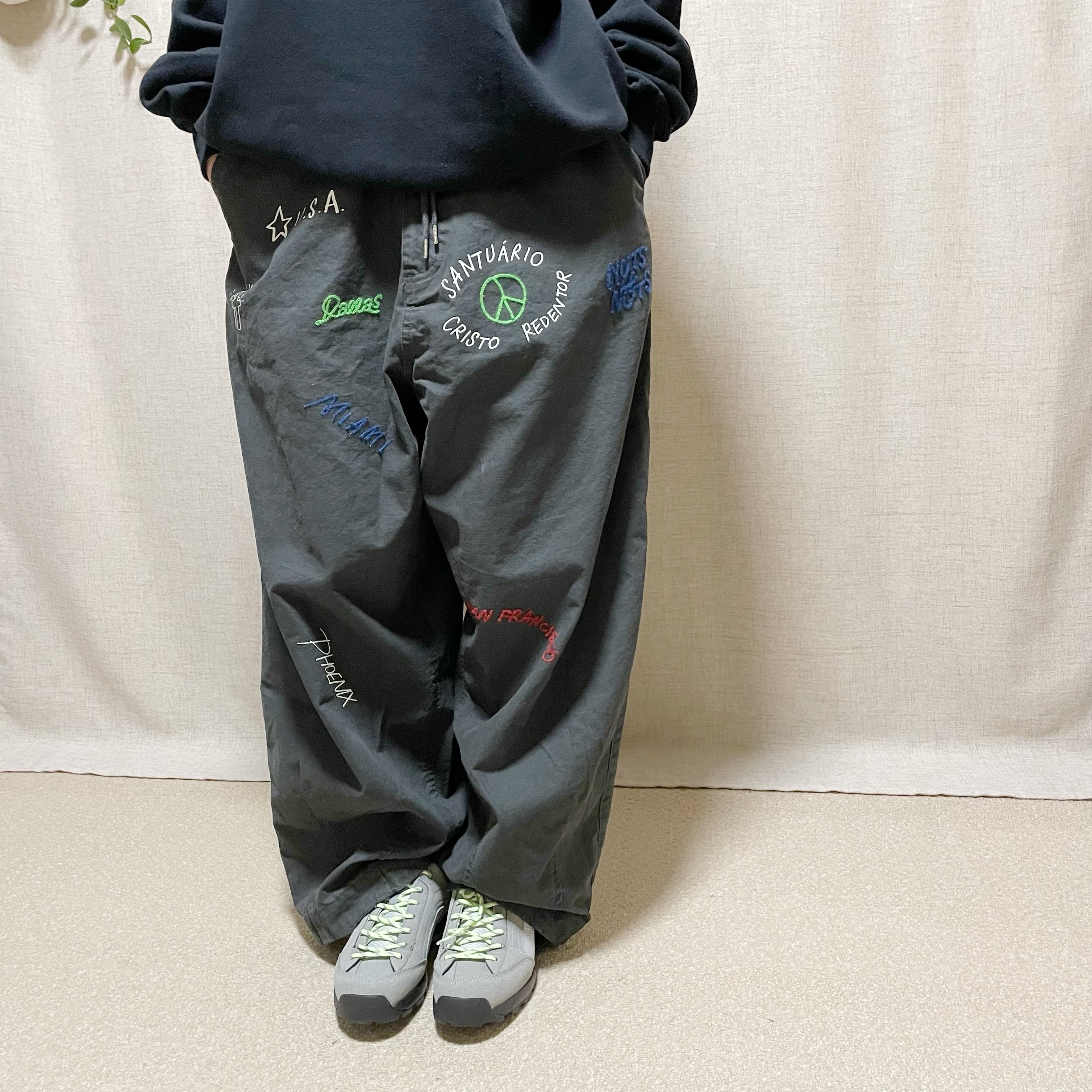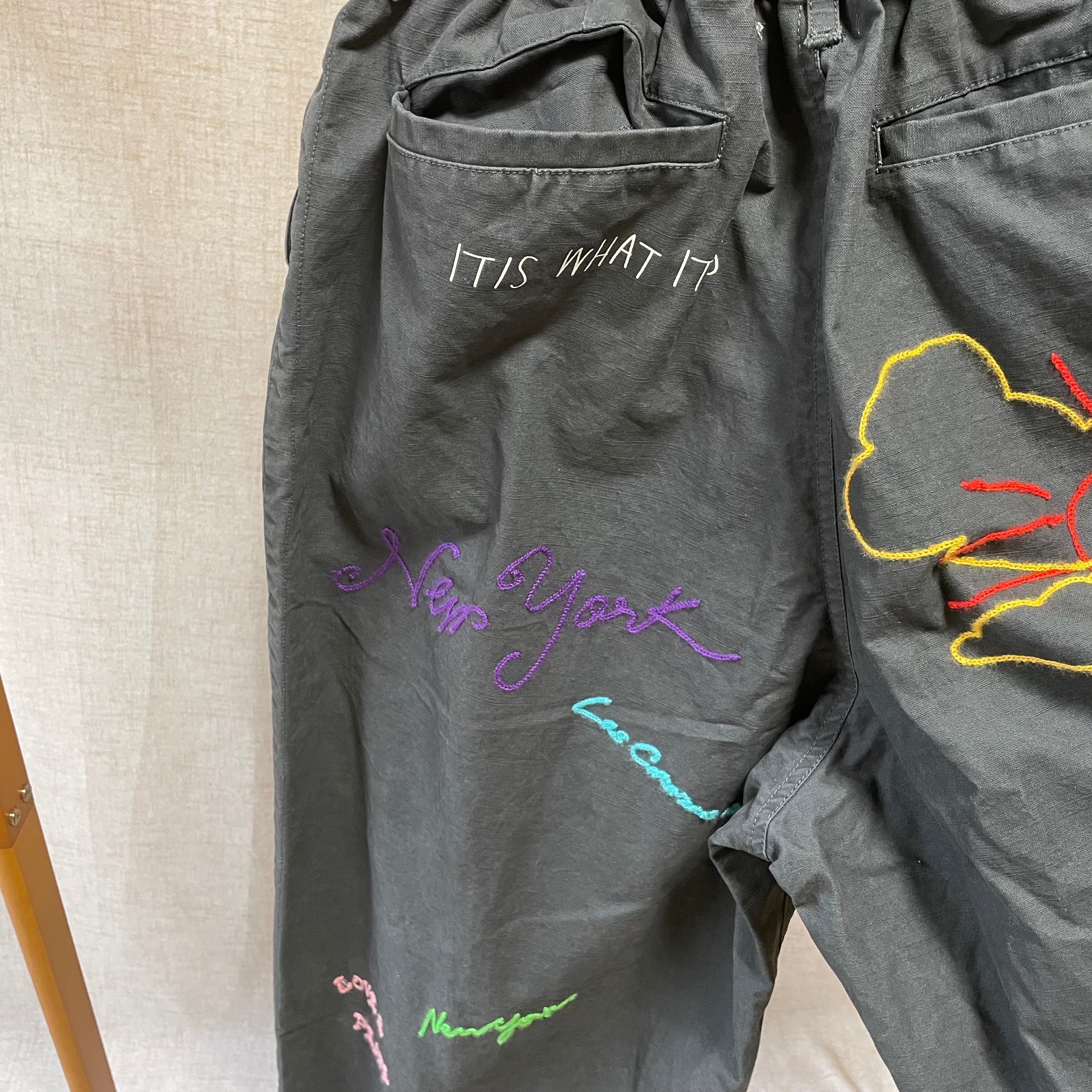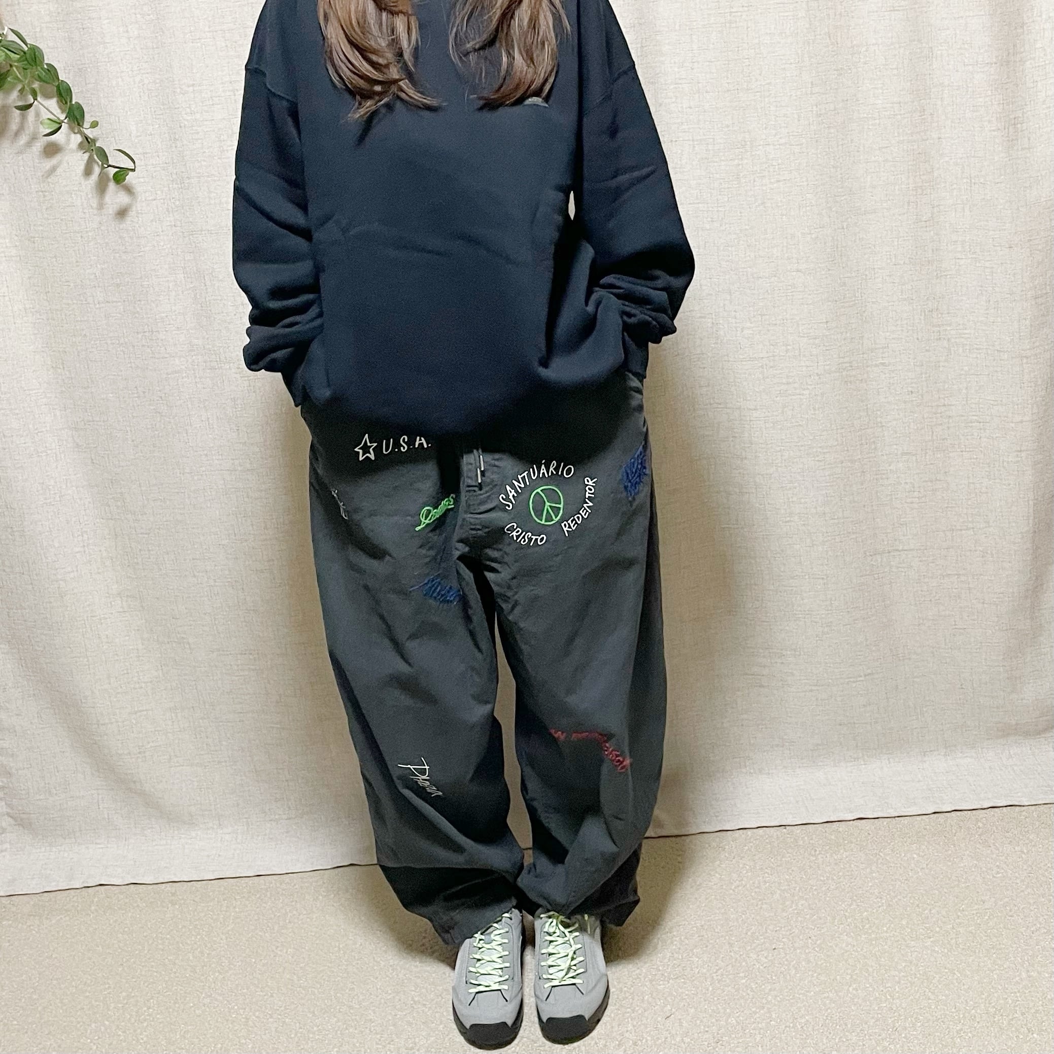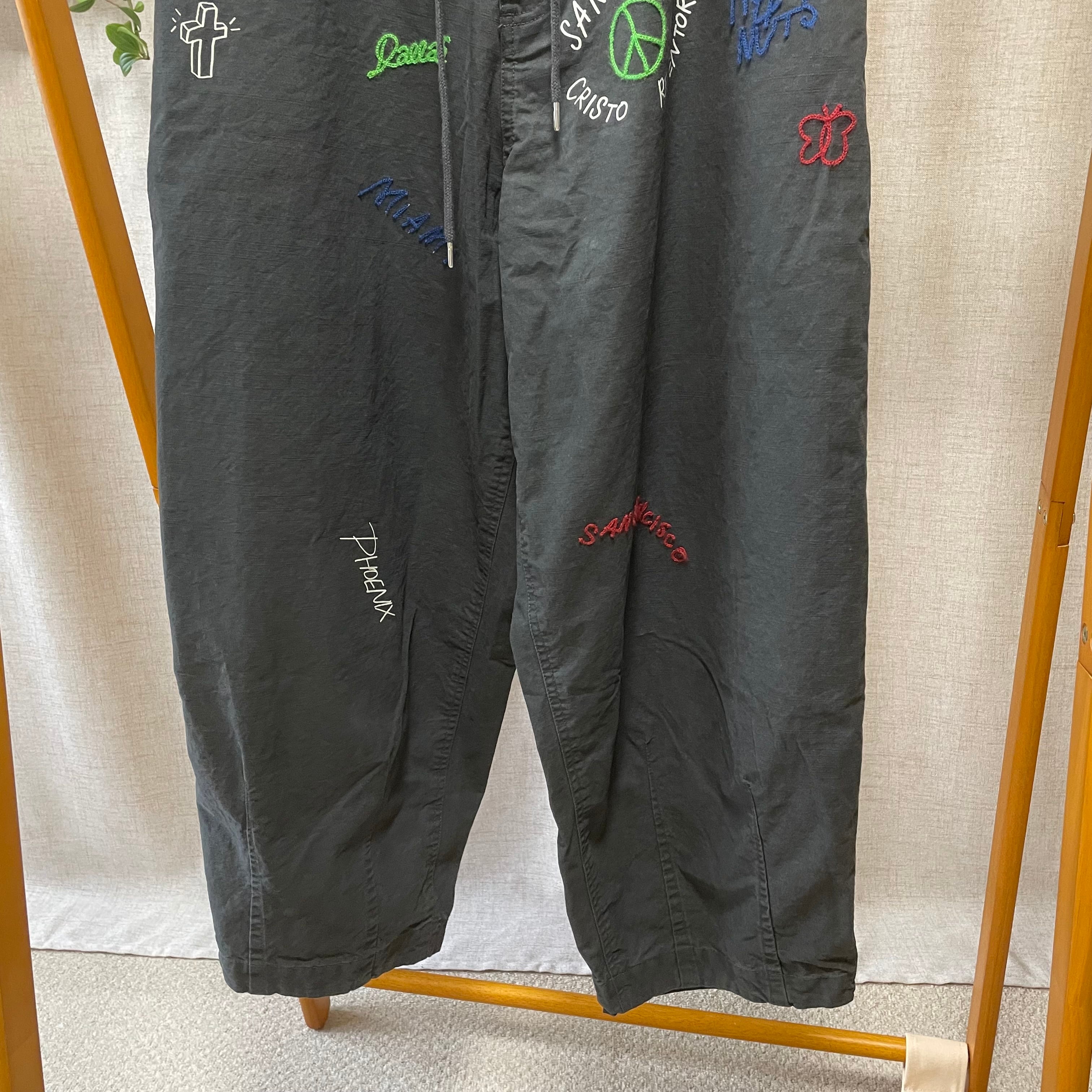 オリジナルのリメイク刺繍が特徴的なバズーカパンツ。
