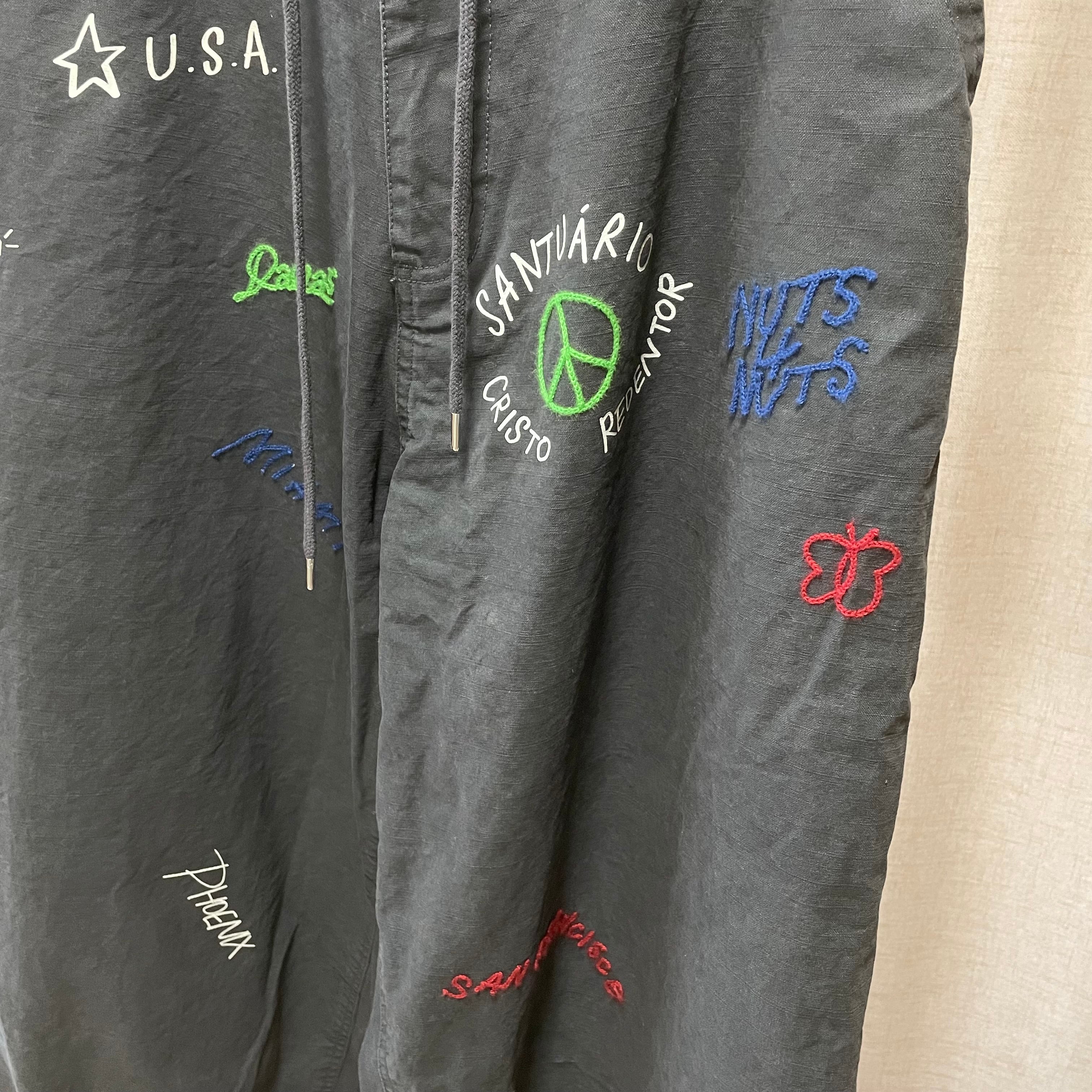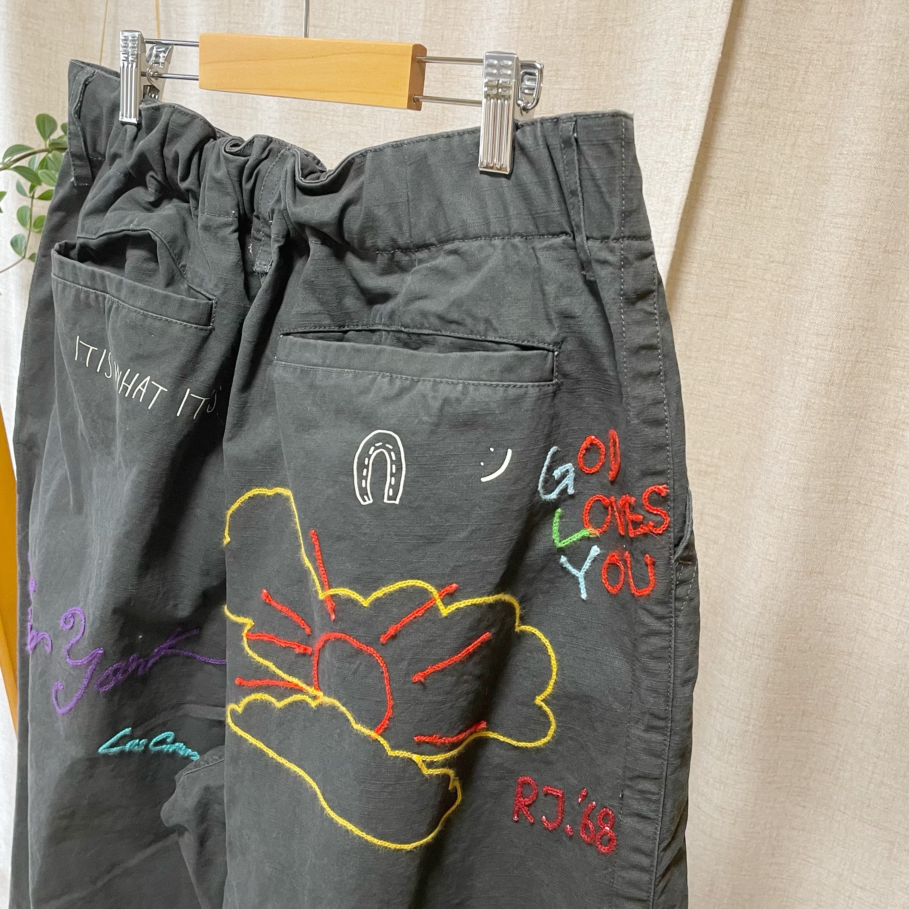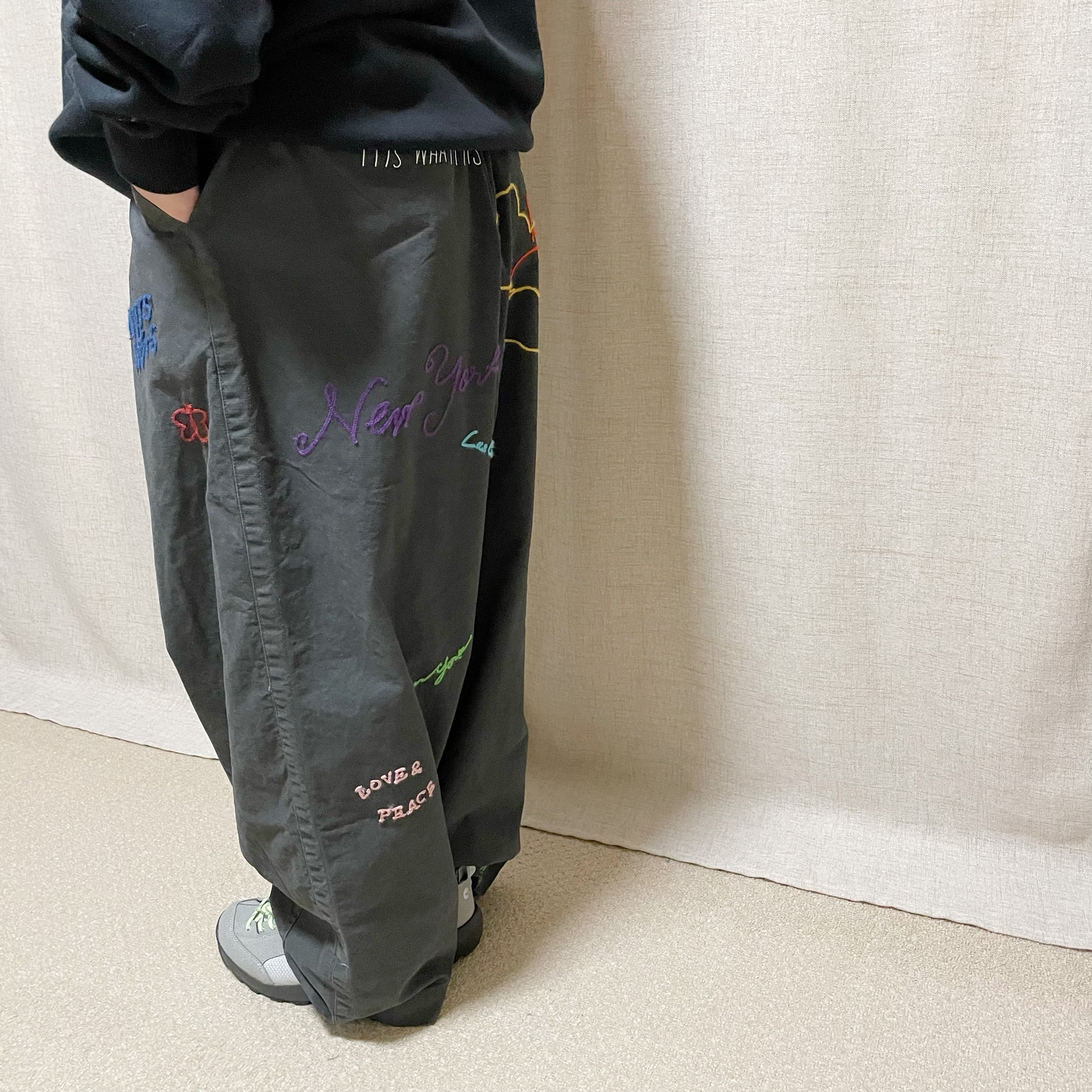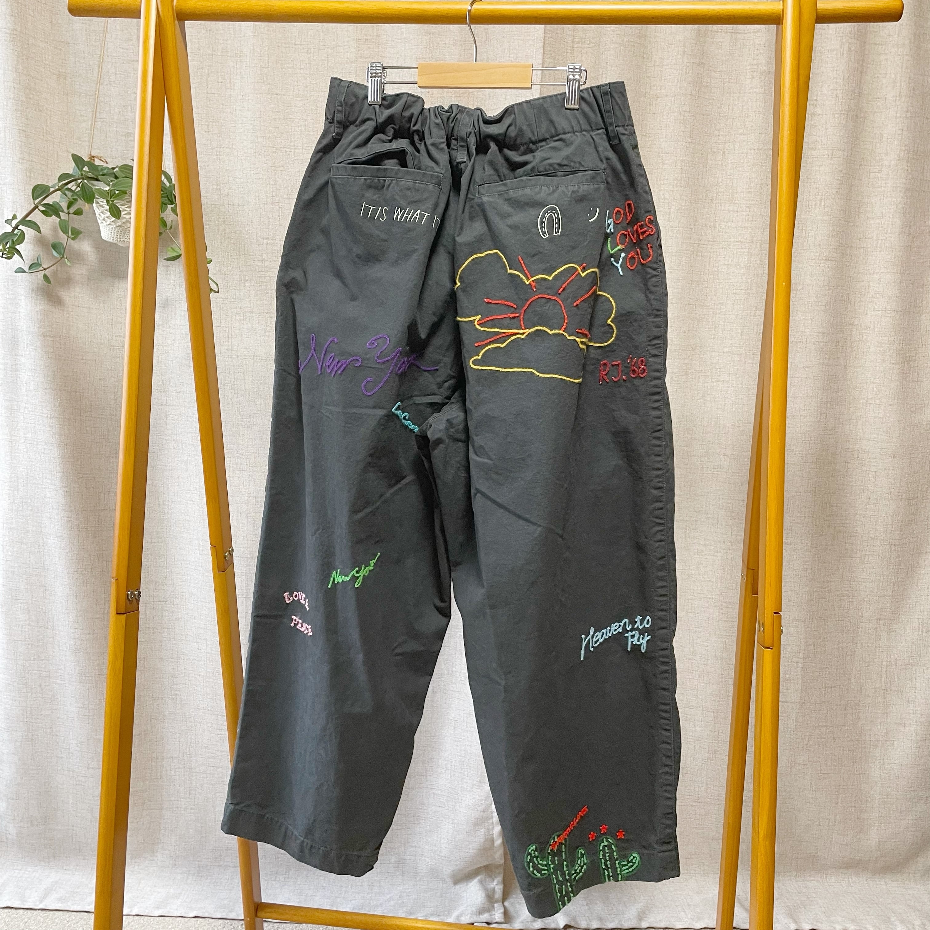 オリジナルのリメイク刺繍が特徴的なバズーカパンツ。