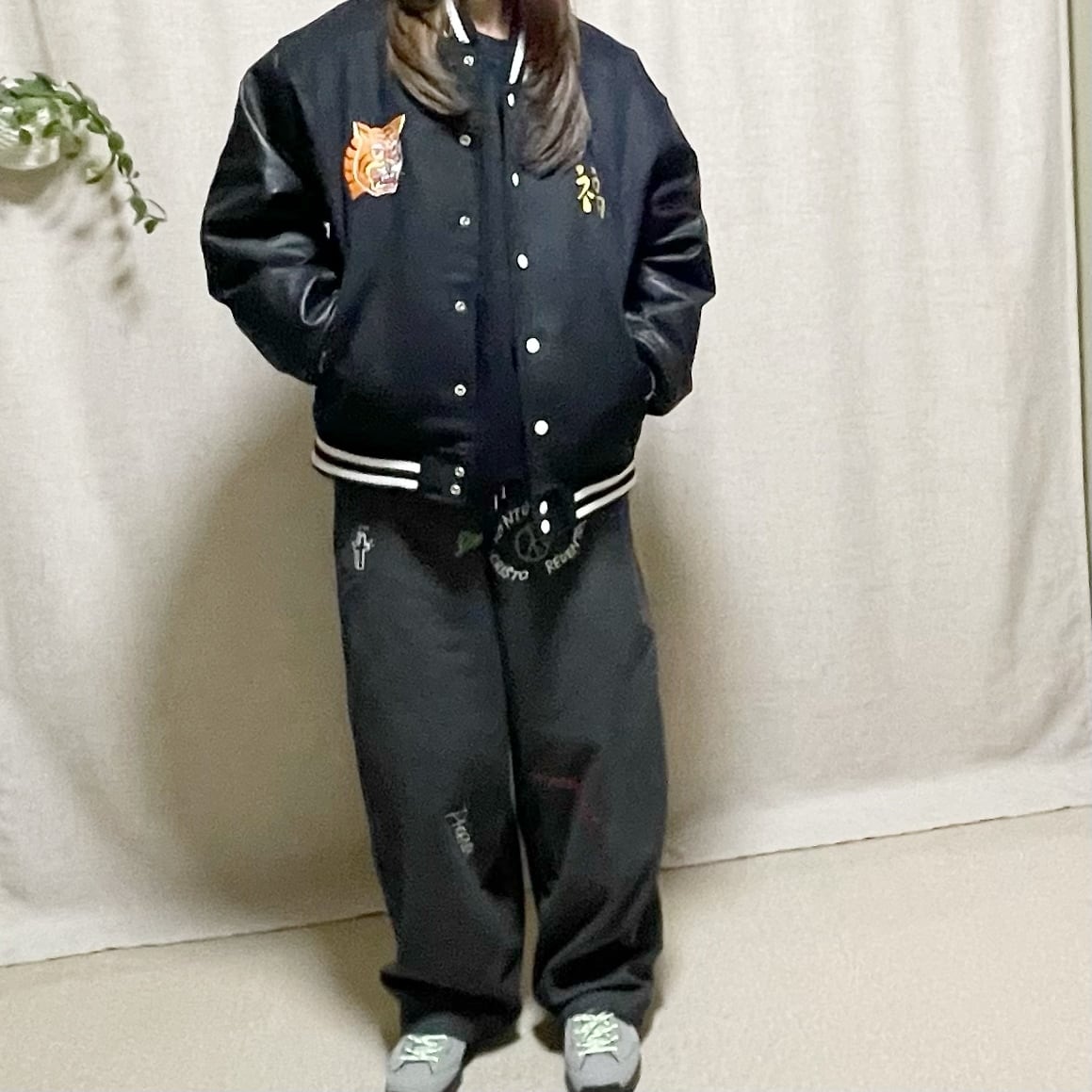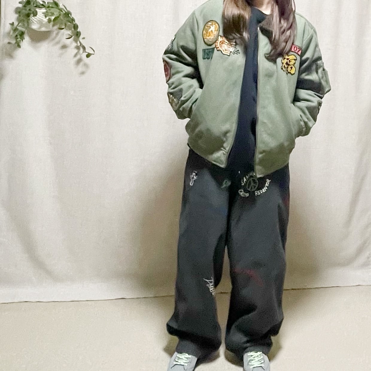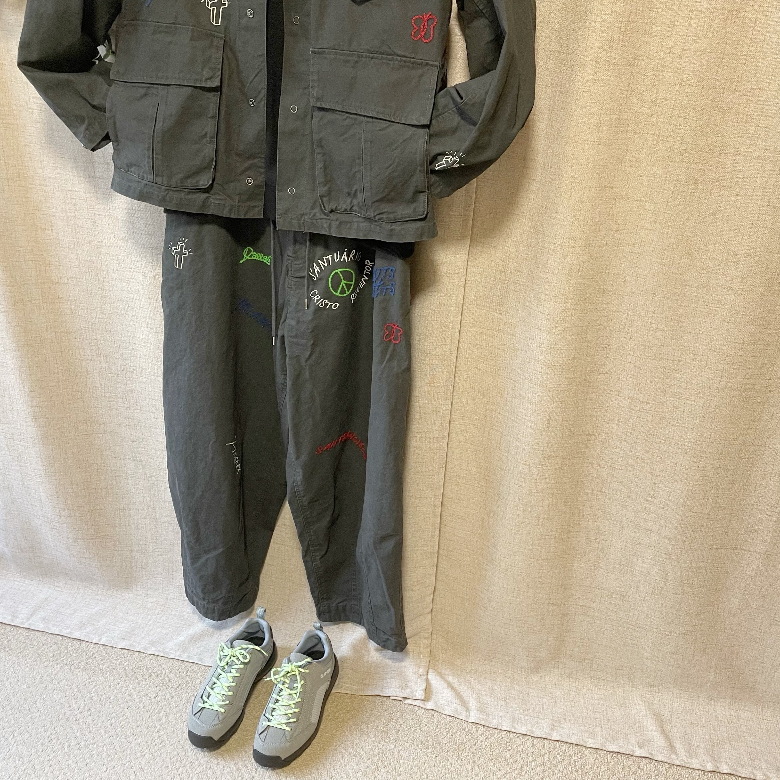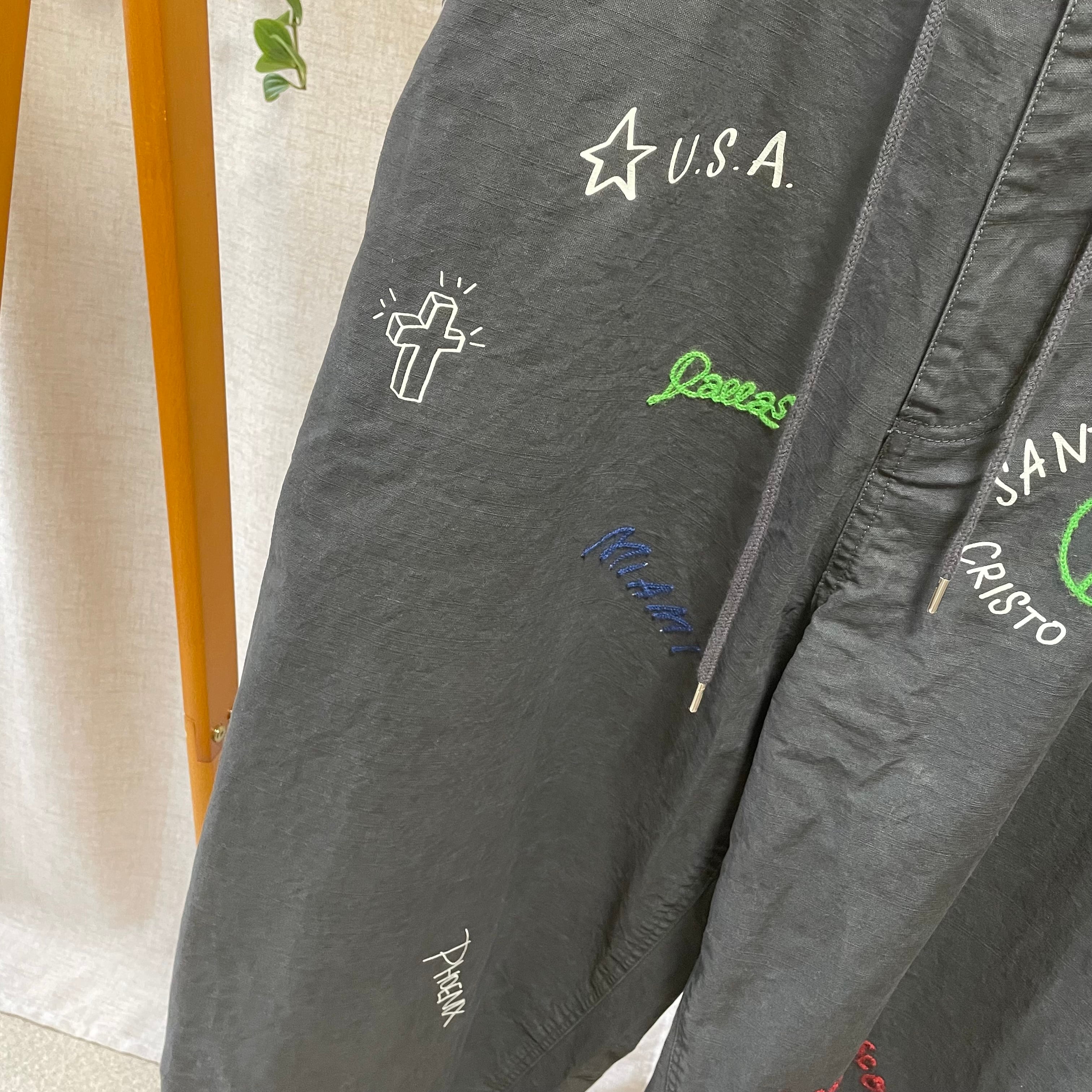 オリジナルのリメイク刺繍が特徴的なバズーカパンツ。