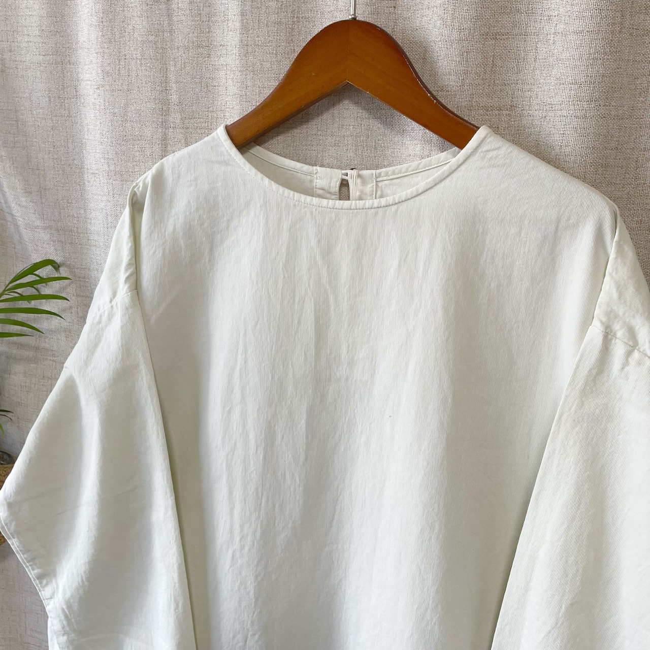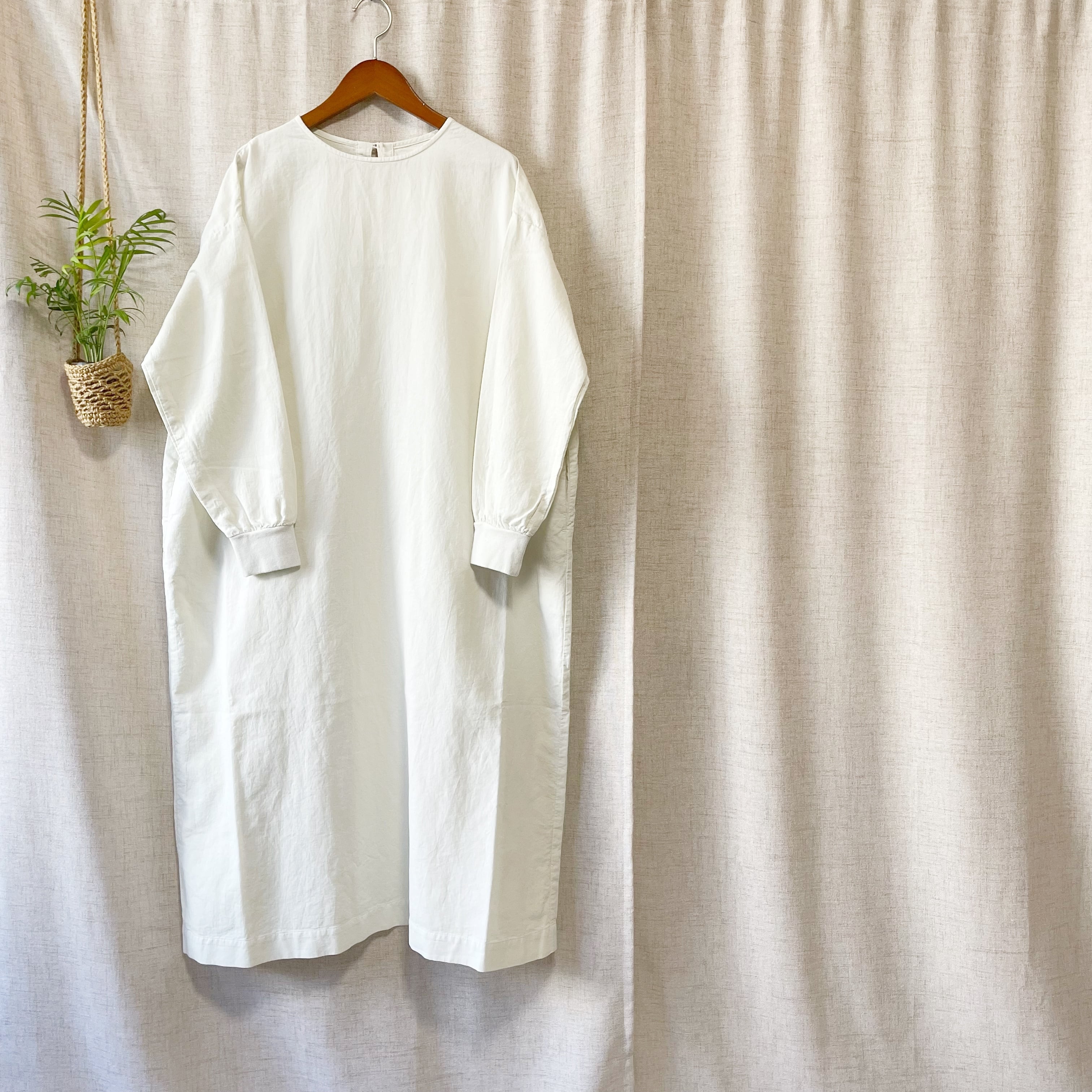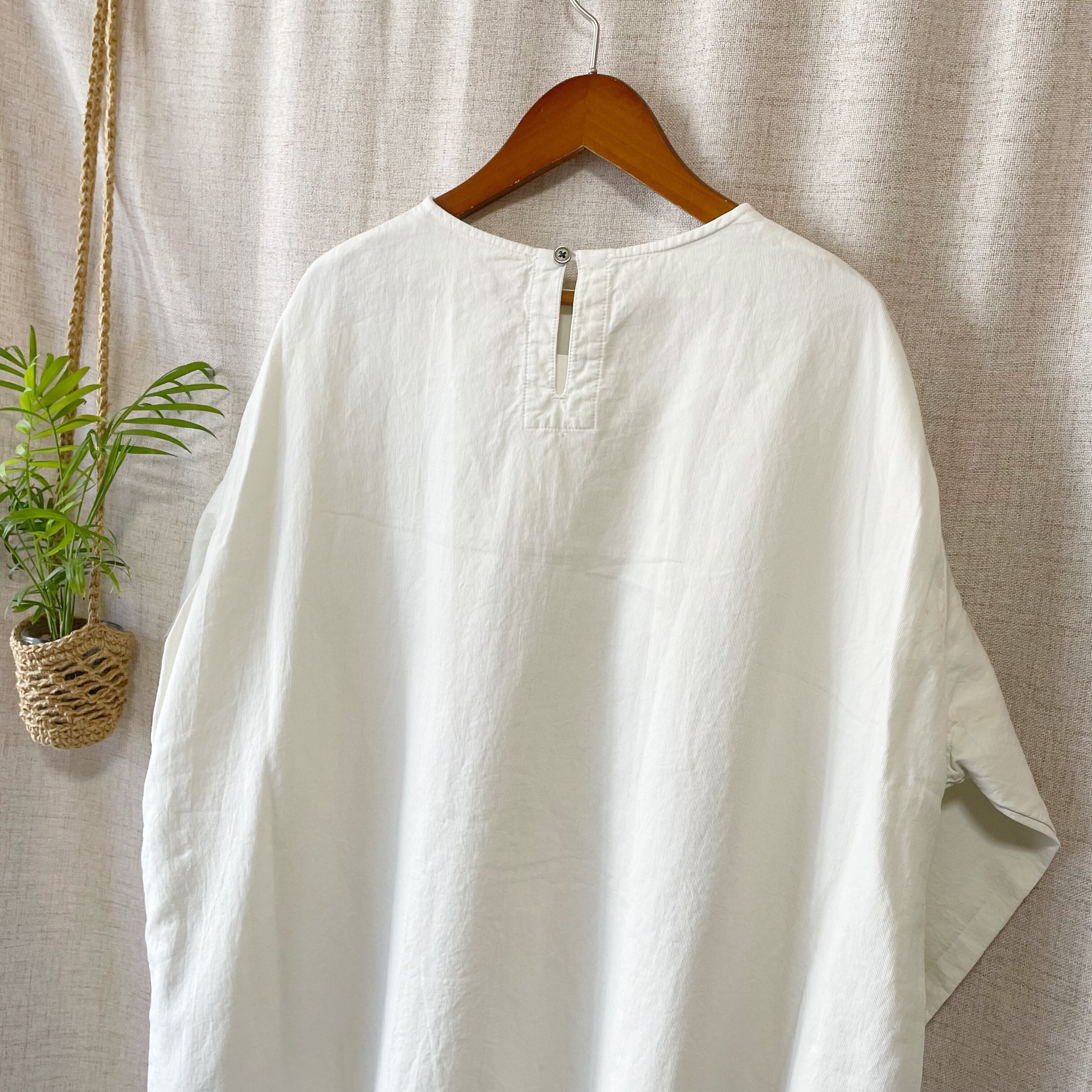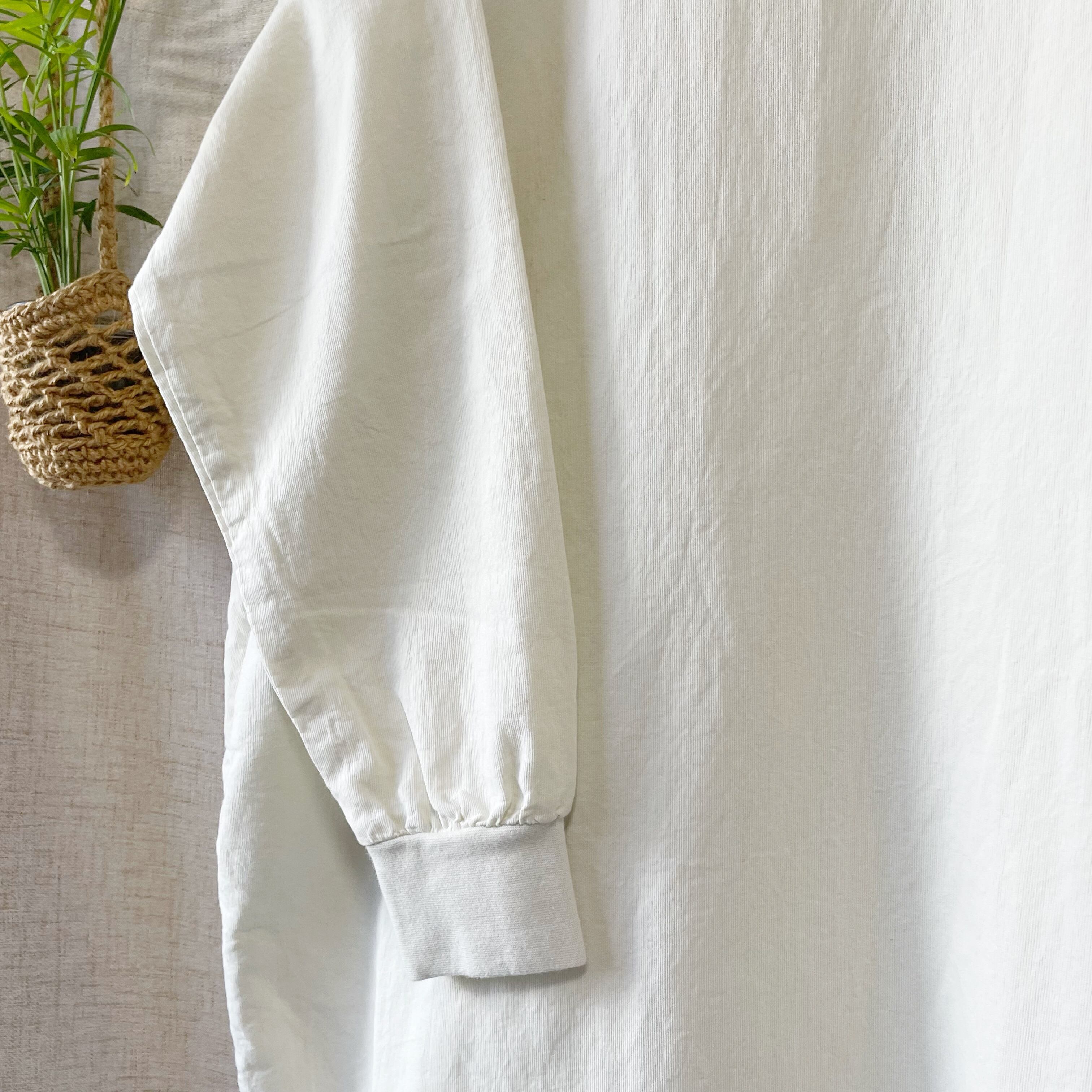 ゆったりシルエットで、フロントのボタンと袖リブがポイント。