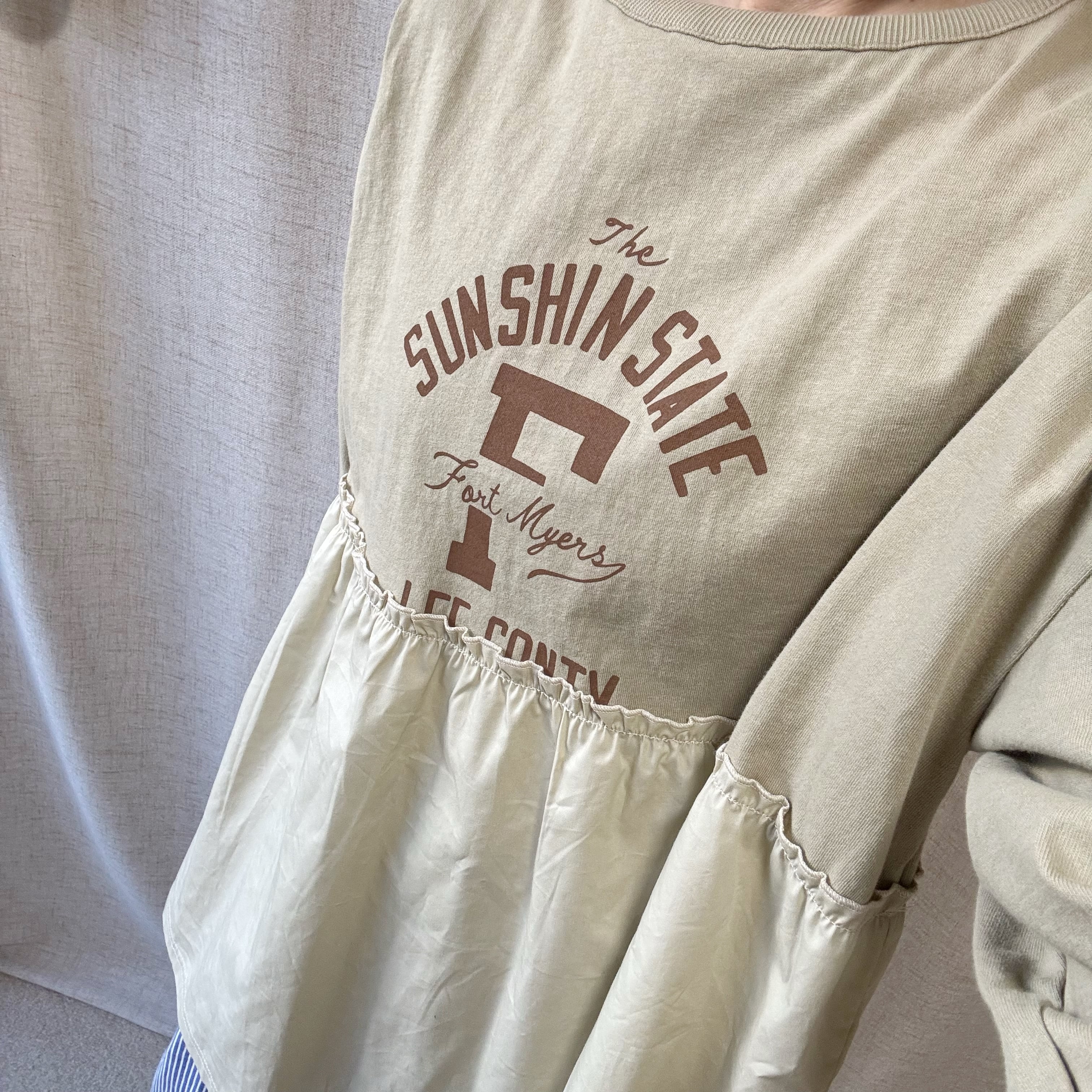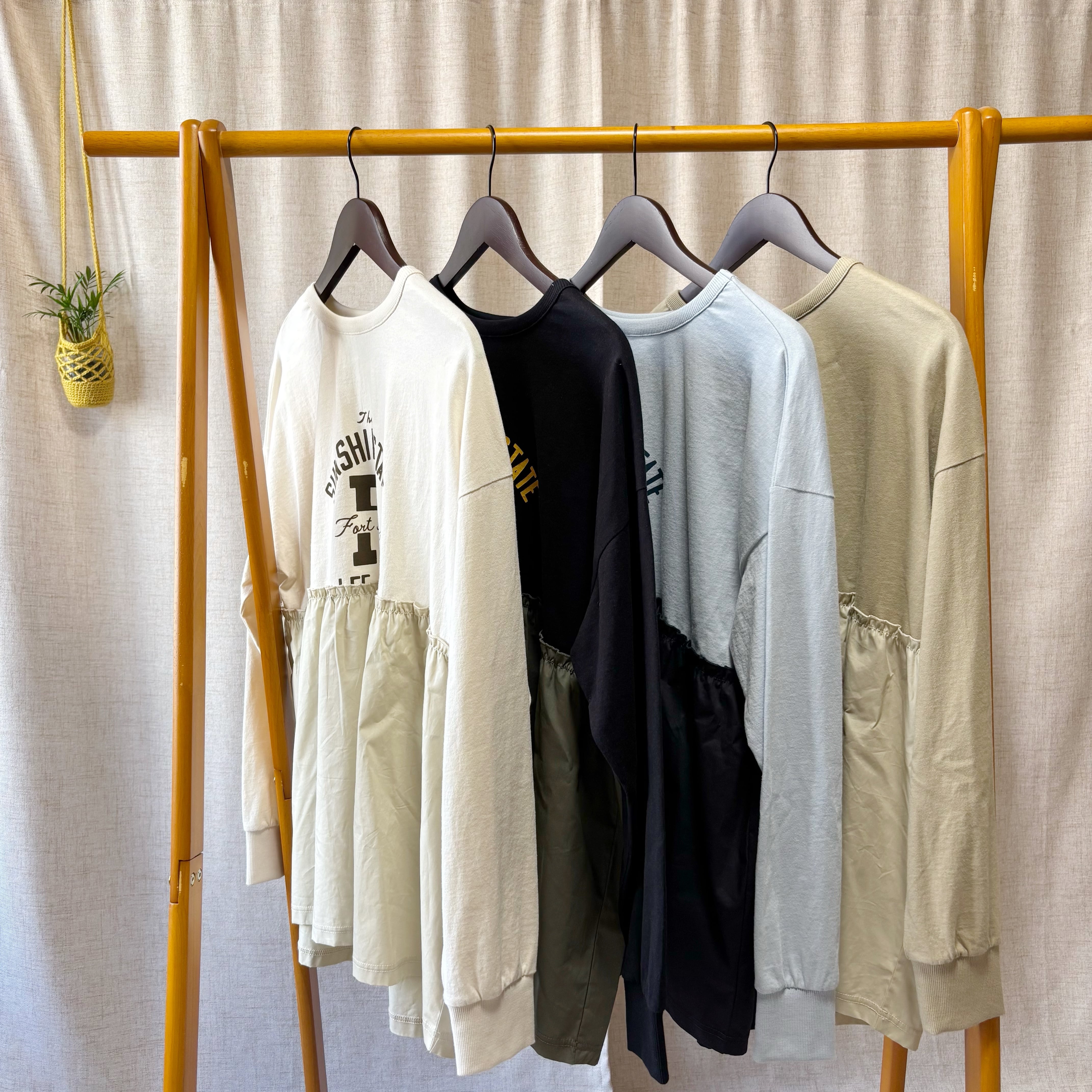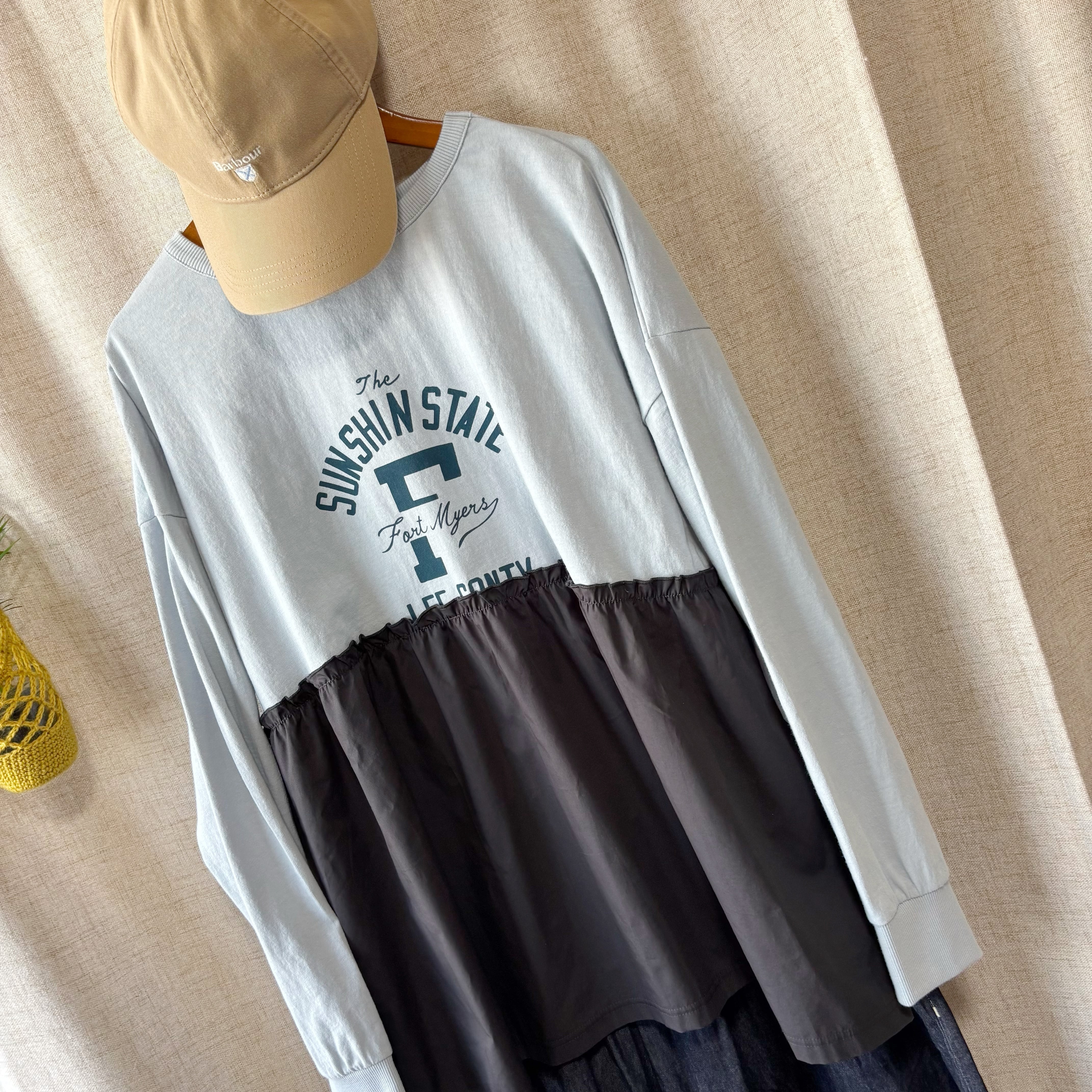 フロントにはロゴプリントを施した天竺素材を使用し、裾部分には異素材をドッキングすることで、一枚でレイヤード風のスタイリングが完成するデザインに仕上げています。