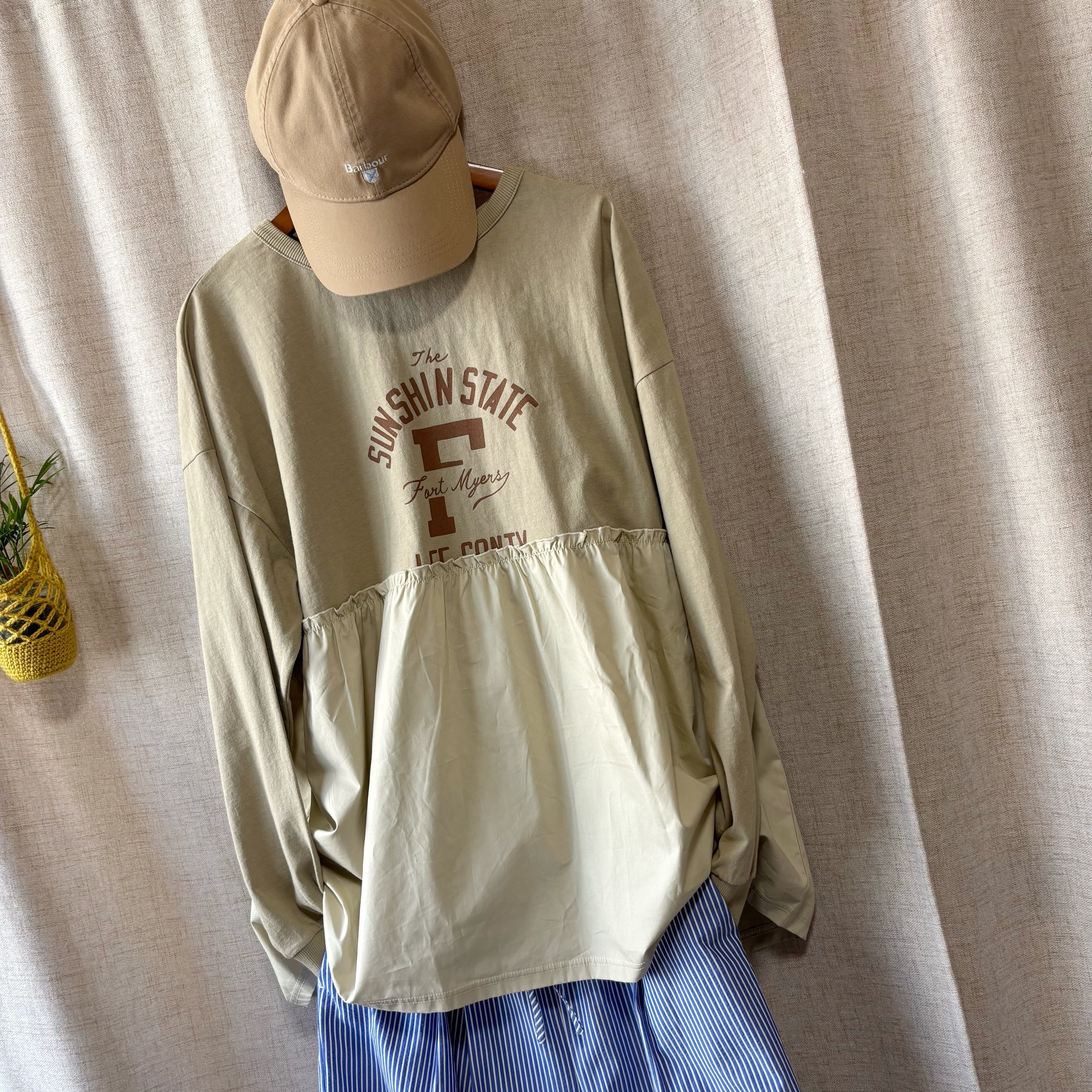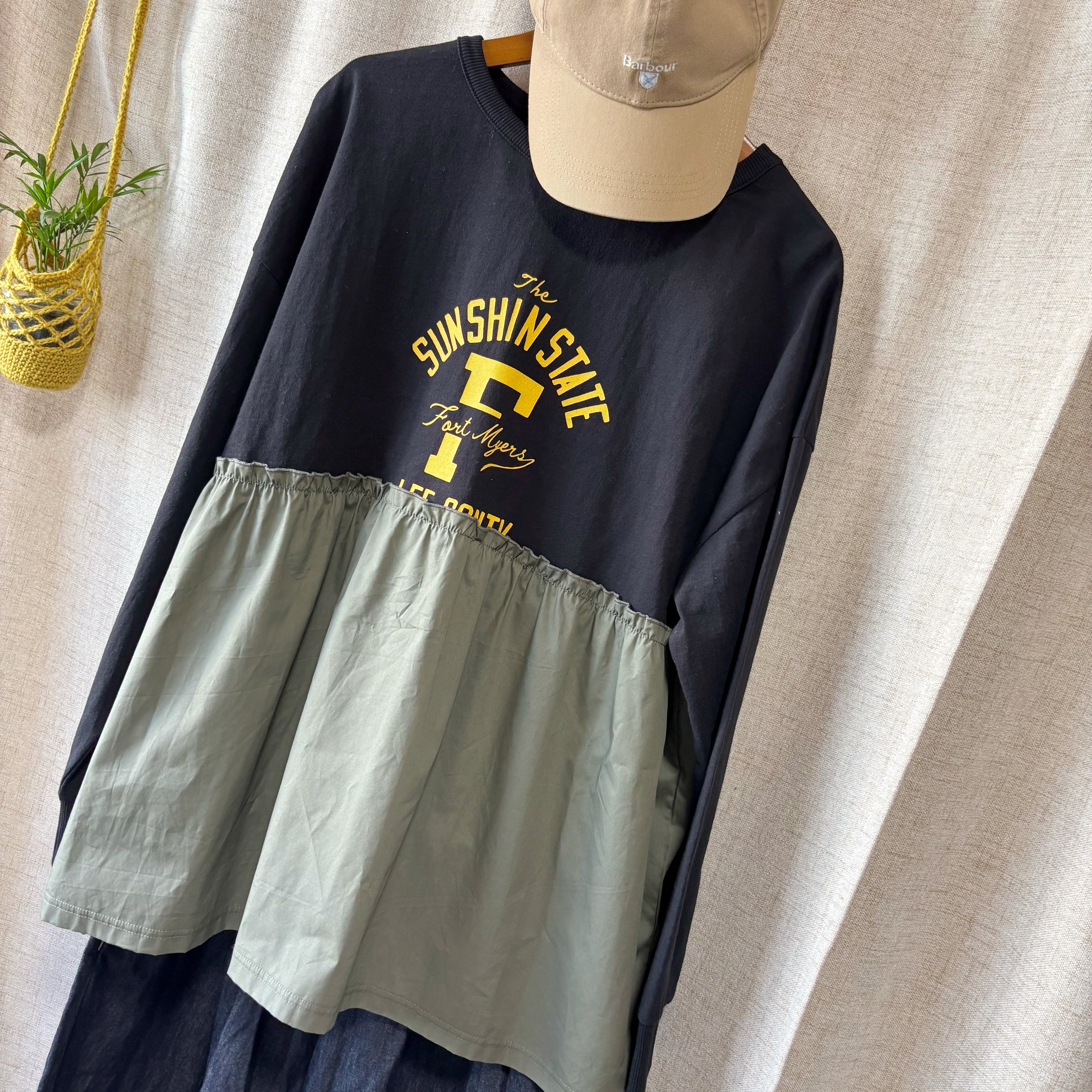 素材の切替と配色バランスが、リメイク感のあるラフな表情を演出。