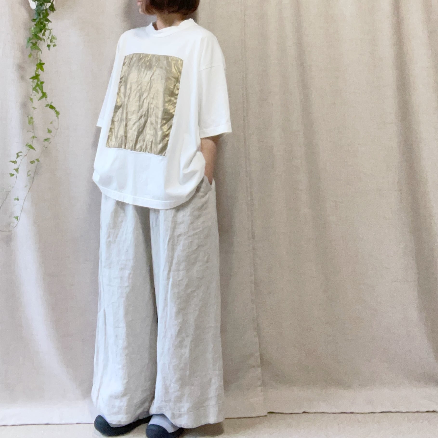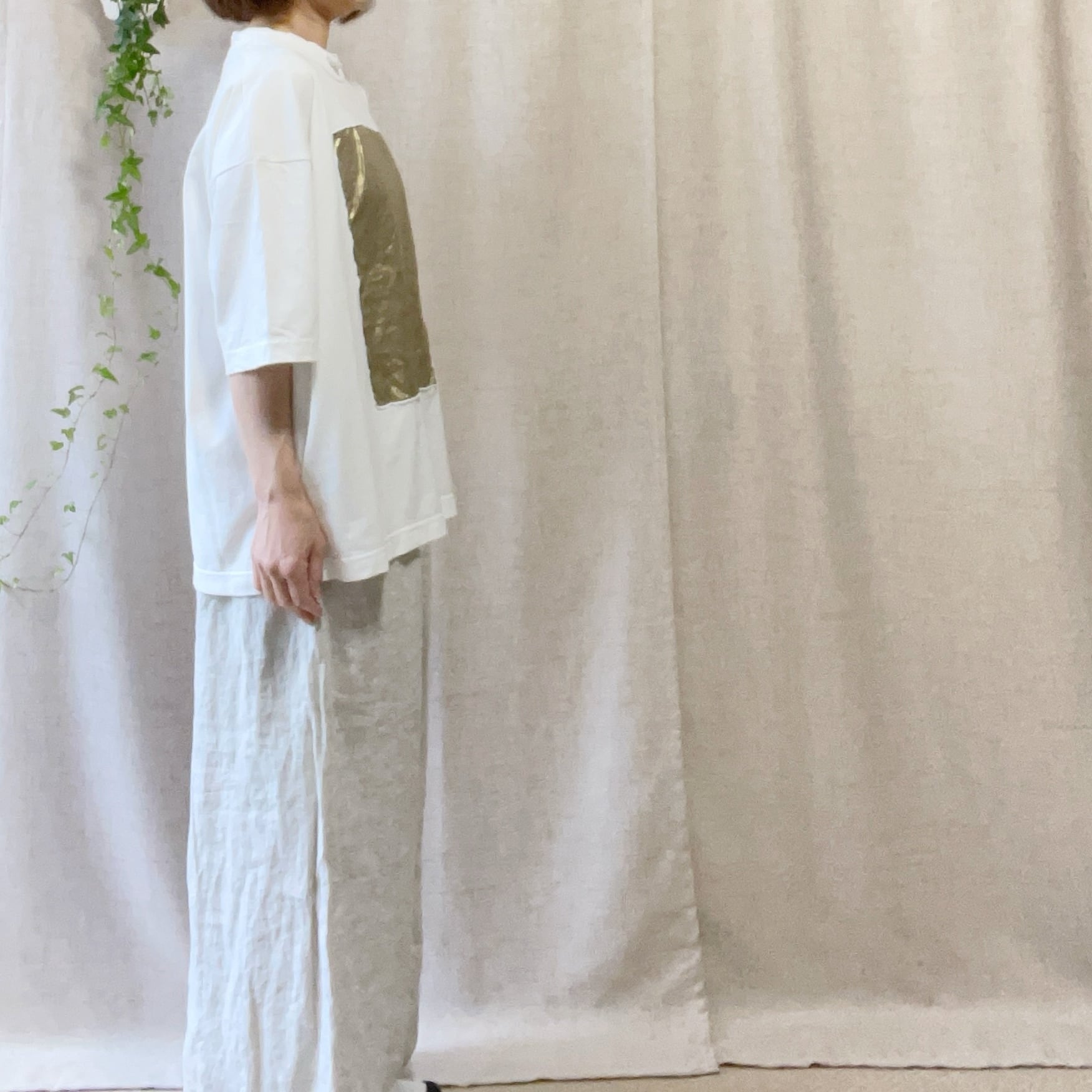 リネン素材に小さなきらめきを感じる「箔(はく)」をプリントした生地を合わせています。