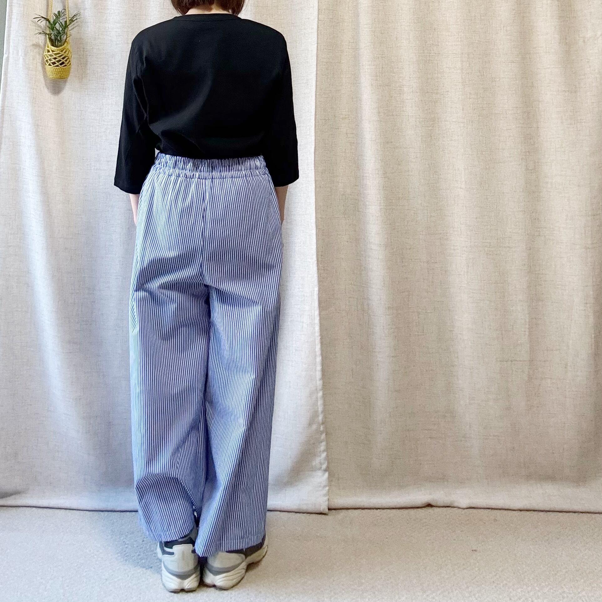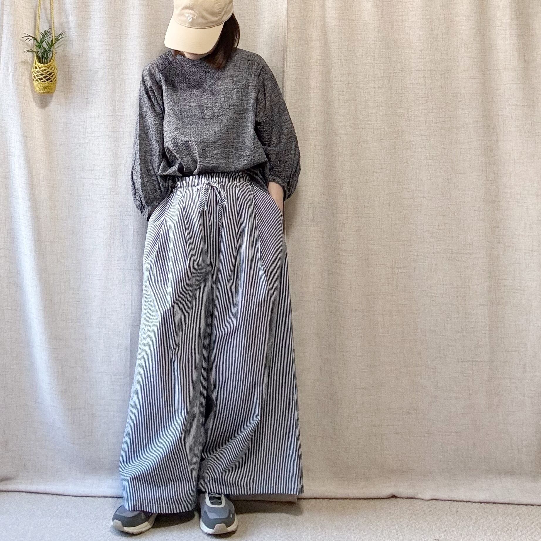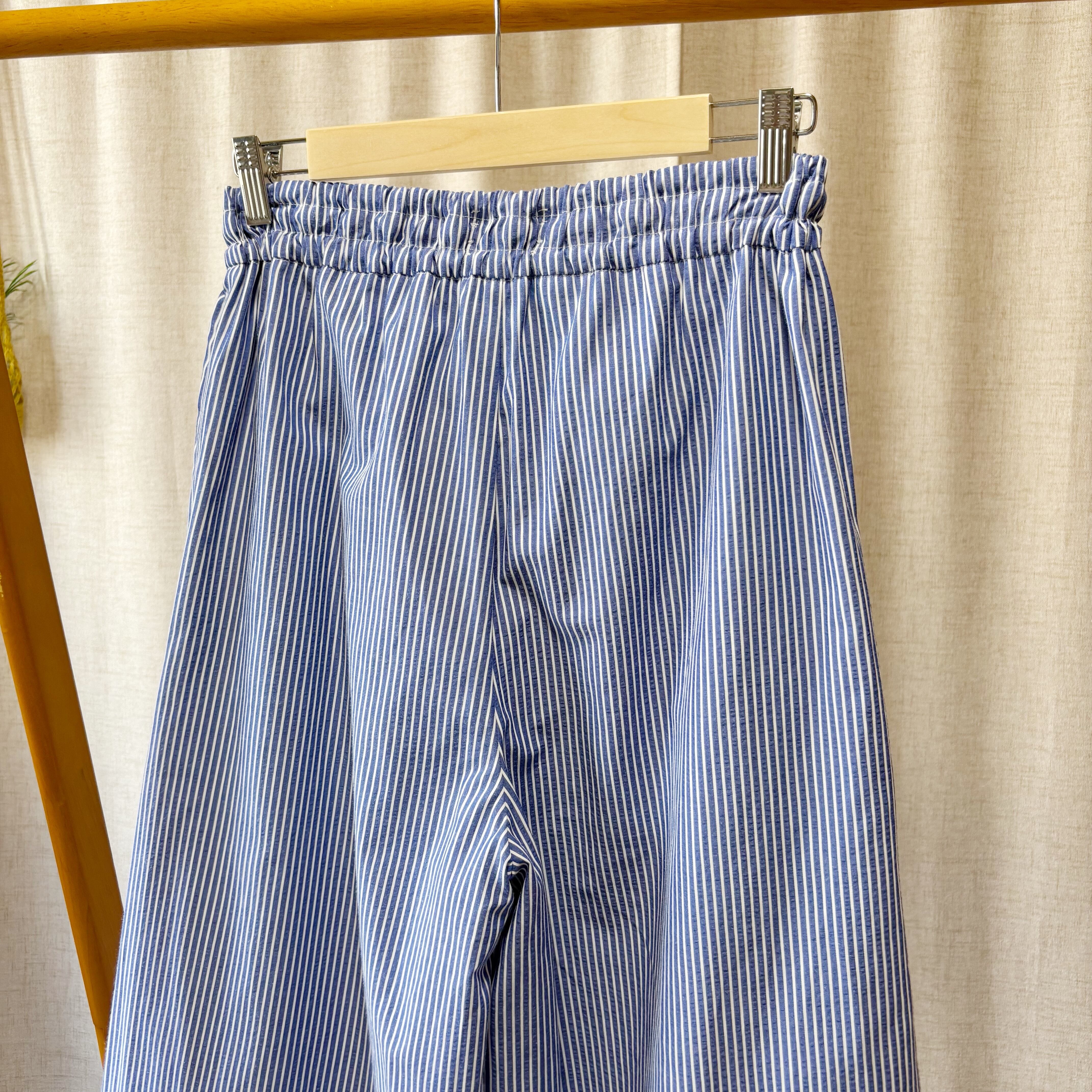 サッカーストライプ素材のタックワイドパンツ。軽やかで上品に見える一本。