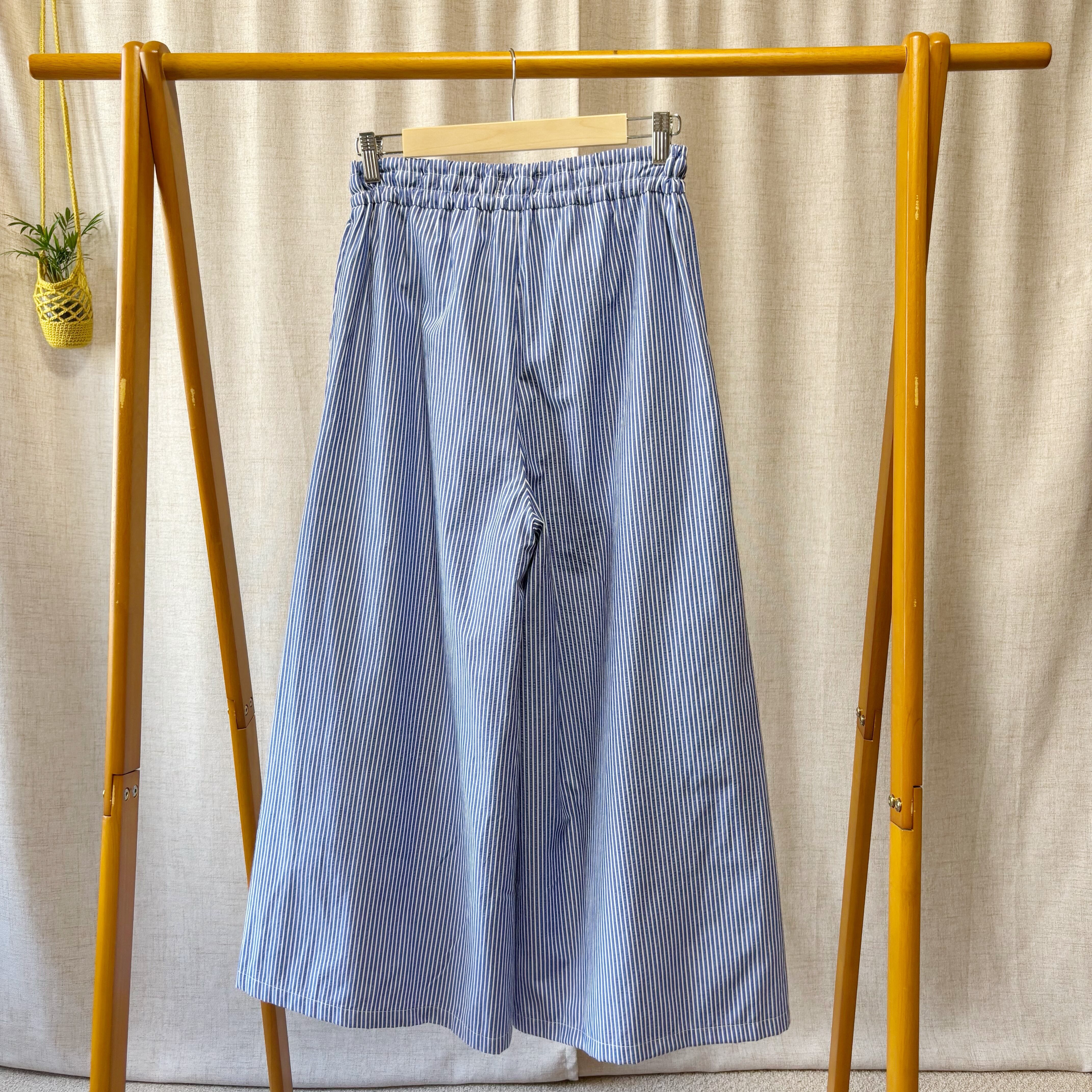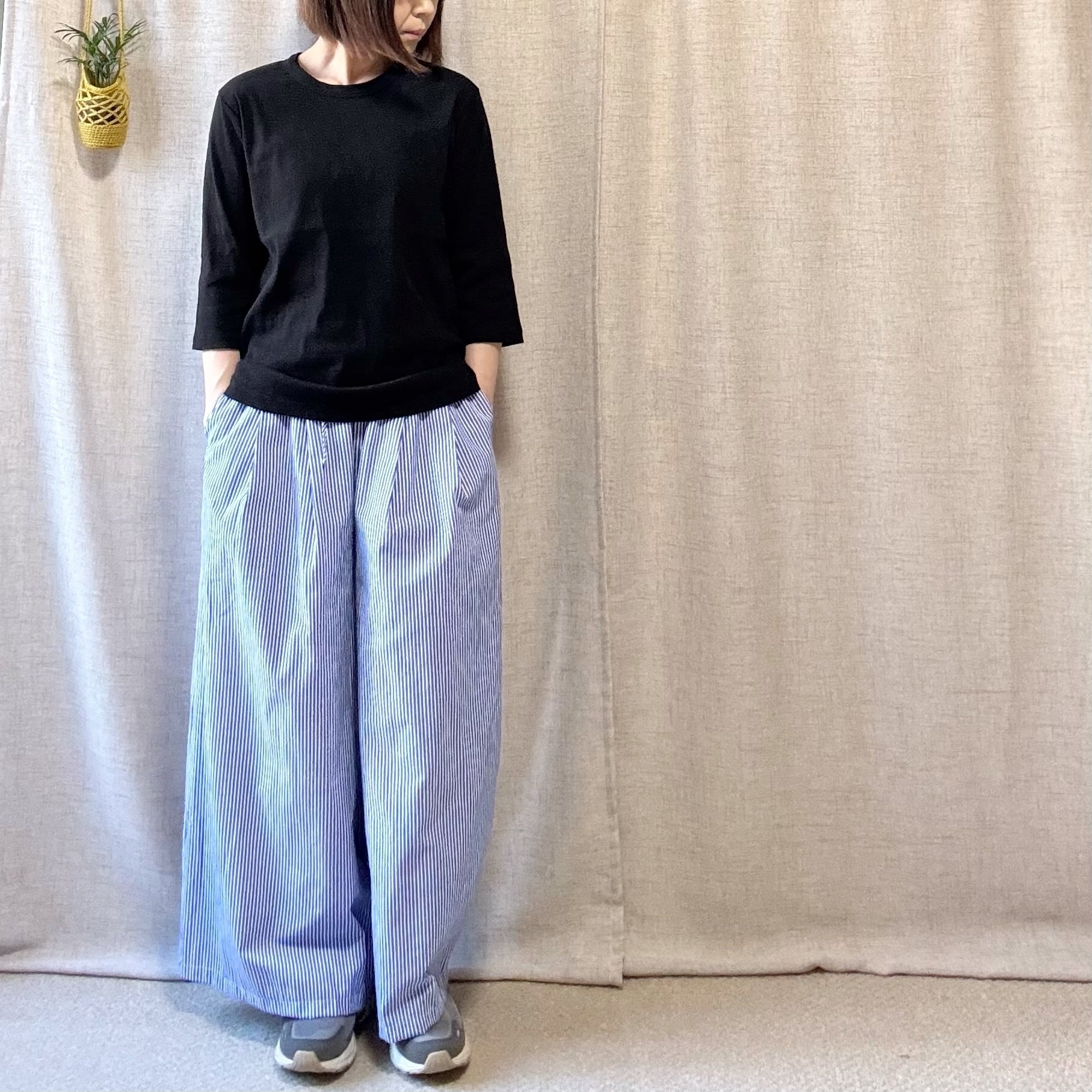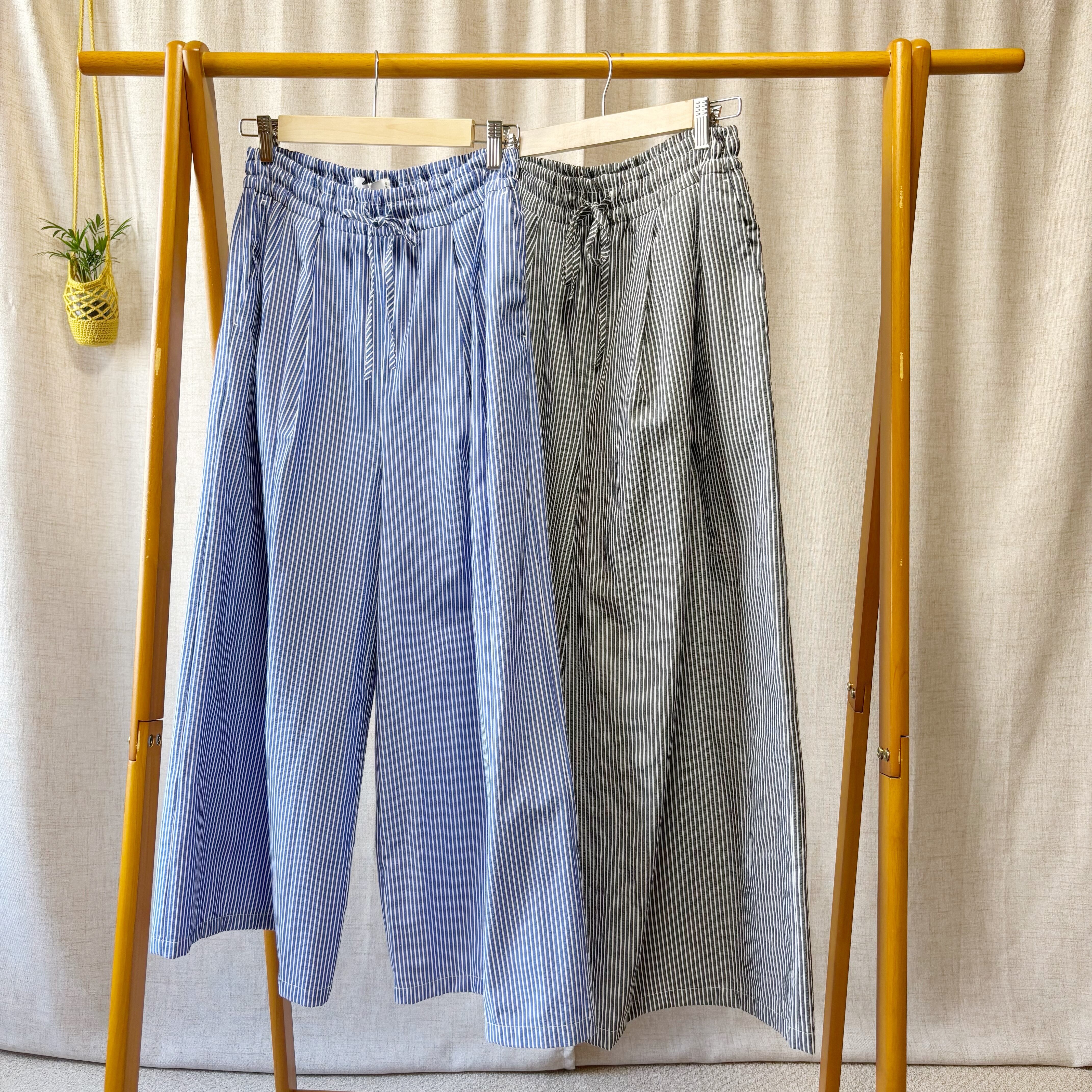 サッカーストライプ素材のタックワイドパンツ。軽やかで上品に見える一本。