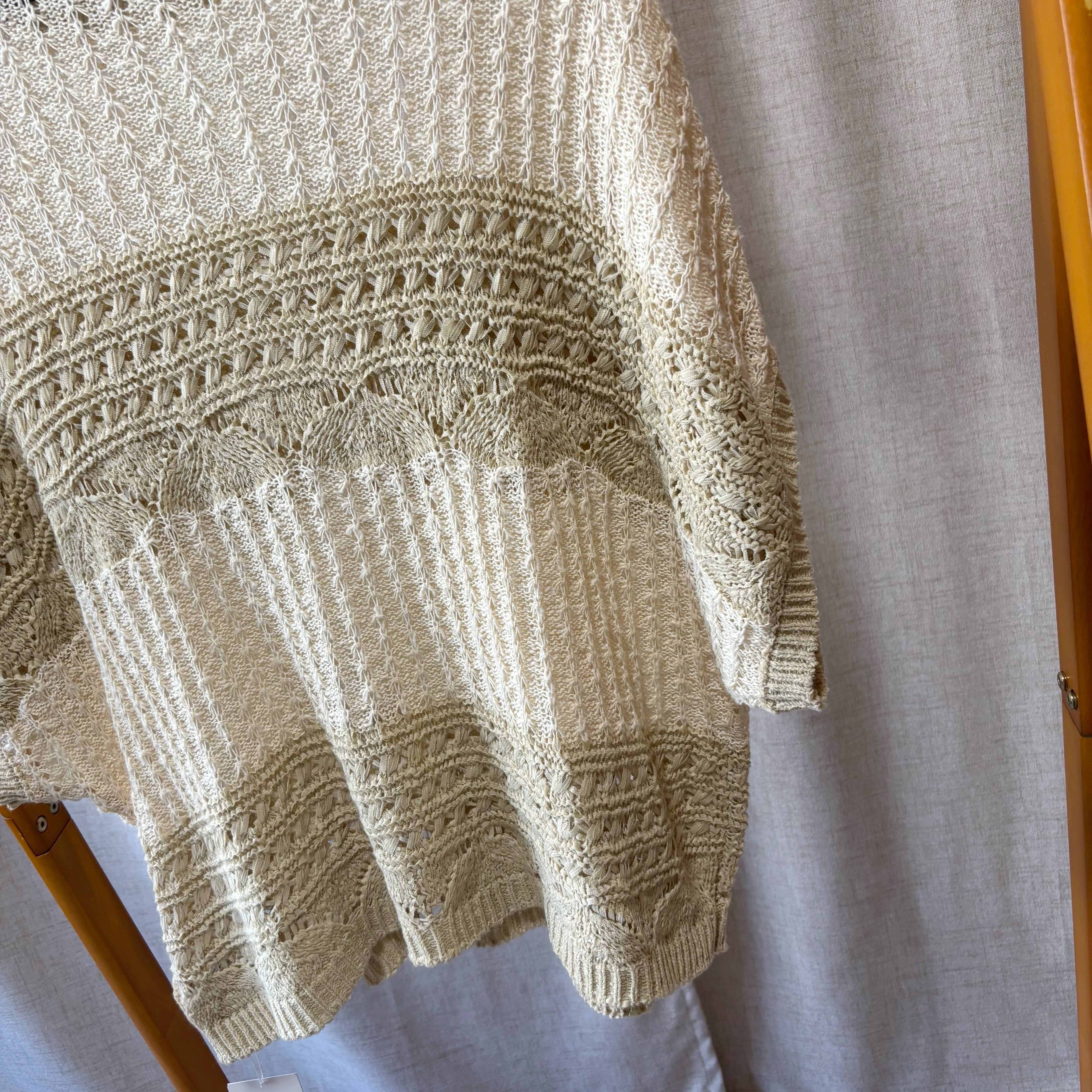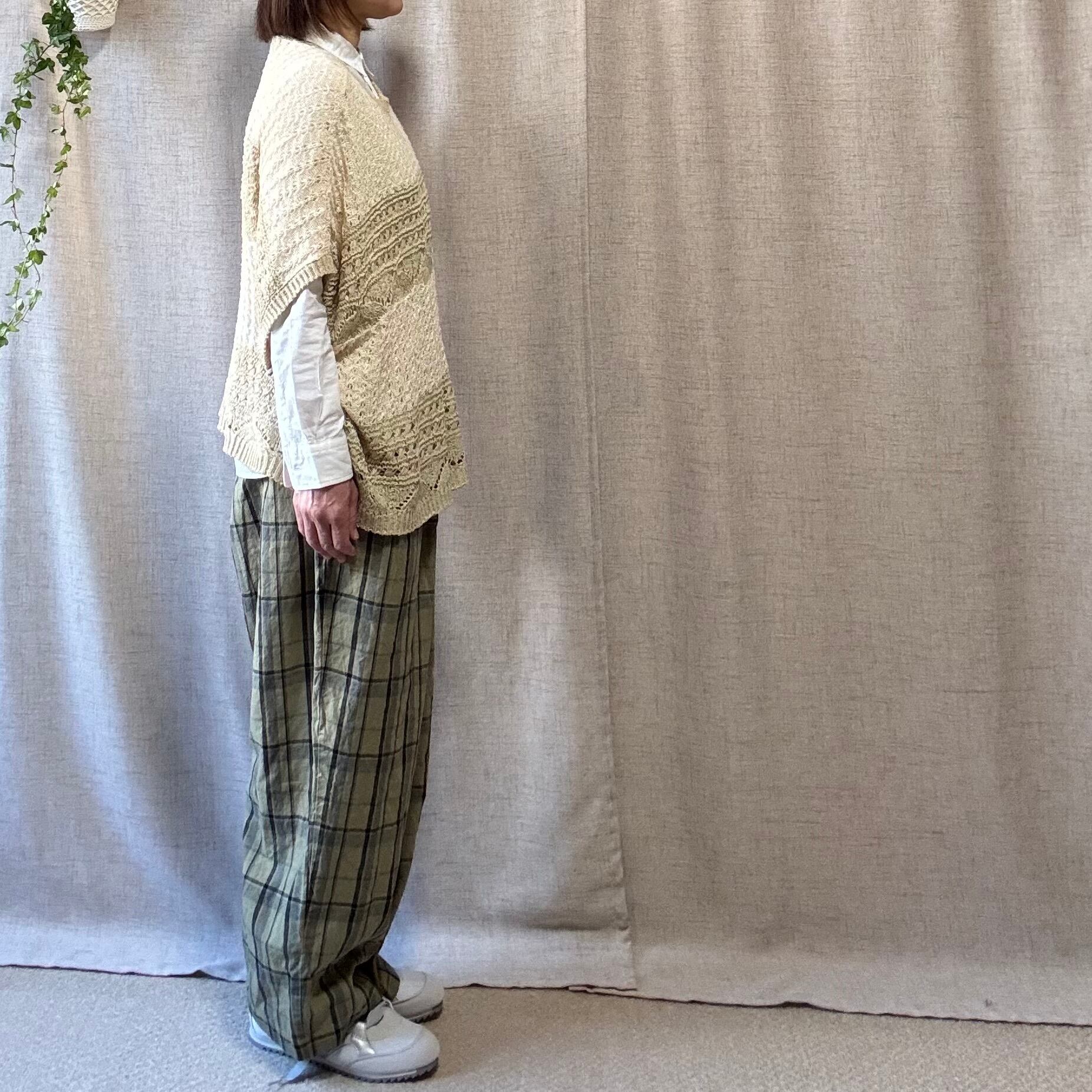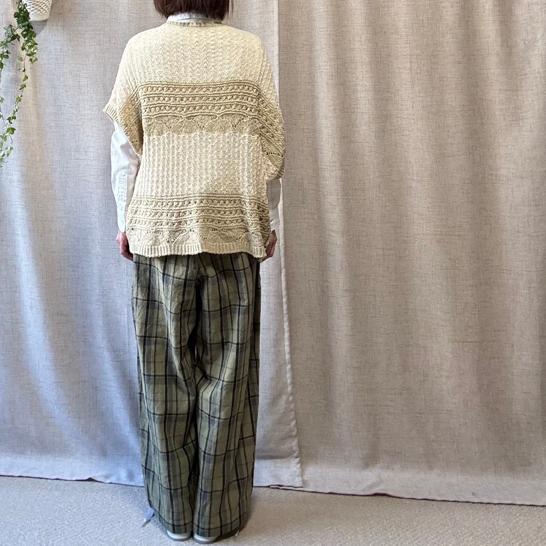 心地よいクロシェ風編みが特徴の、2色糸で丁寧に編み上げたゆったりとしたベスト。