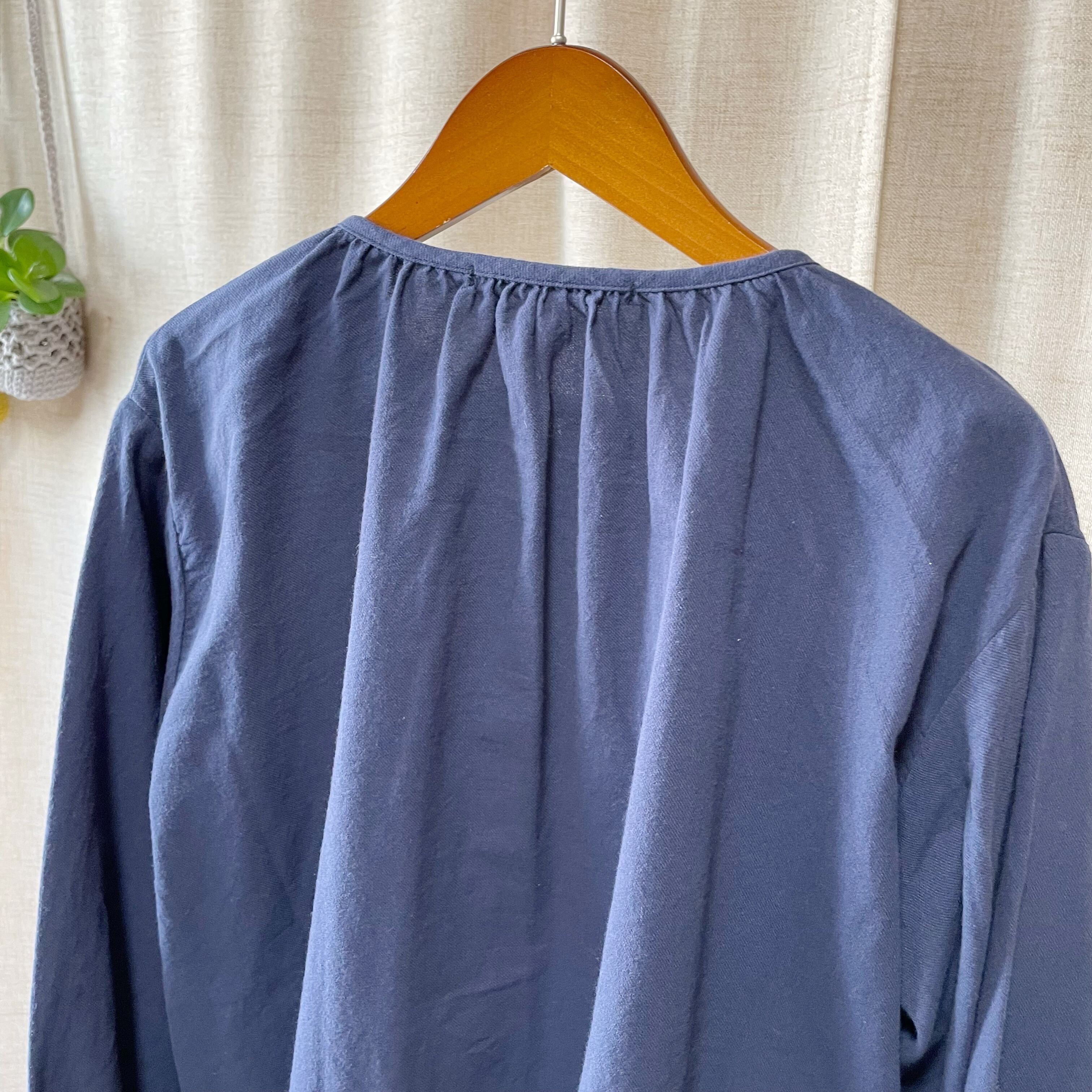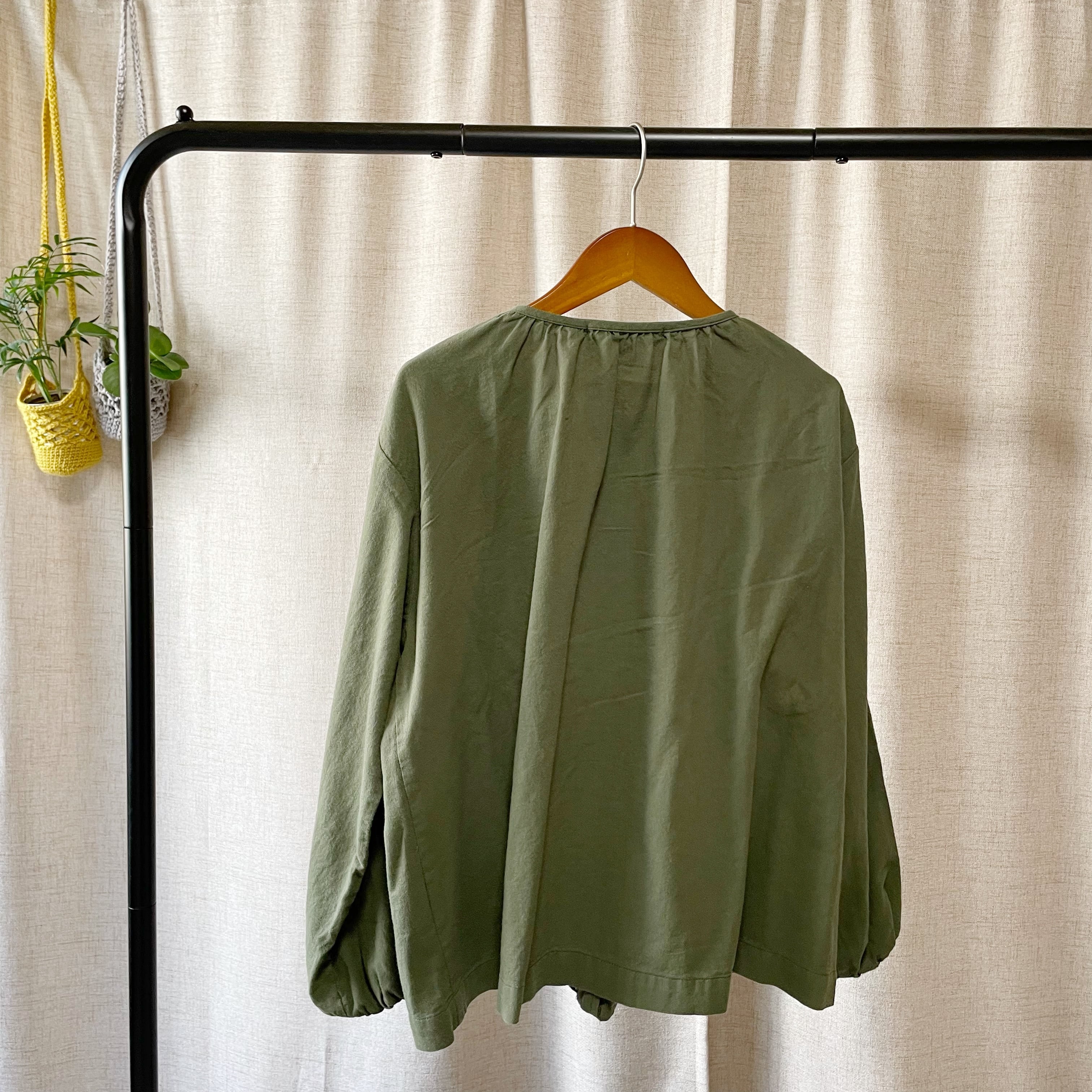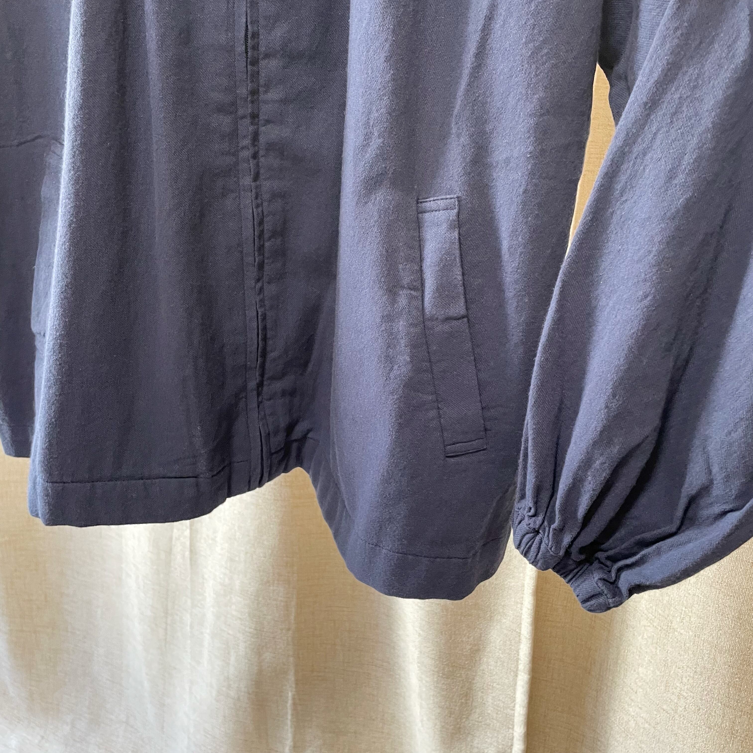 ノーカラータイプで、首もとにあしらったギャザーと袖口にほどこしたゴムがポイント。