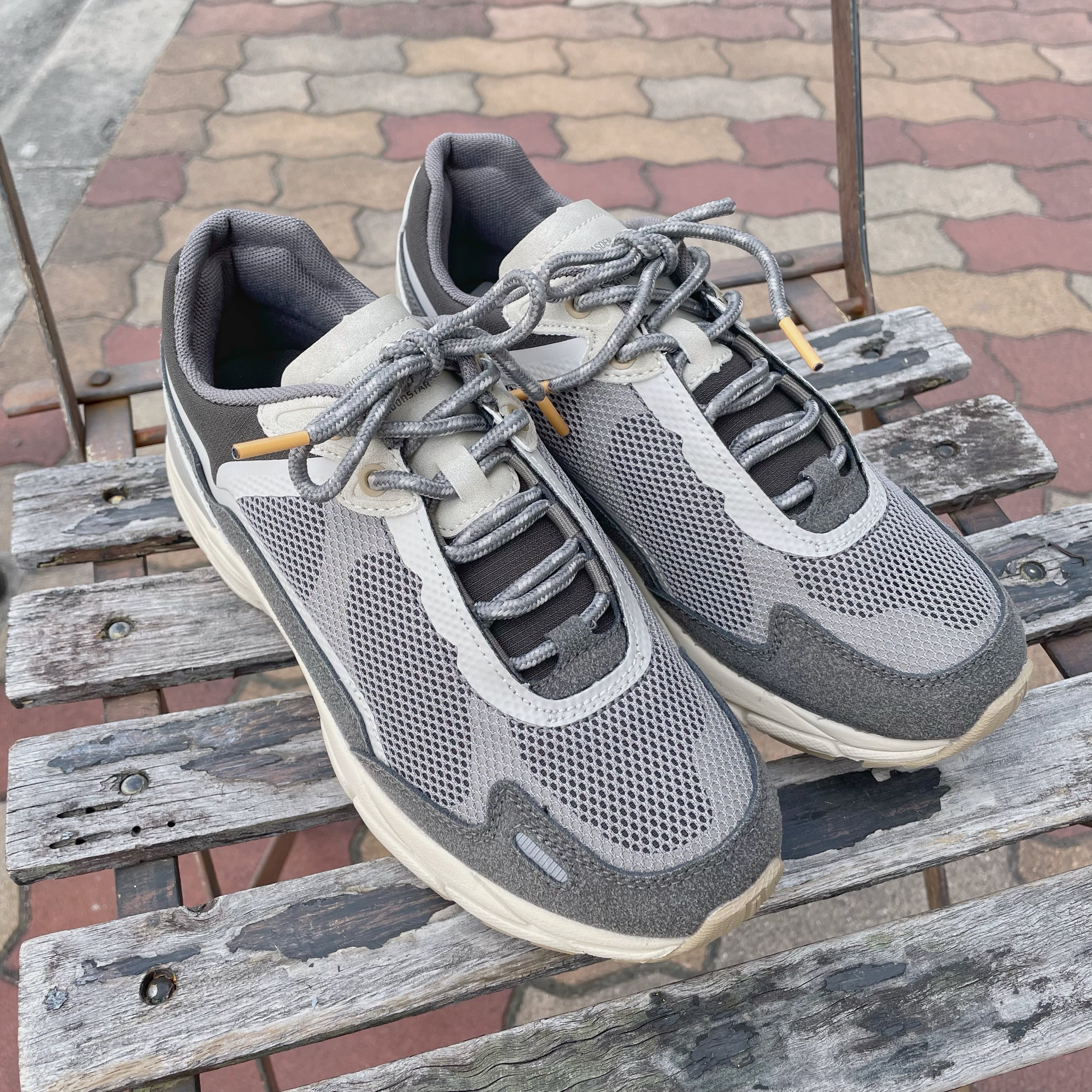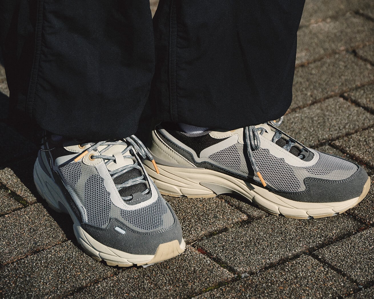 学生靴の丈夫さを引き継ぎながら、ミニマルな佇まいに。耐久性を考慮した素材をベースにアッパーを構成。屈曲部の重なりを抑え、隠しサドルを搭載することで歩行時の足当たりや横ブレに配慮した設計に。ソールユニットは、衝撃吸収に優れたミッドソールと防滑ラバーを配置したアウトソールで構成し、さまざまな路面で安定したグリップ力を発揮。スマートな佇まいと質実剛健さを兼ね備えたジョグタイプ。