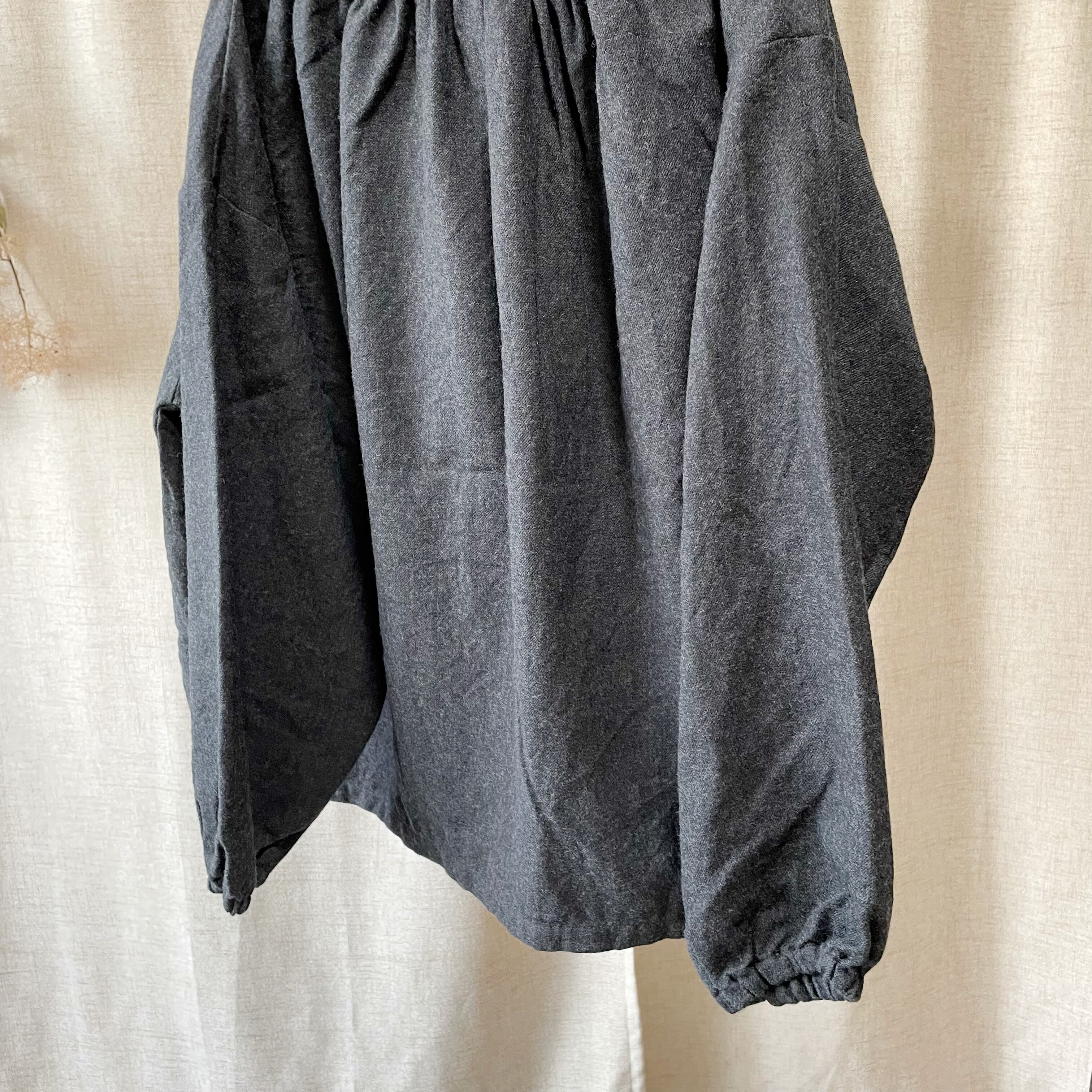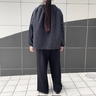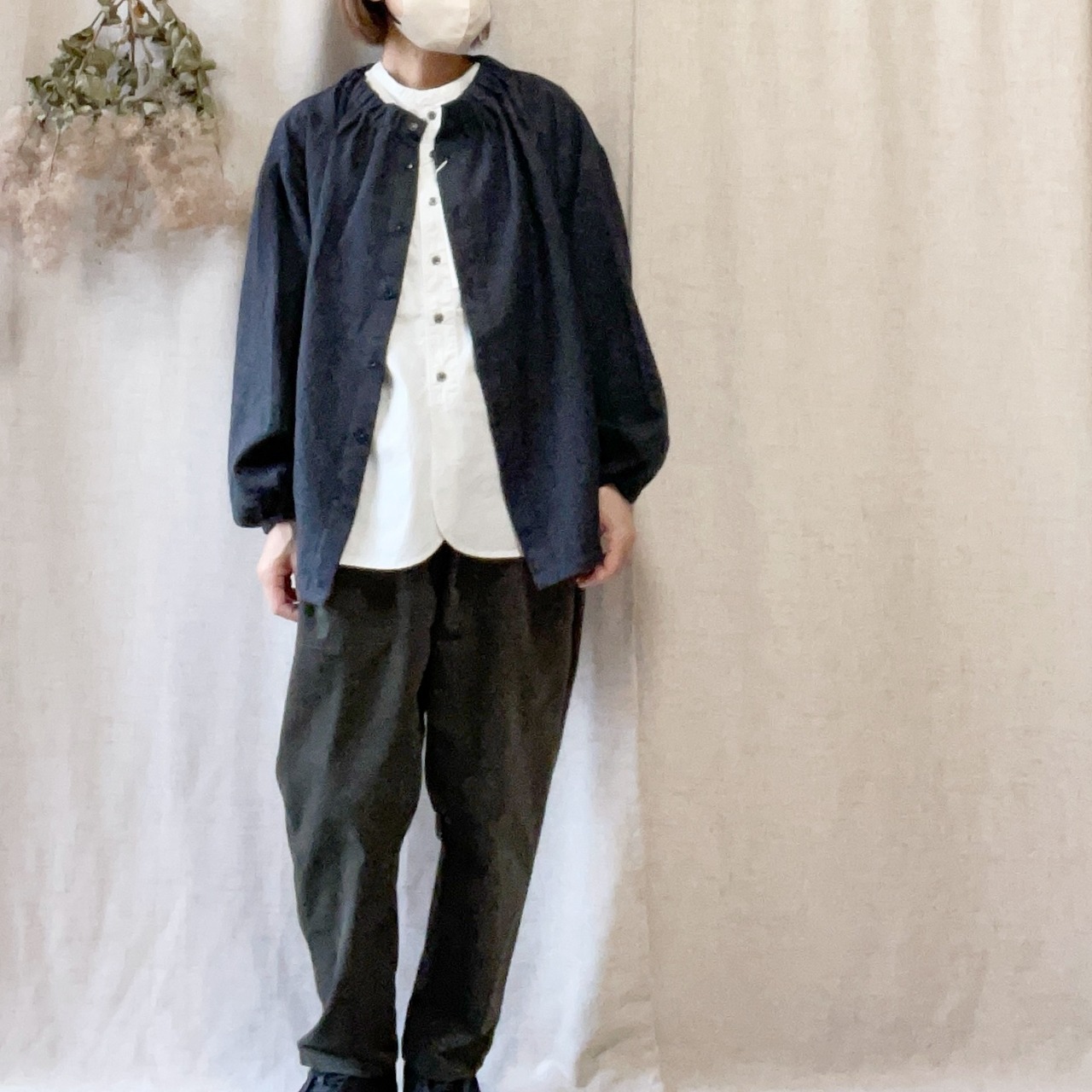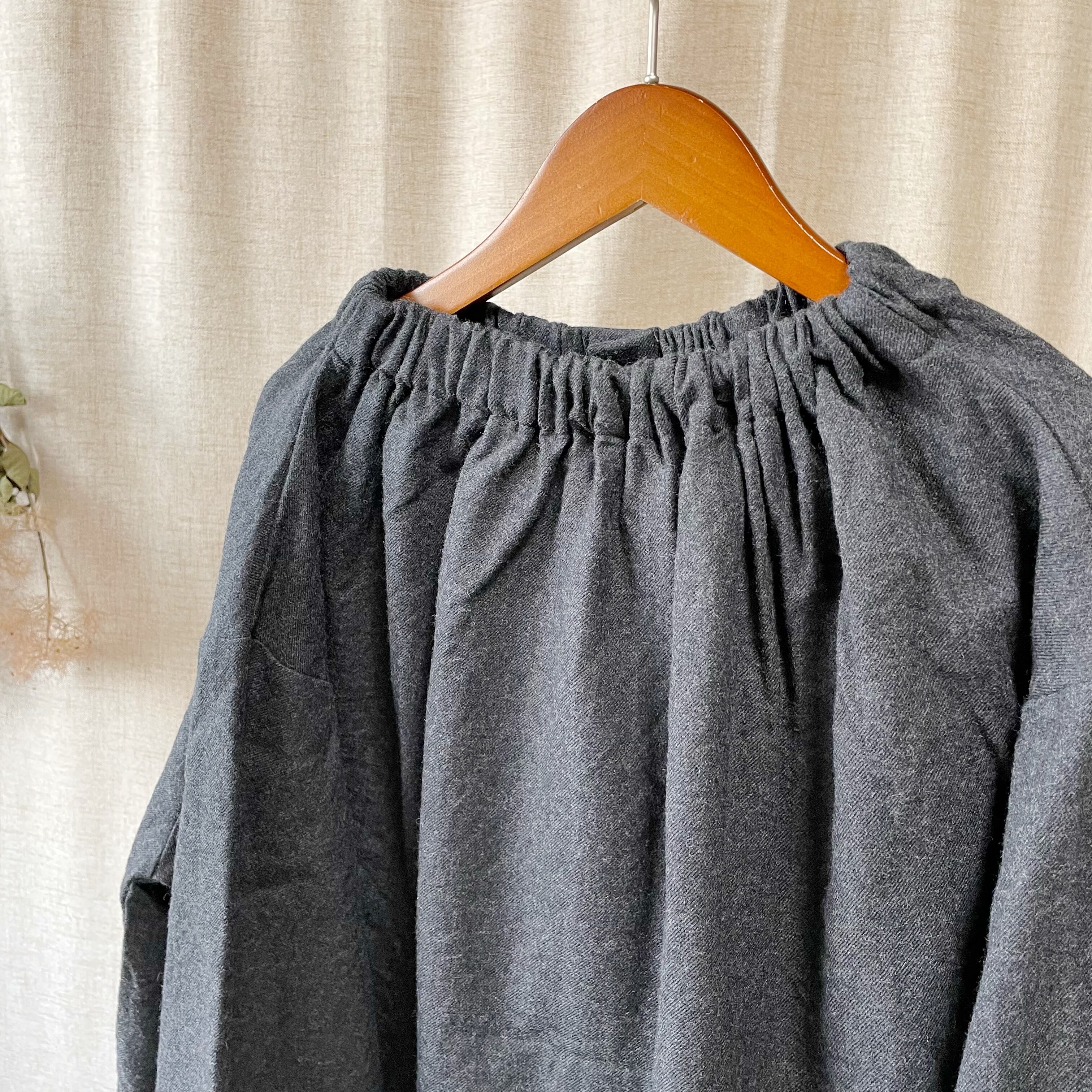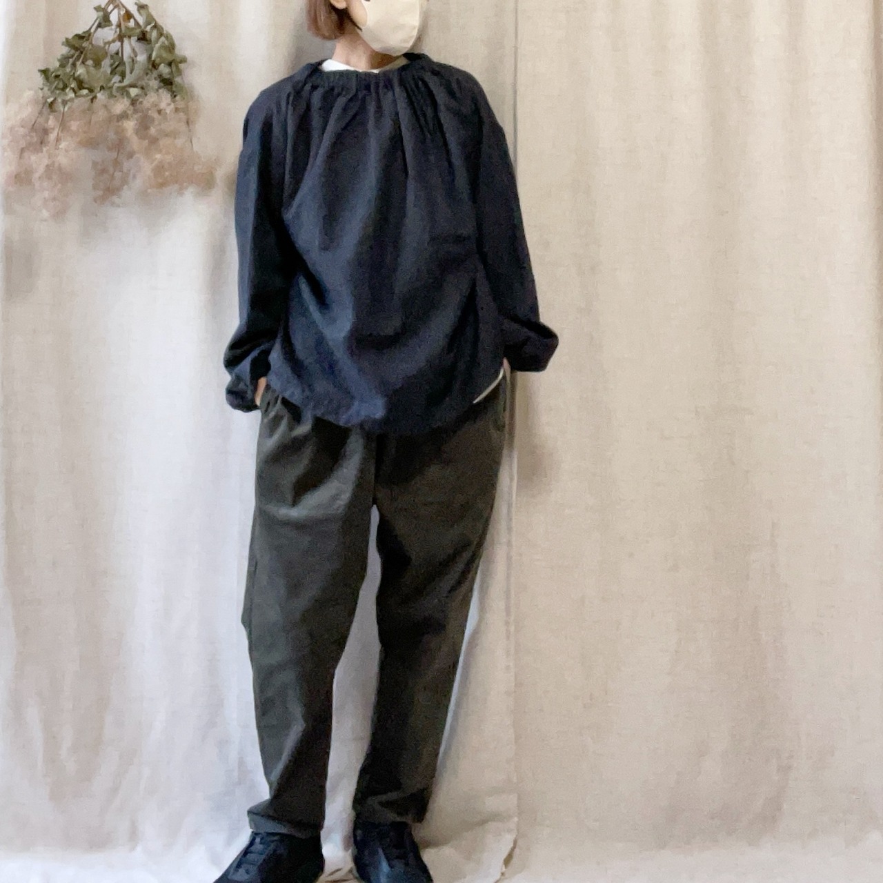 首元と袖口のゴムギャザーが作るシルエットが可愛く目を惹きます。
