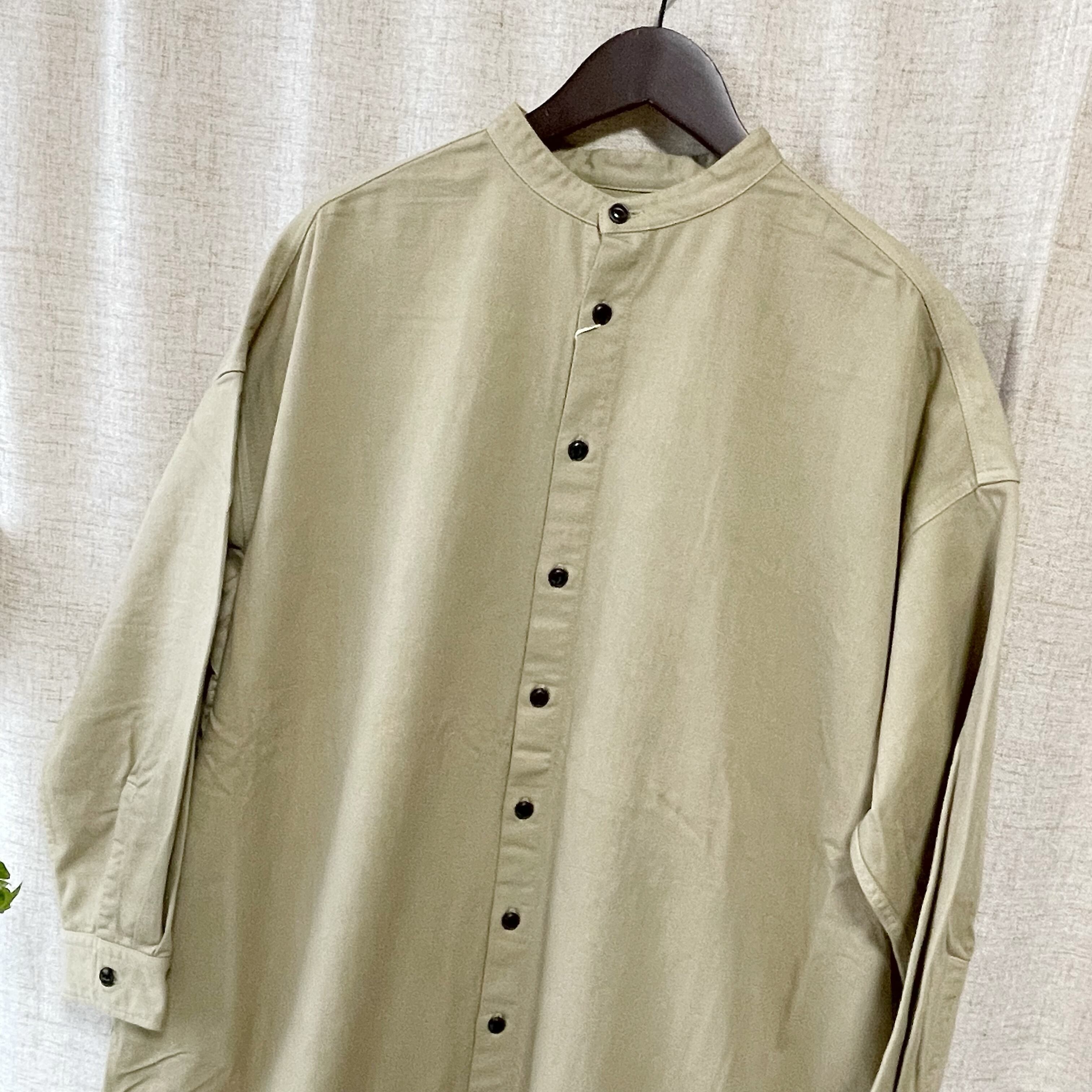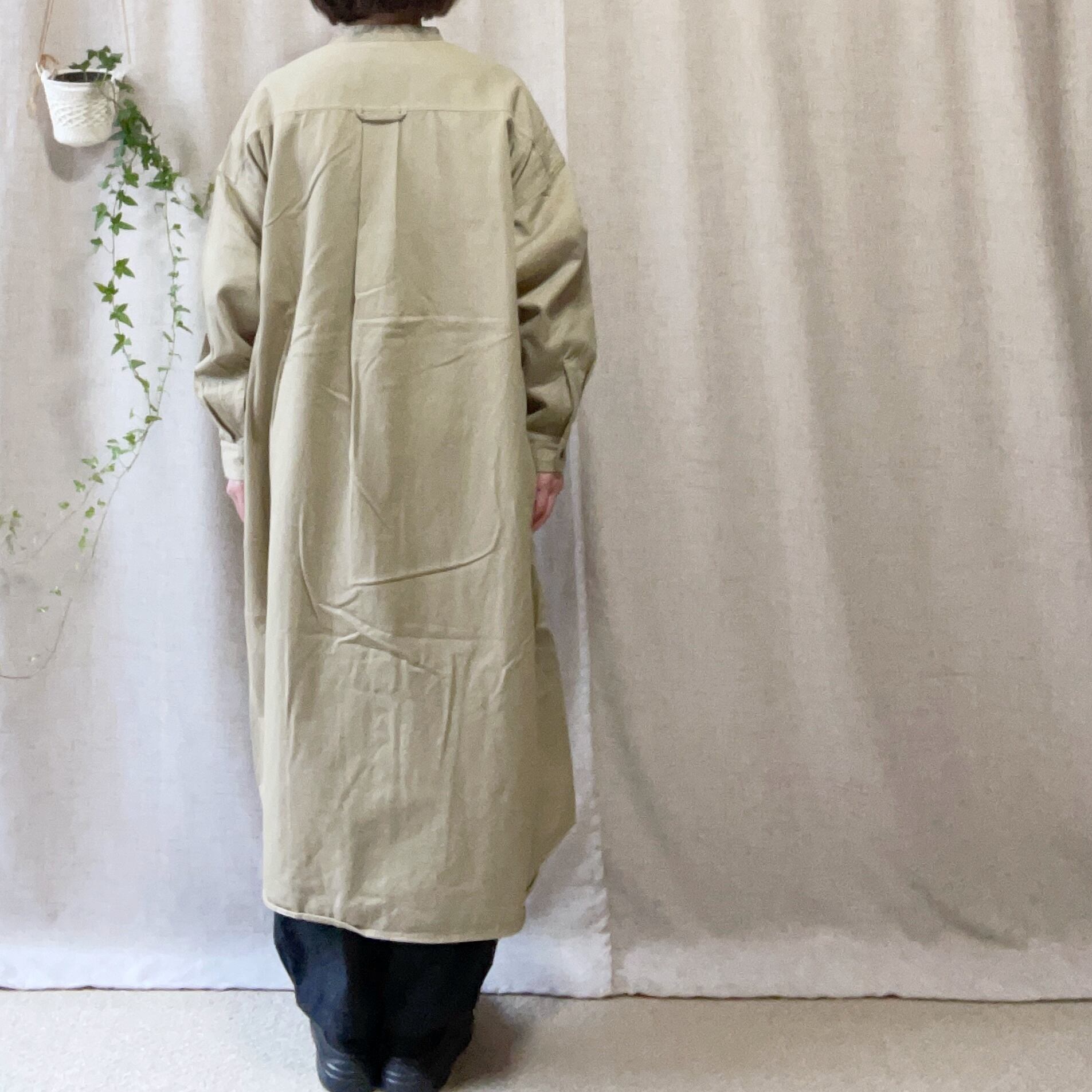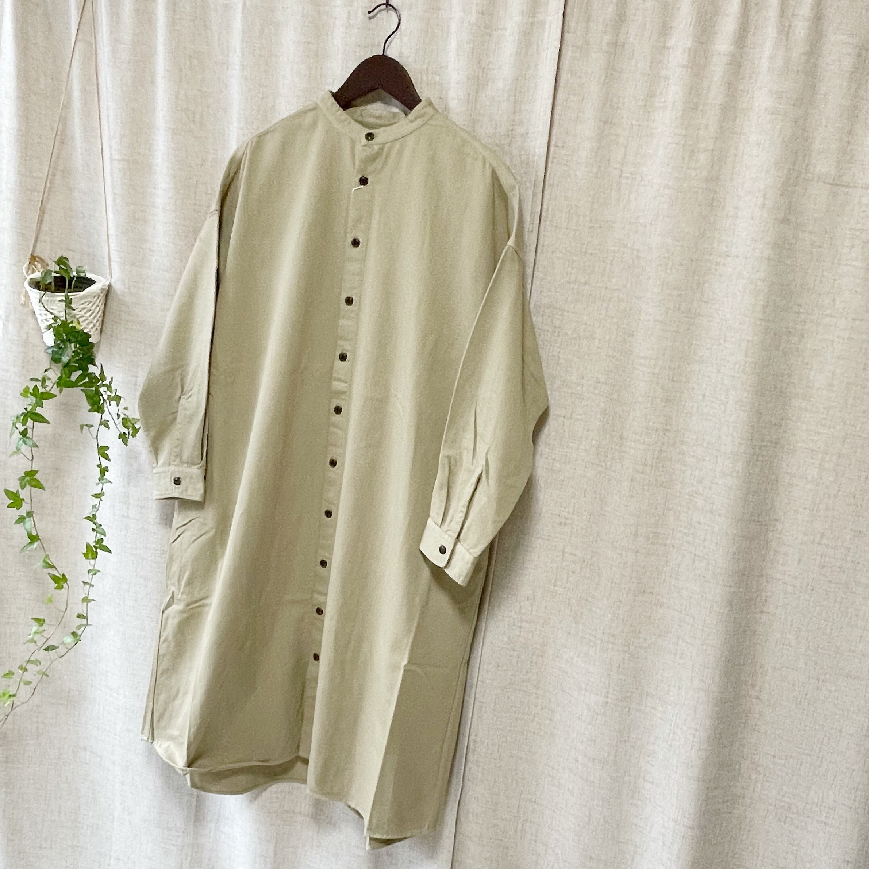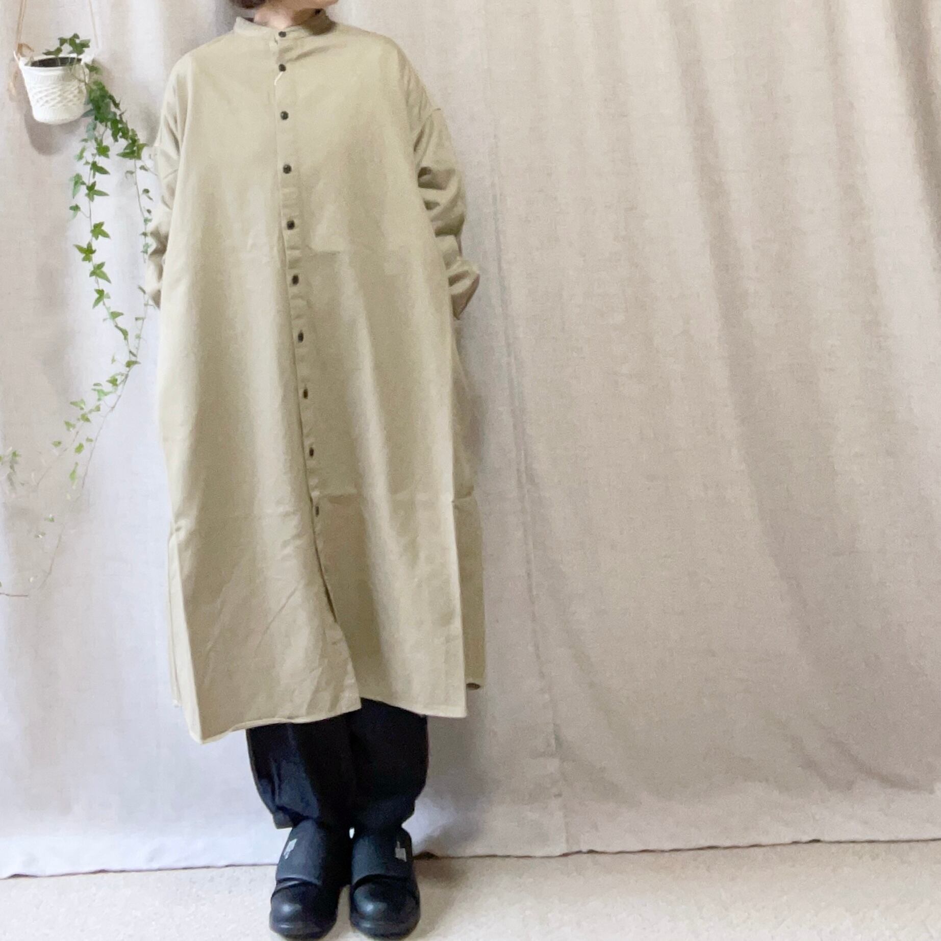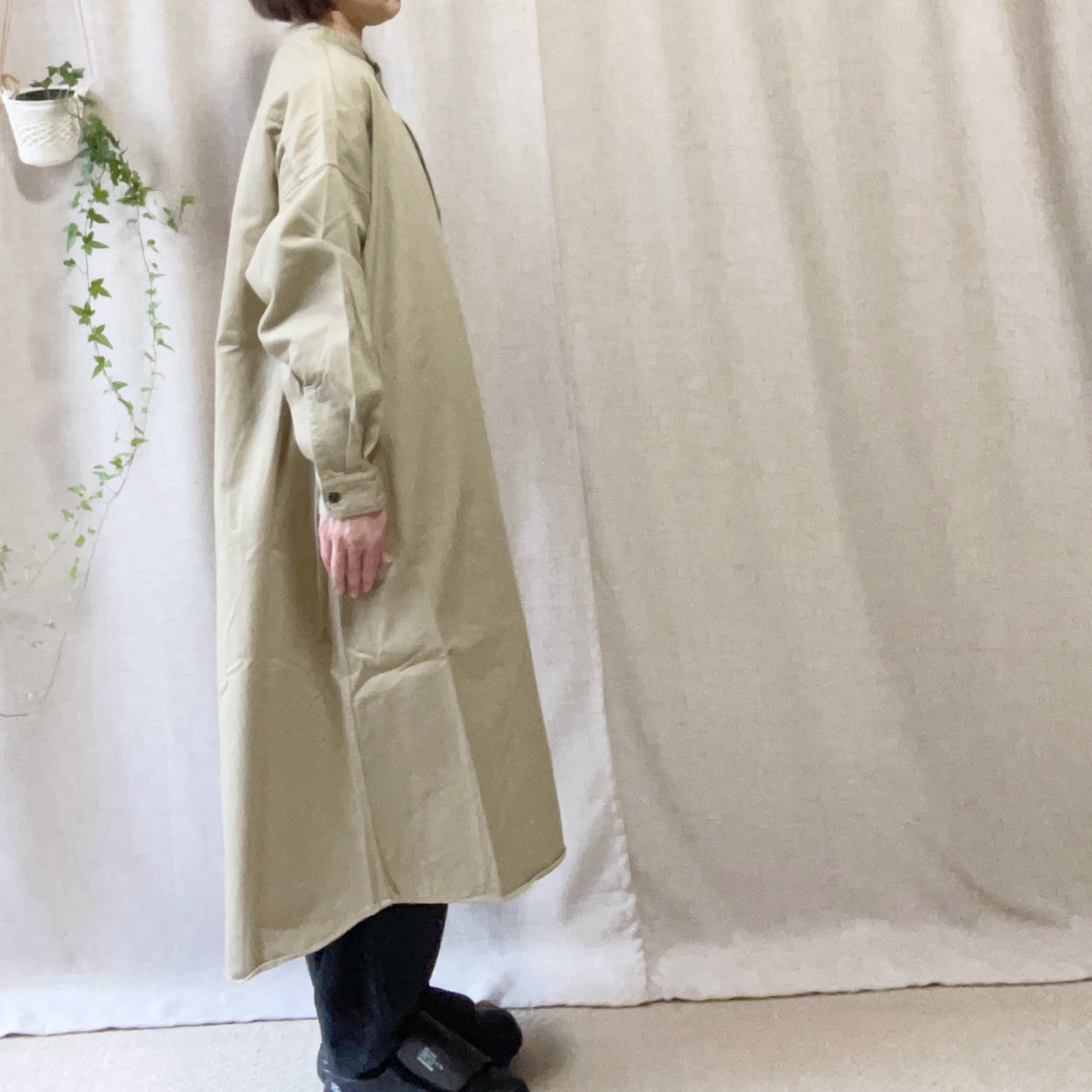 柔らかなソフトカツラギ素材で仕立てられたスタンドカラーワイドシャツワンピース。