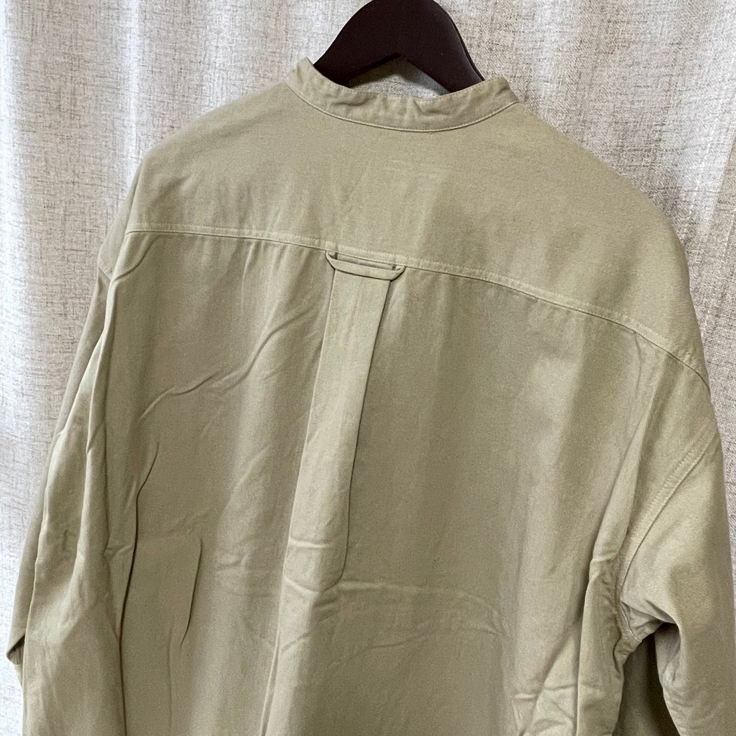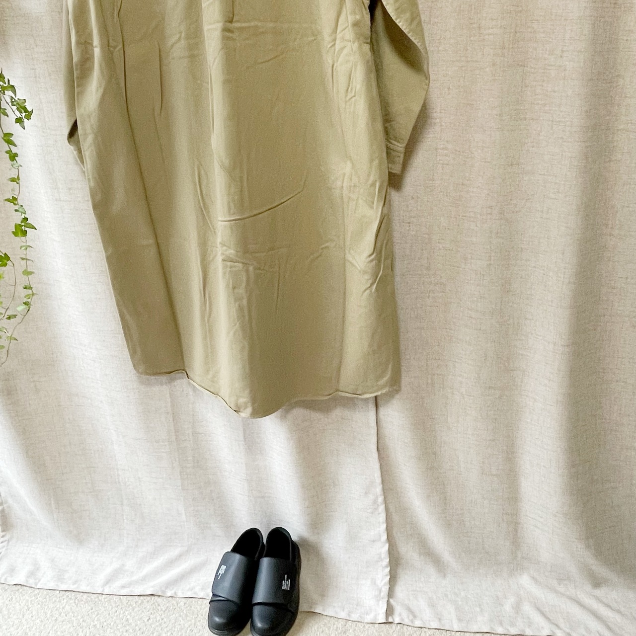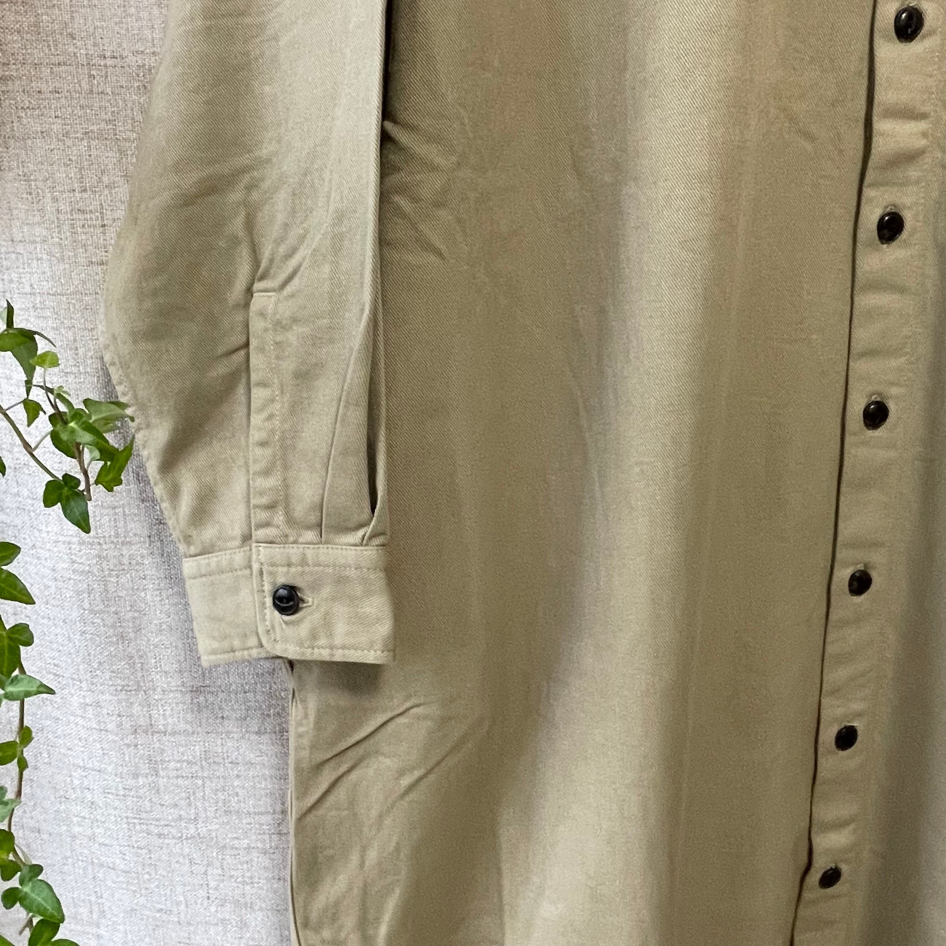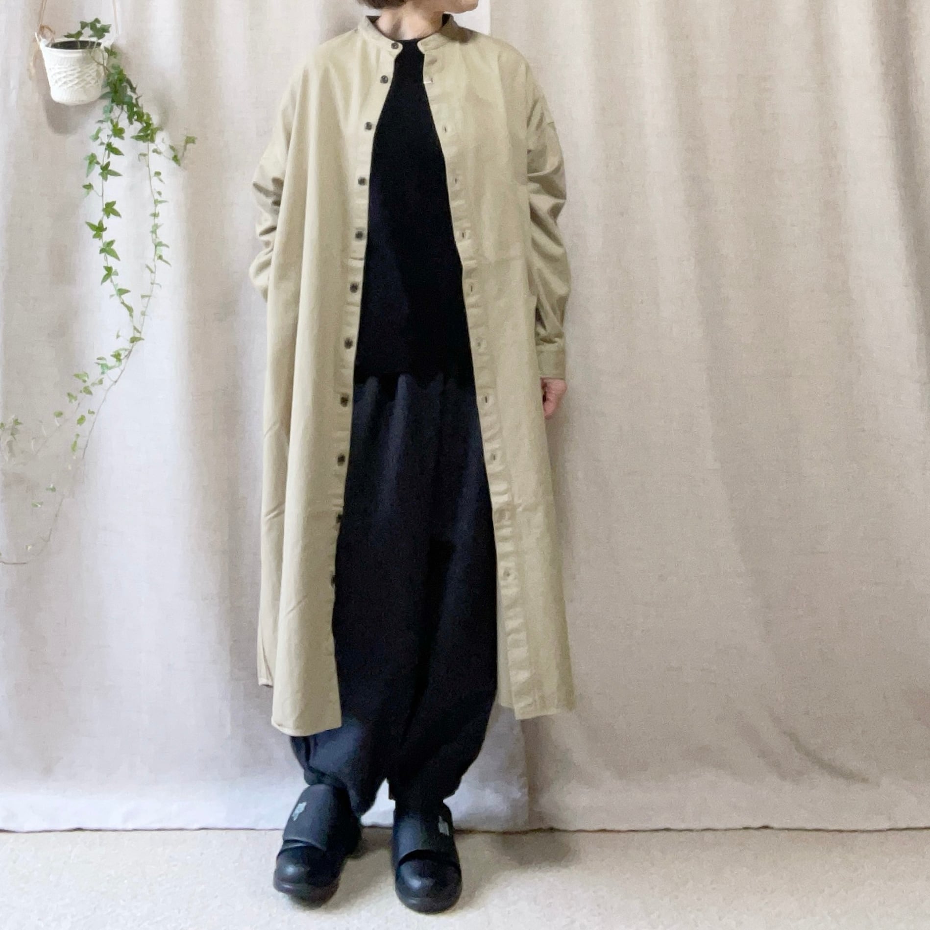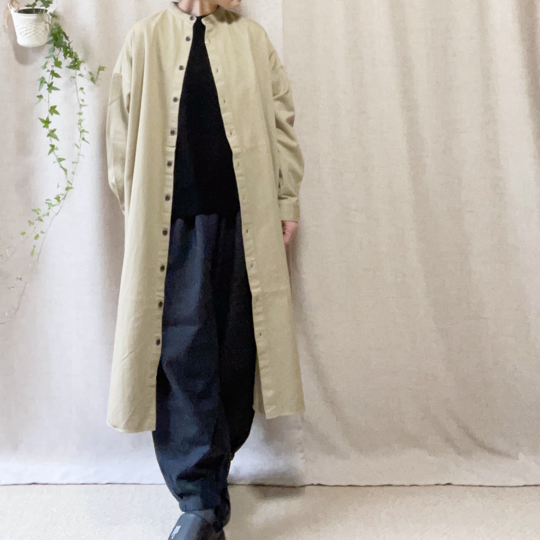 柔らかなソフトカツラギ素材で仕立てられたスタンドカラーワイドシャツワンピース。